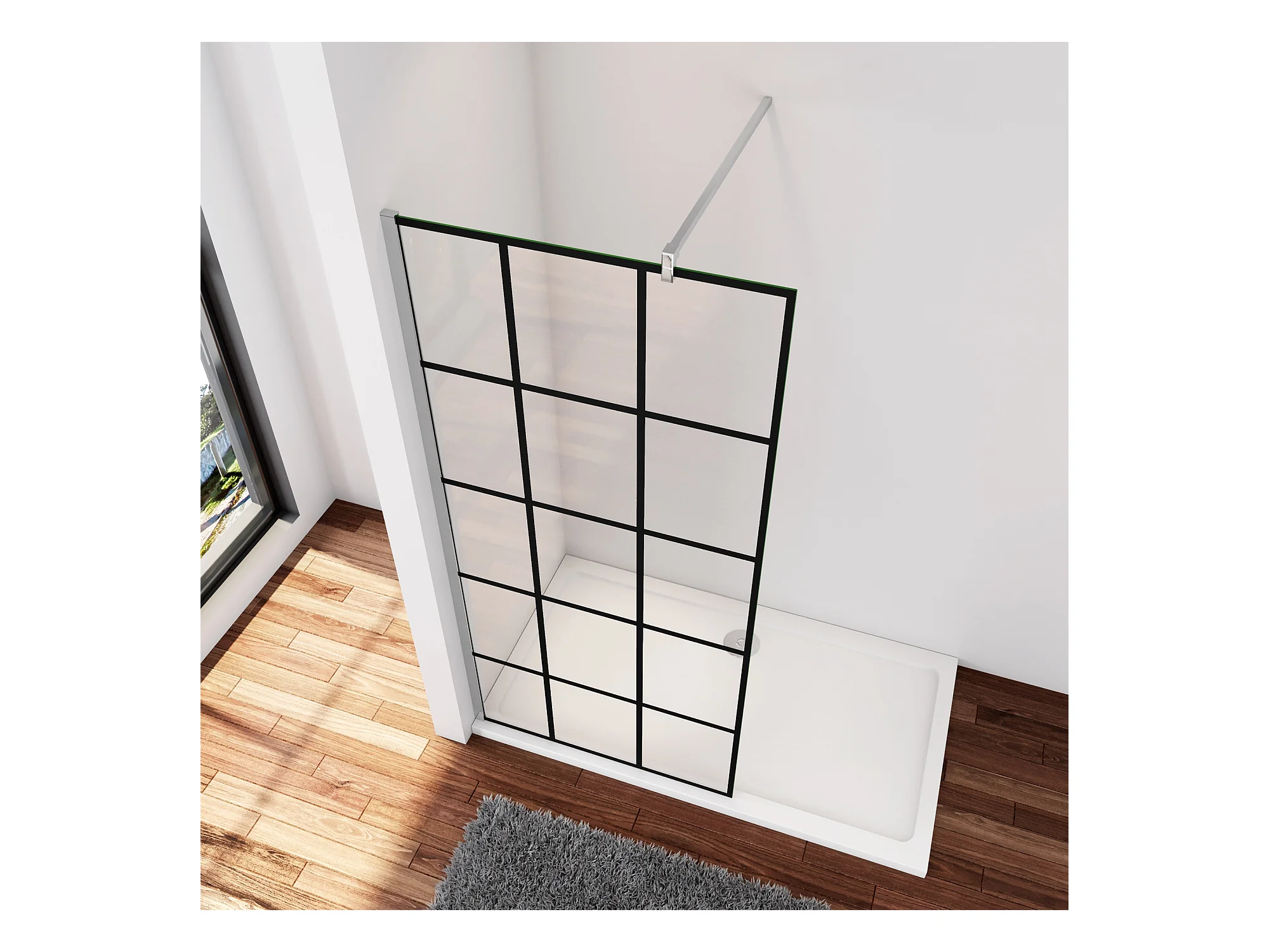 Douchewand-Inloopdouche 100x200cm met mat Zwart kader en raster 8mm NANO EasyClean veiligheidsglas F-Form 90cm Stabilisatiestang