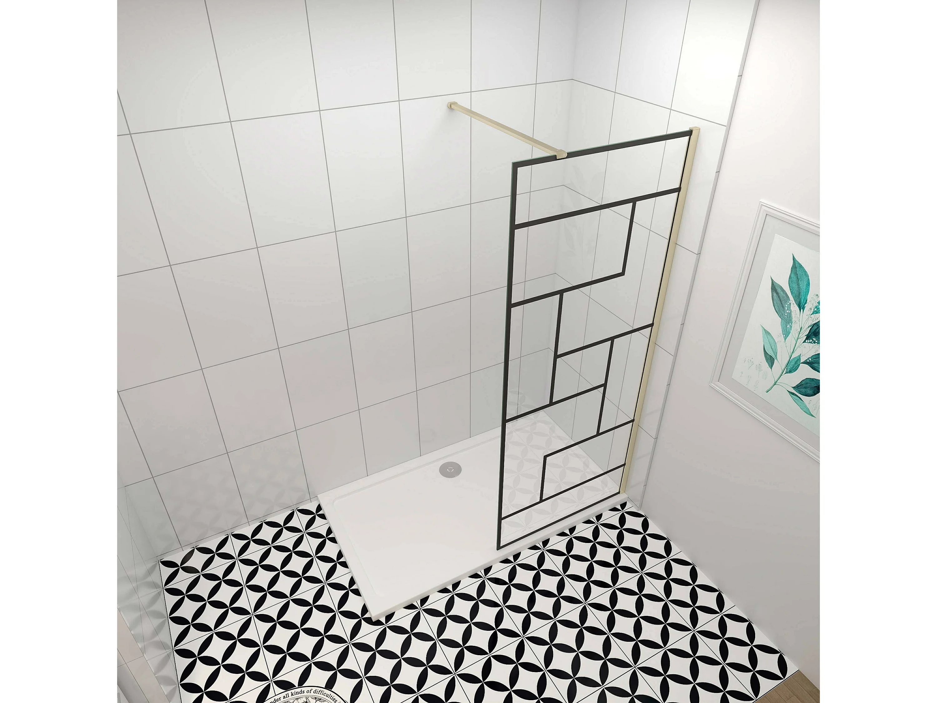 Douchewand-Inloopdouche 120x200cm 8mm NANO Easyclean zwart raster gezeefdrukt gehard glas gouden profiel 90cm stabilisatiestang(kan worden gesneden)