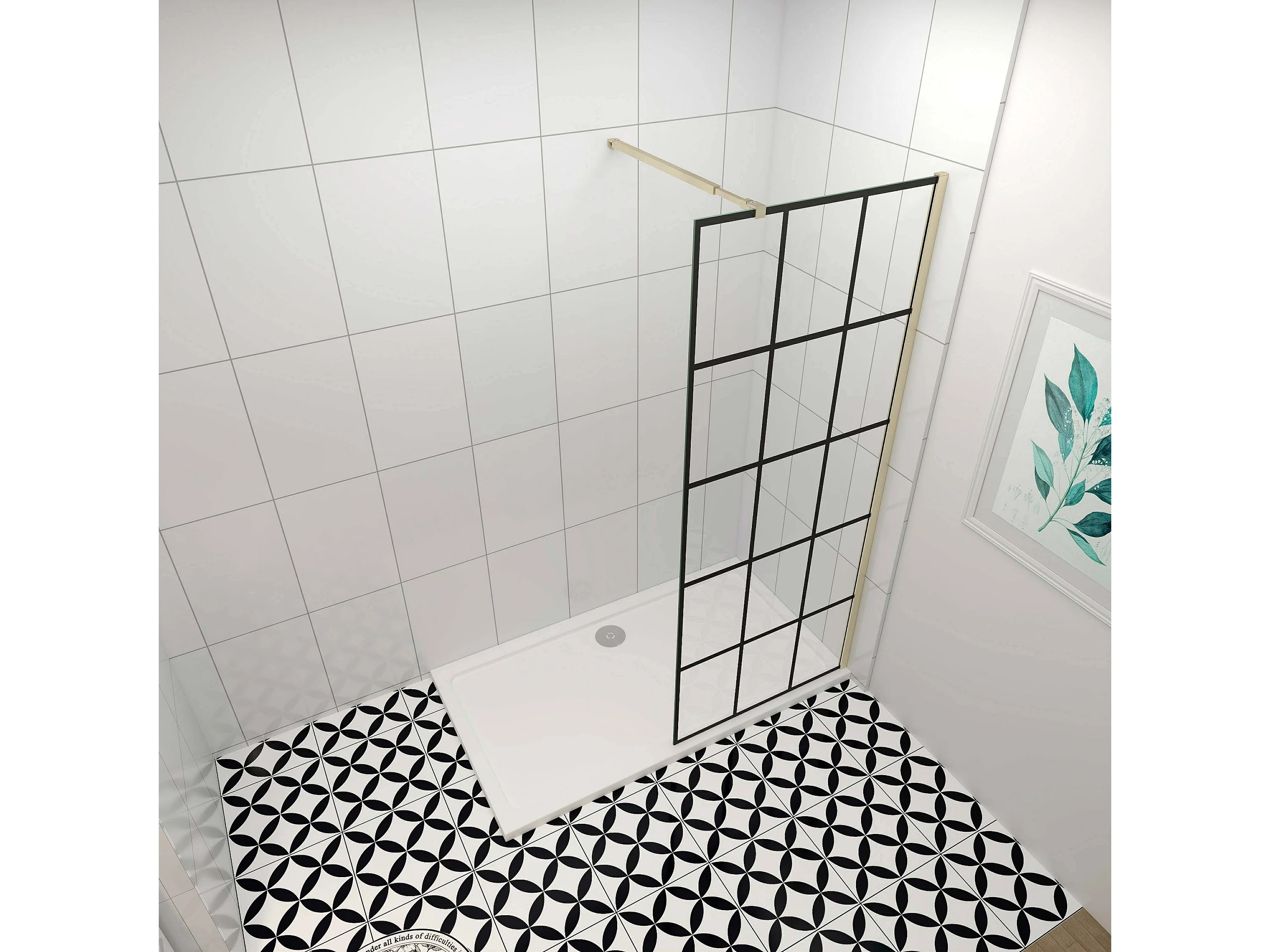Douchewand-Inloopdouche 120x200cm met mat Zwart kader en raster 8mm NANO EasyClean veiligheidsglas gouden profiel Stabilisatiestang 73-120 cm
