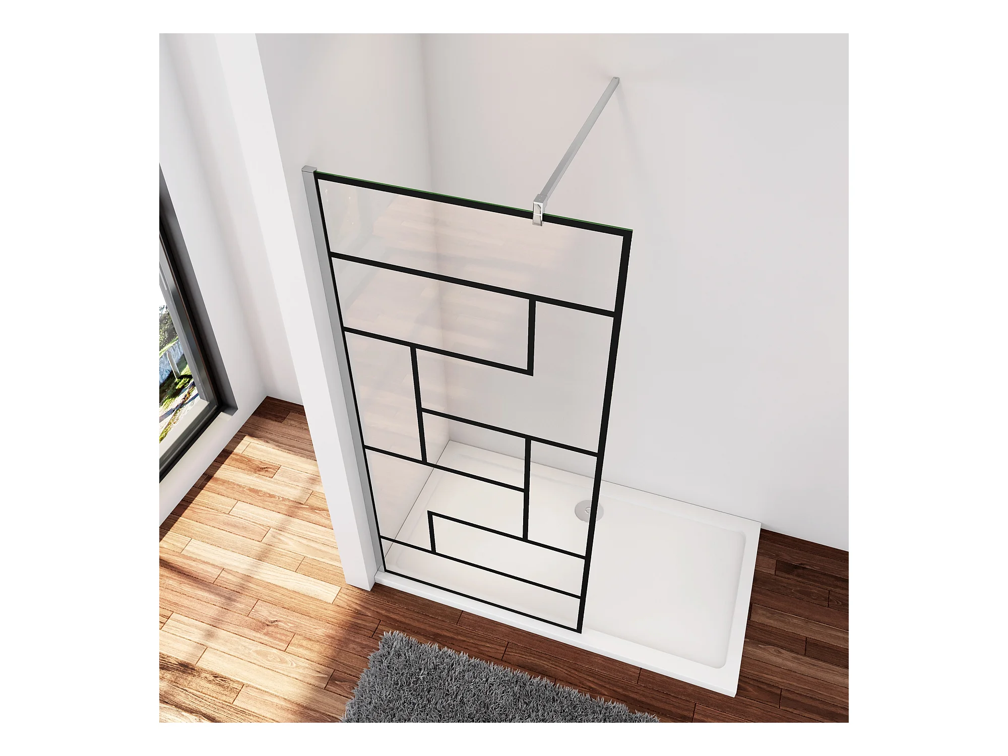Douchewand-Inloopdouche 140x200cm 8mm NANO Easyclean zwart raster gezeefdrukt gehardglas glanzend chroom 90cm stabilisatiestang(kan worden gesneden).