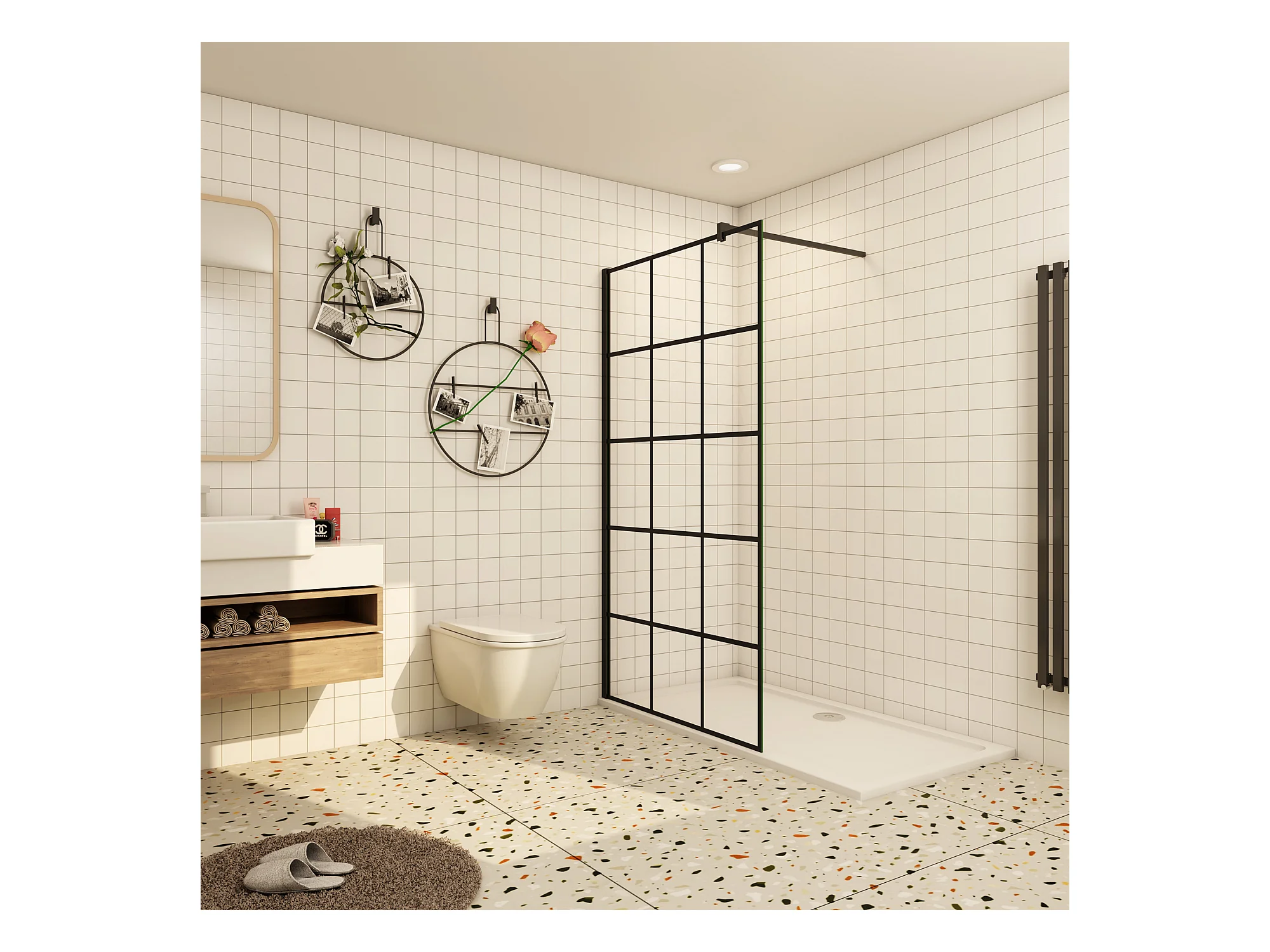 140x200cm inloopdouche-douchecabine,8mm zwart raster gehard gezeefdrukt glas,easyclean,antikalk,stabilisatiestang 140cm (kan worden gesneden),mat zwart profiel