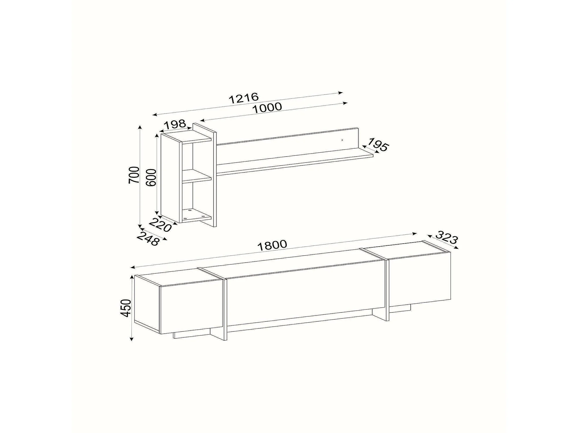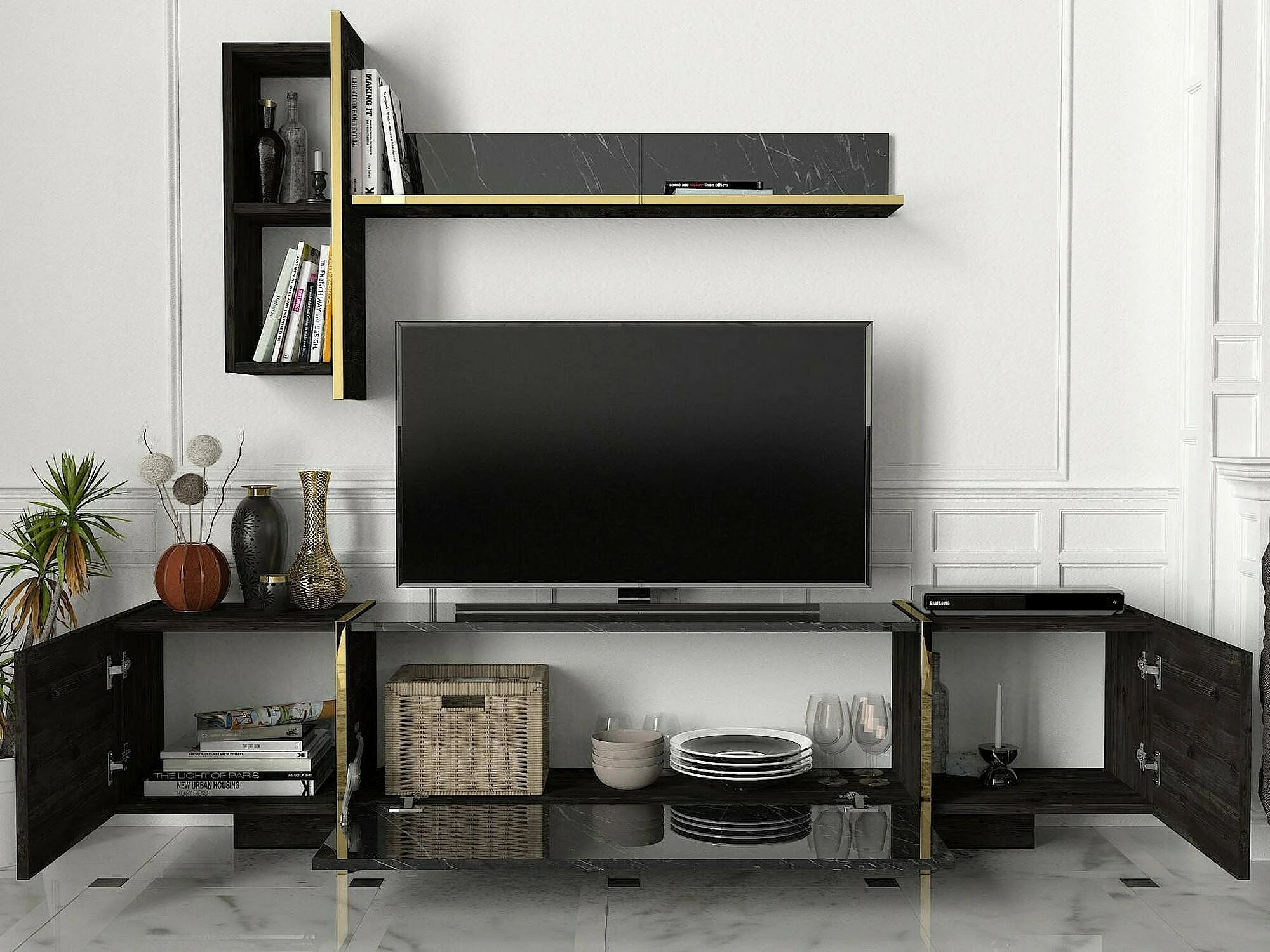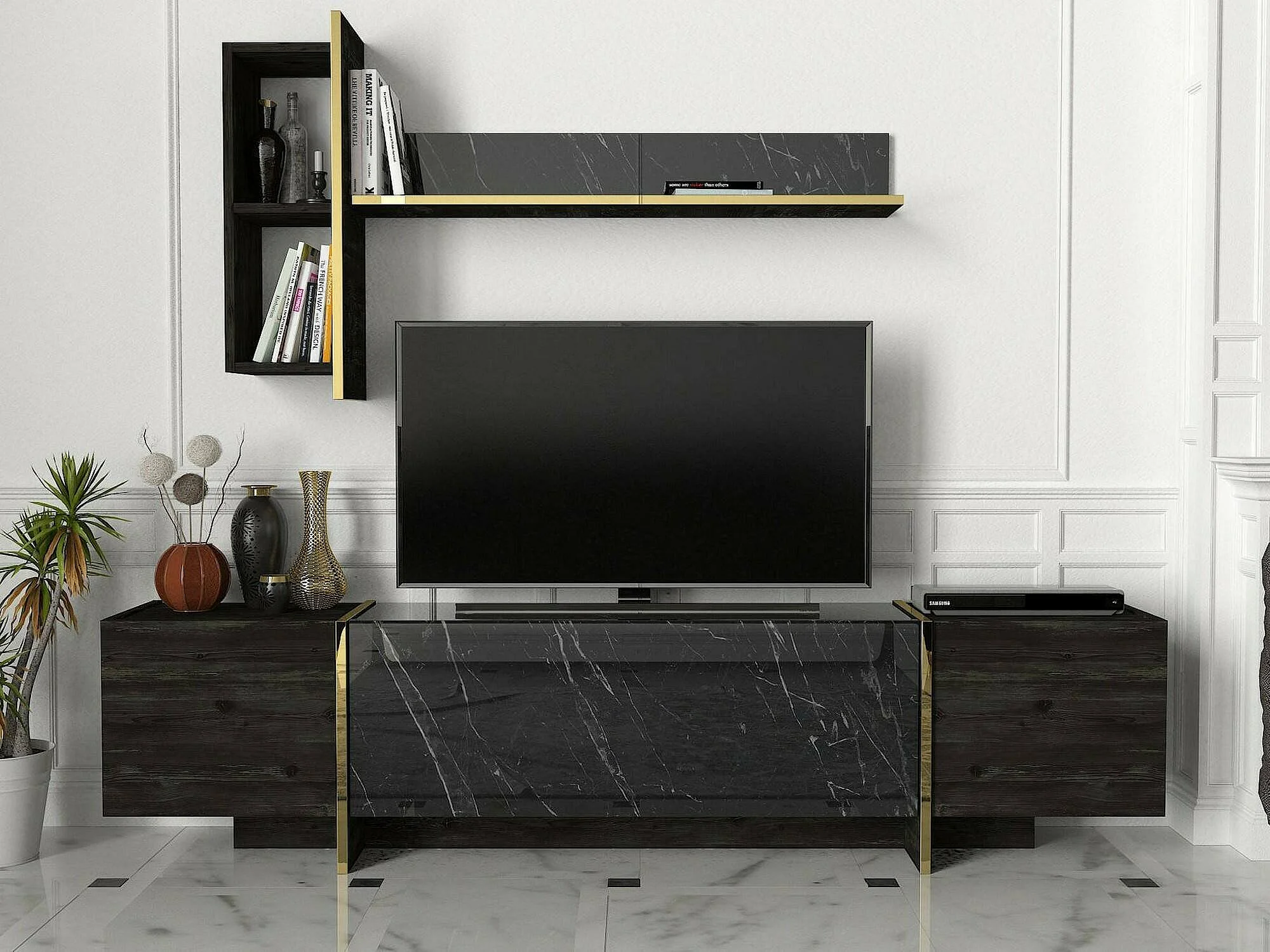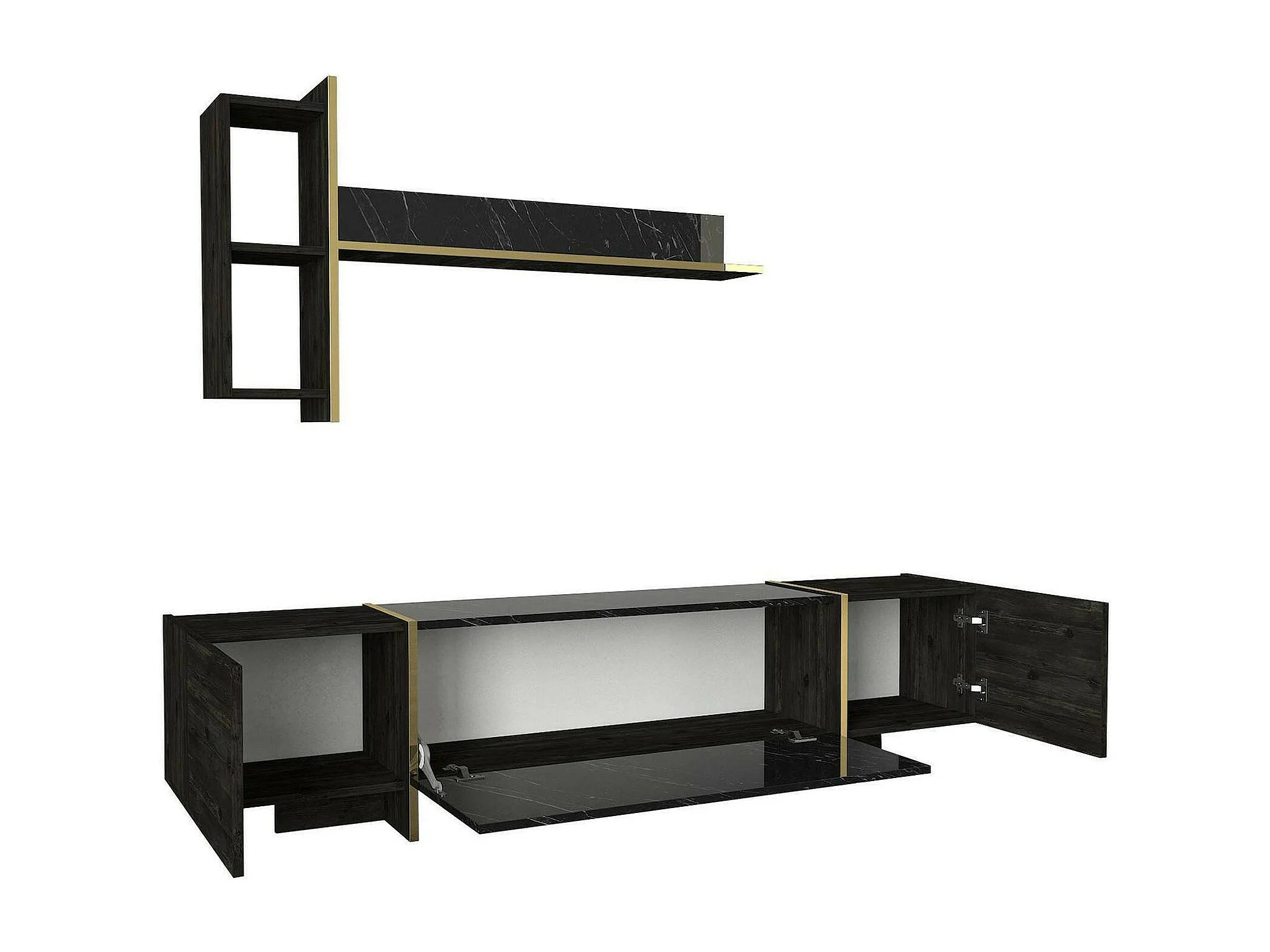 Dpascutt tv-meubel, woonkamermeubel, lage tv-meubel, wandstandaard, 180x32h45 cm, zwort en goud