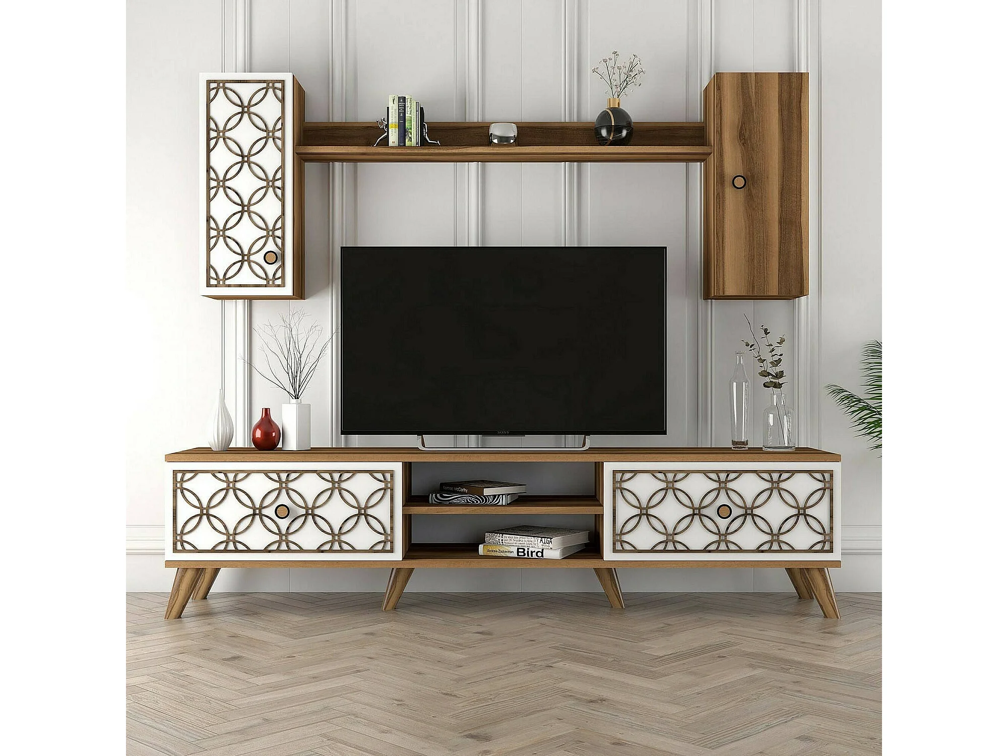 Dpinzaut tv-meubel, woonkamermeubel, laag tv-meubel, Muurstandaard, 180x35h44 cm, walnoot en wit
