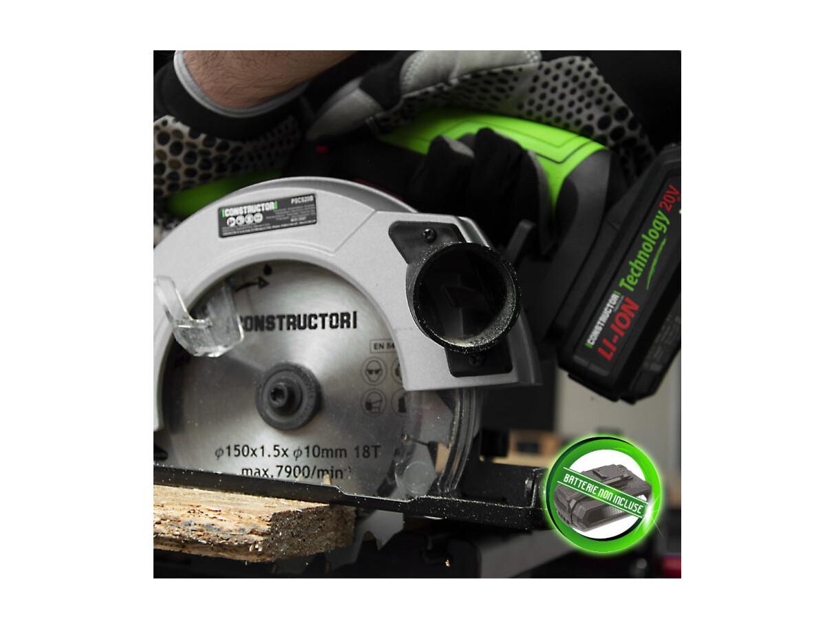 Fiche technique Article Scie circulaire sans fil max 20V - Sans batterie - CONSTRUCTOR Puissance 20V max Vitesse 4800 t/min Inclinaison 0-45° Diamètre lame 150mm (18 dents) Profondeur de coupe max 45mm Boite Livré en boite couleur sans batterie ni chargeur Poignée Soft grip