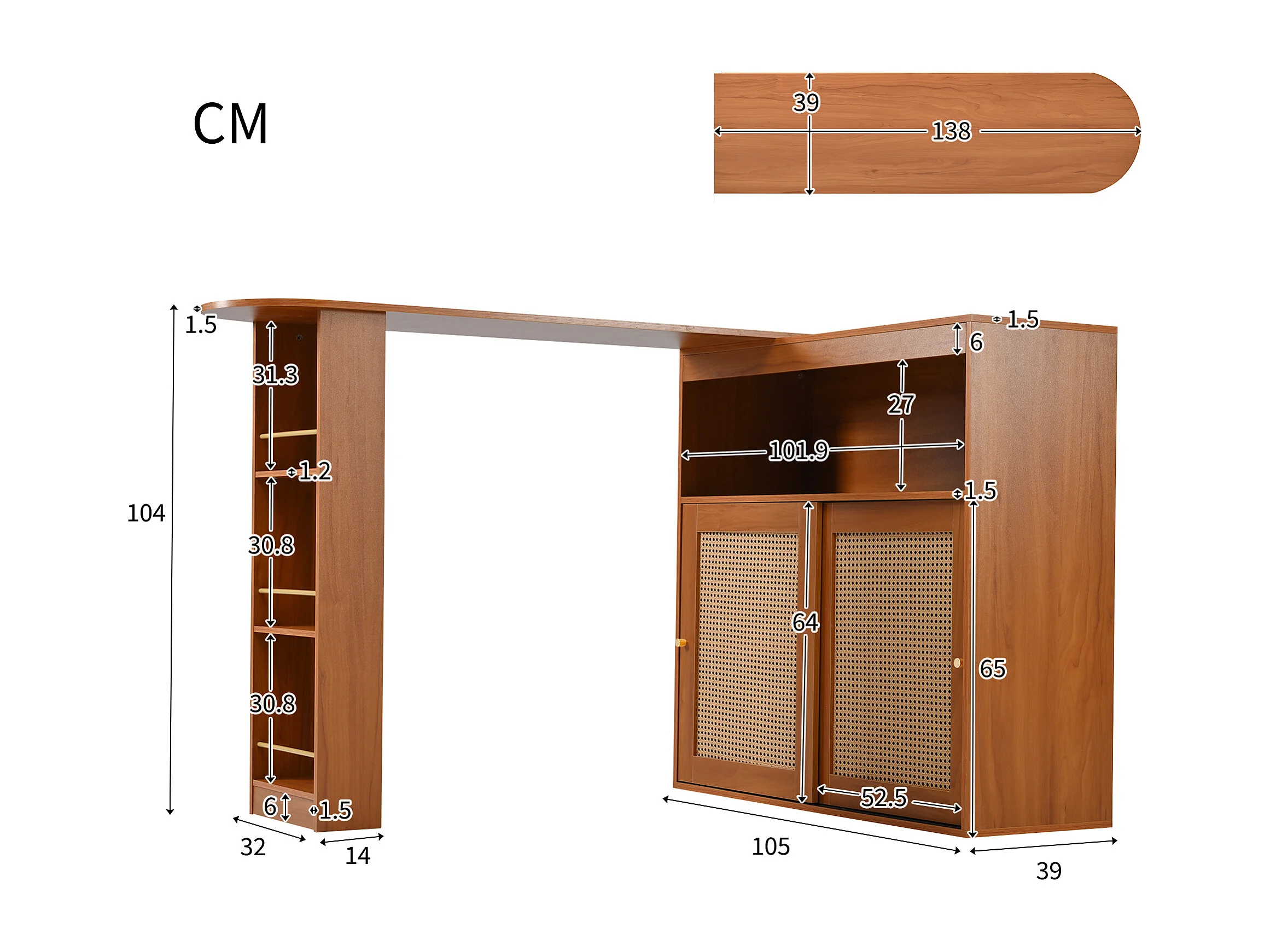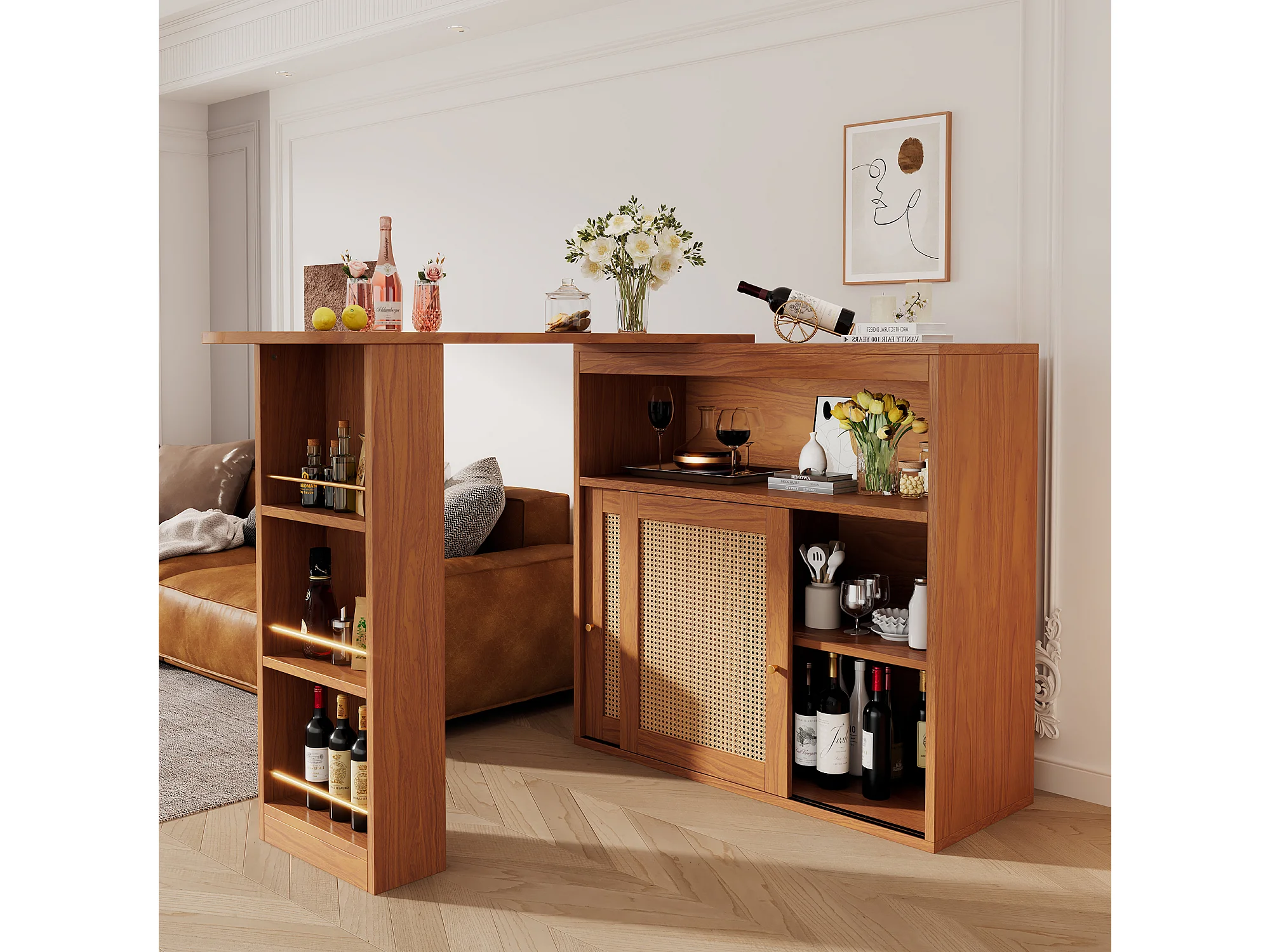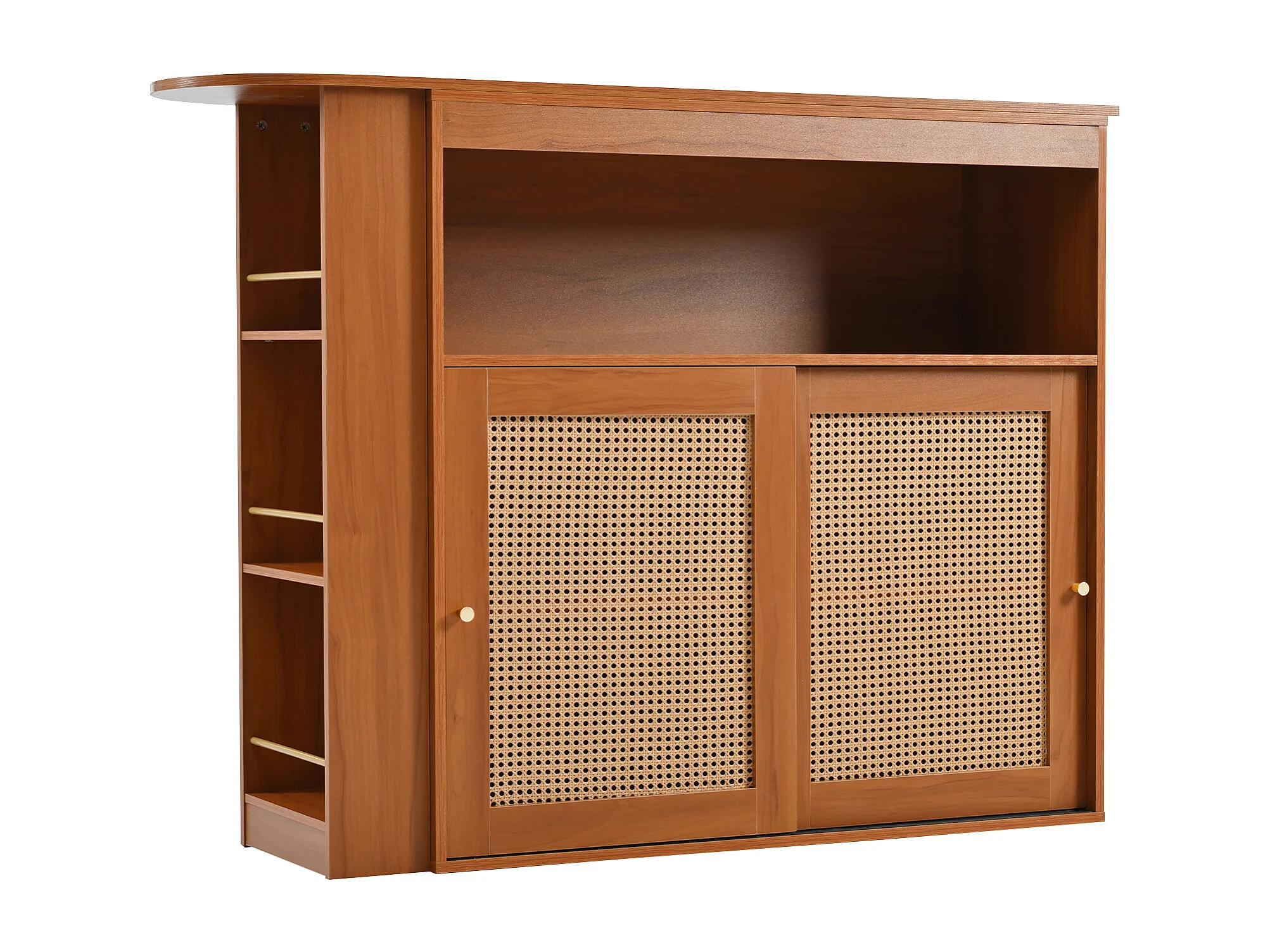 Bruine draaibare barkast - Uitschuifbare barkast met schuifdeuren van rotan en lades - Open opbergruimte