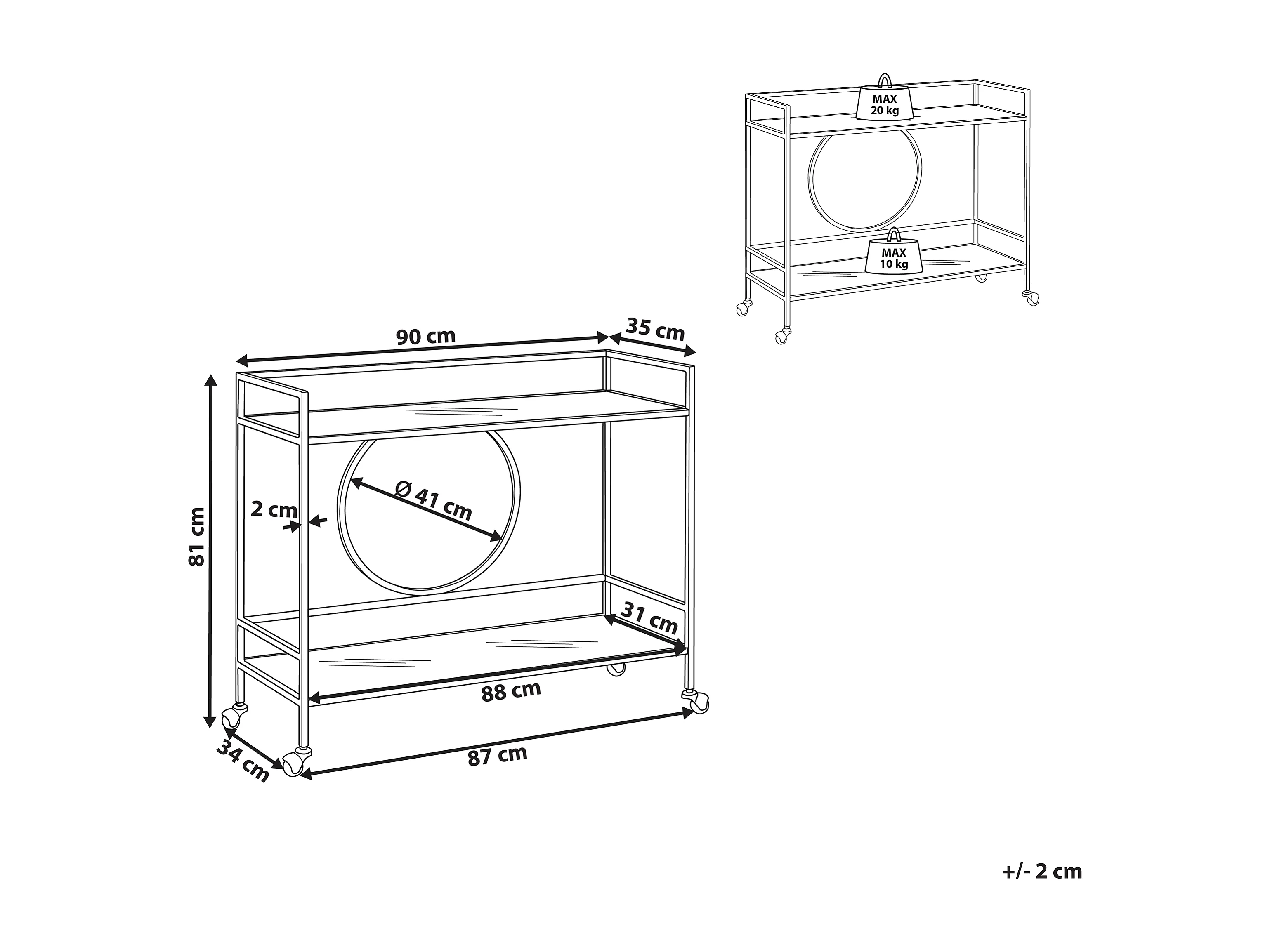 Trolley met 2 spiegelplanken in goudkleurig metaal 70x36,5x78 cm