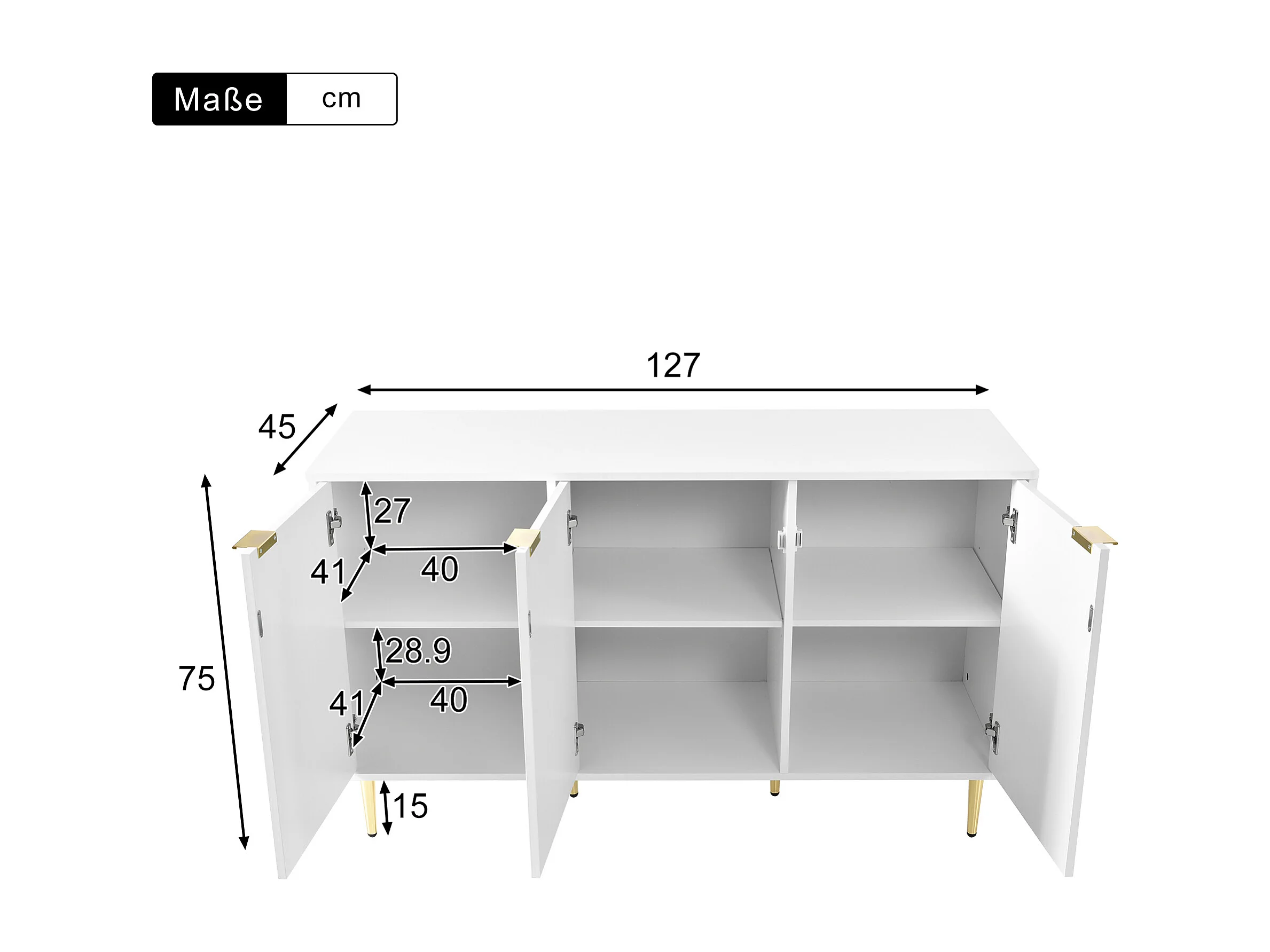 Dressoir 127x45x75 cm met twee planken en zes vakken. Gemaakt van wit MDF. Geschikt voor zowel de woonkamer als de eetkamer.