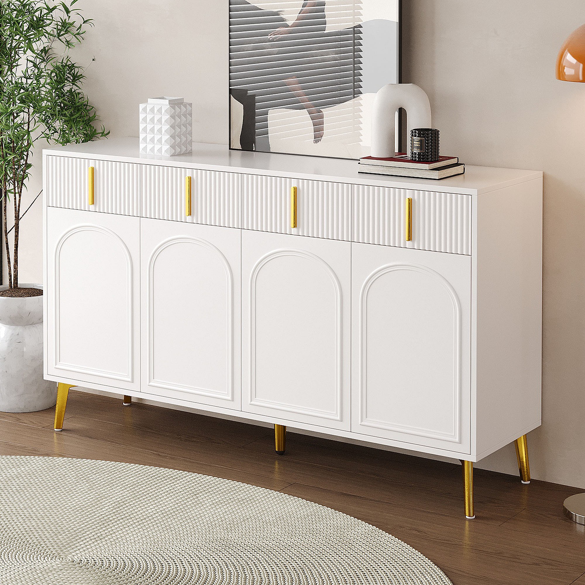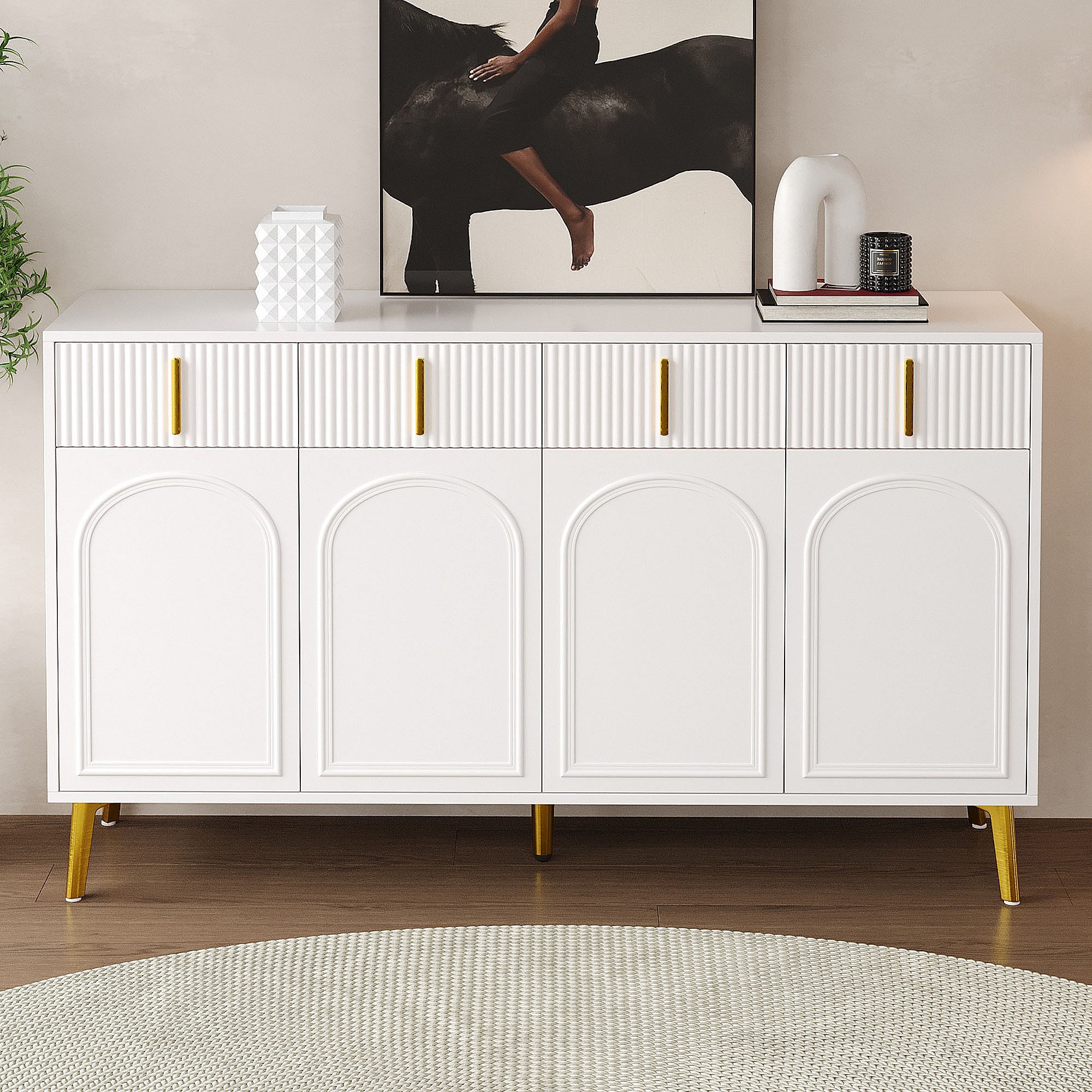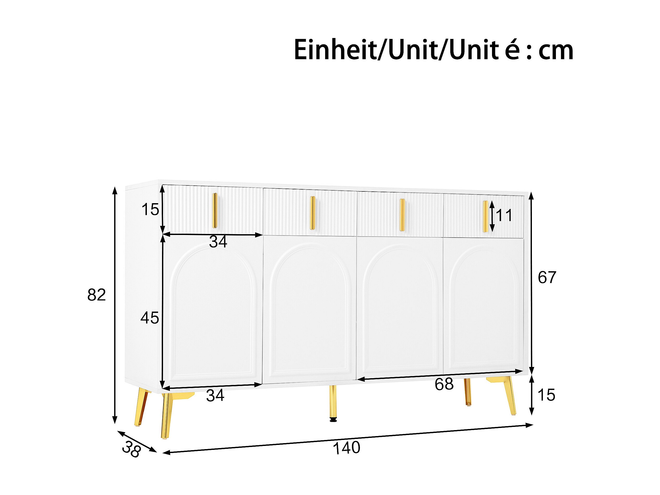 Dressoir 140 x 37,8 x 82 cm – 4 deuren, 4 laden met afneembaar laminaat – Gouden handgrepen en poten – Meubels voor woonkamer en eetkamer