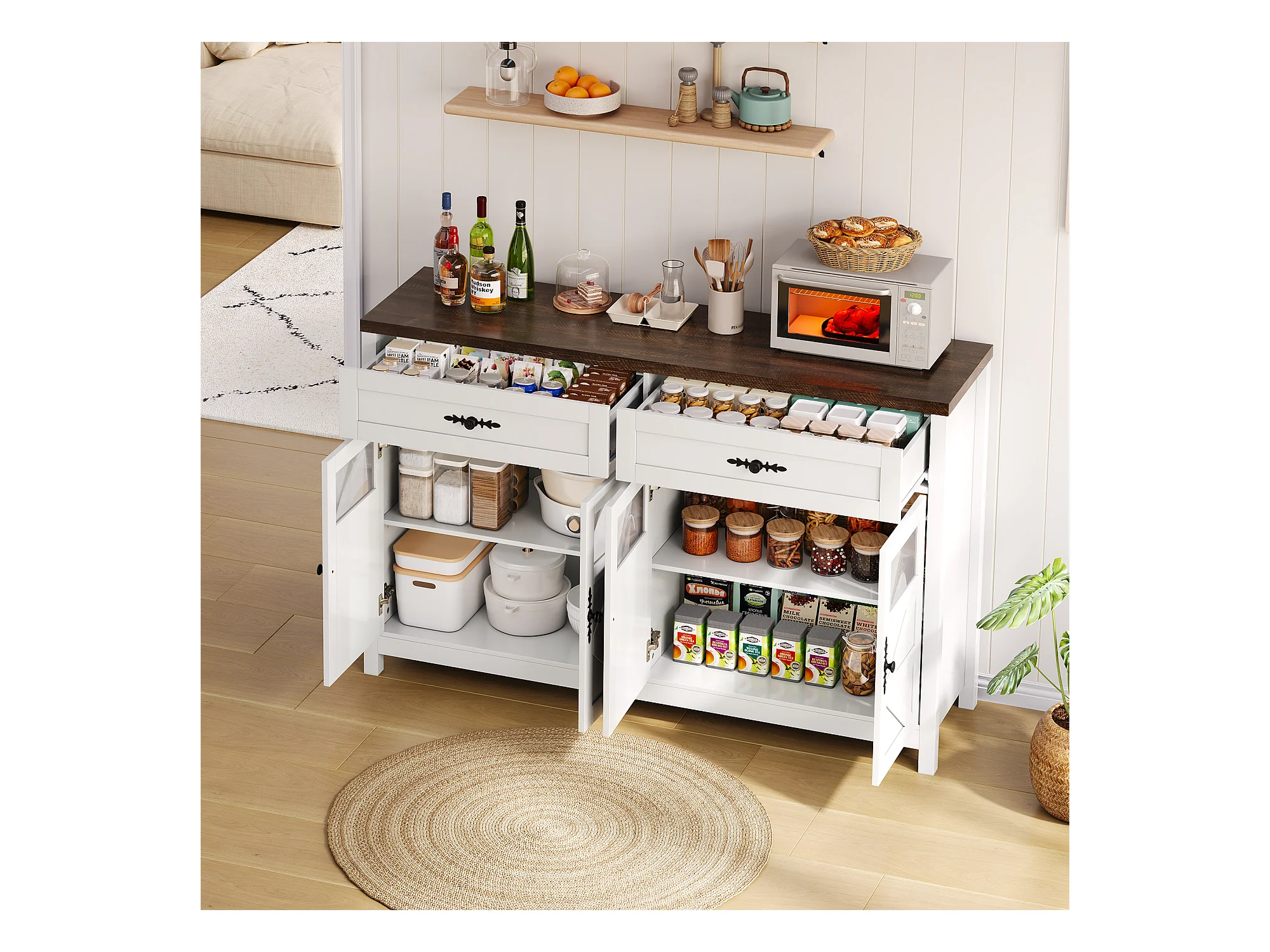 Keuken dressoir 138x40x85cm met 4 deuren en 1 lade, bovenblad van natuurlijk houtnerf, witte behuizing