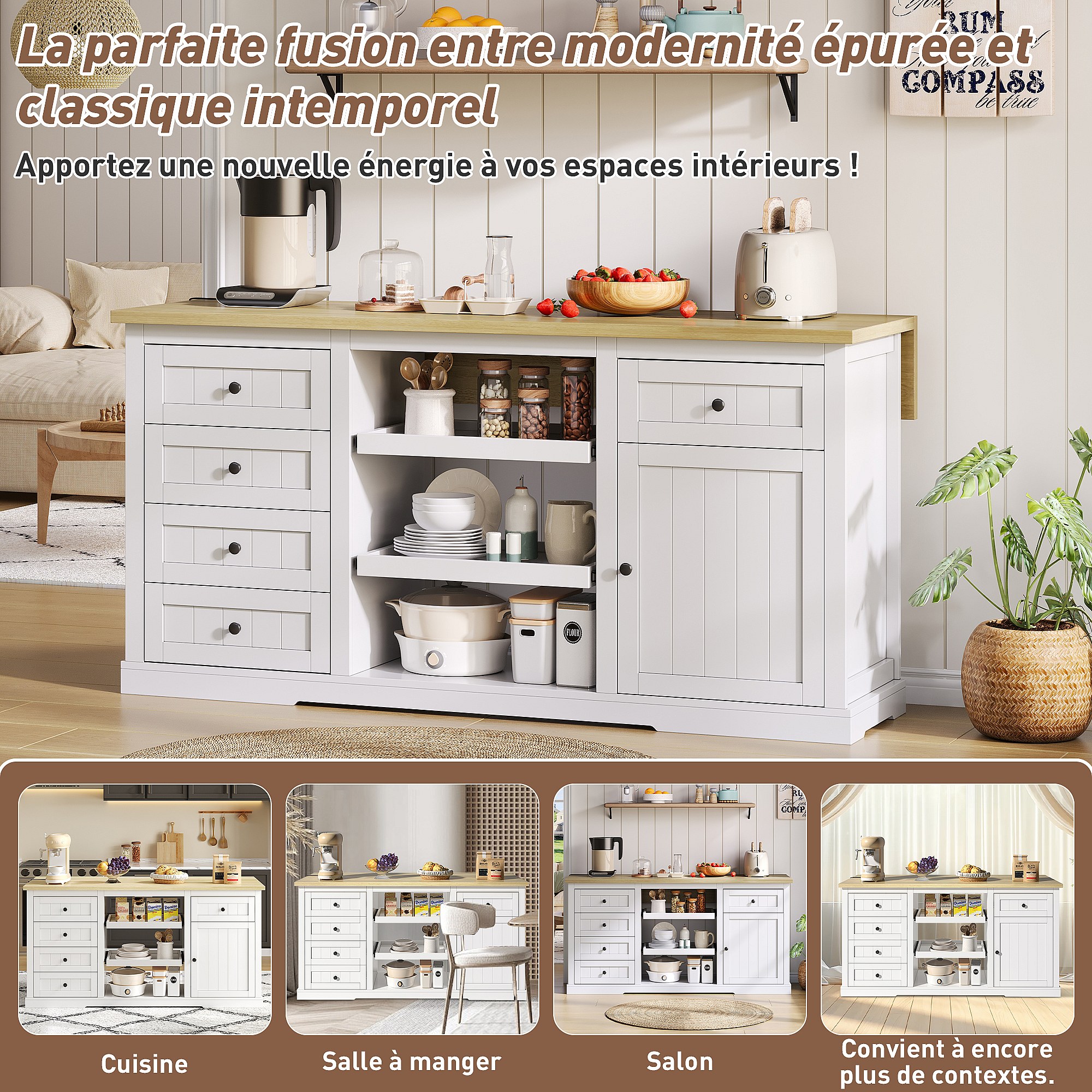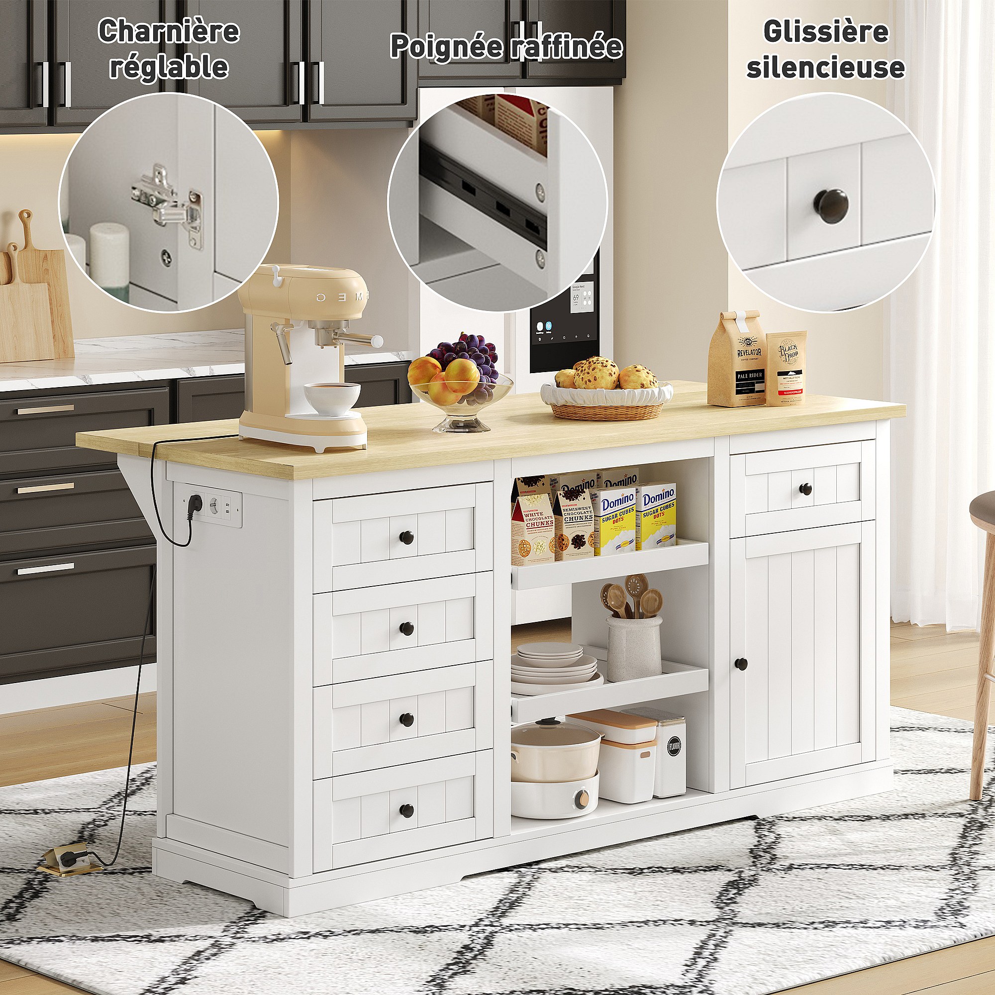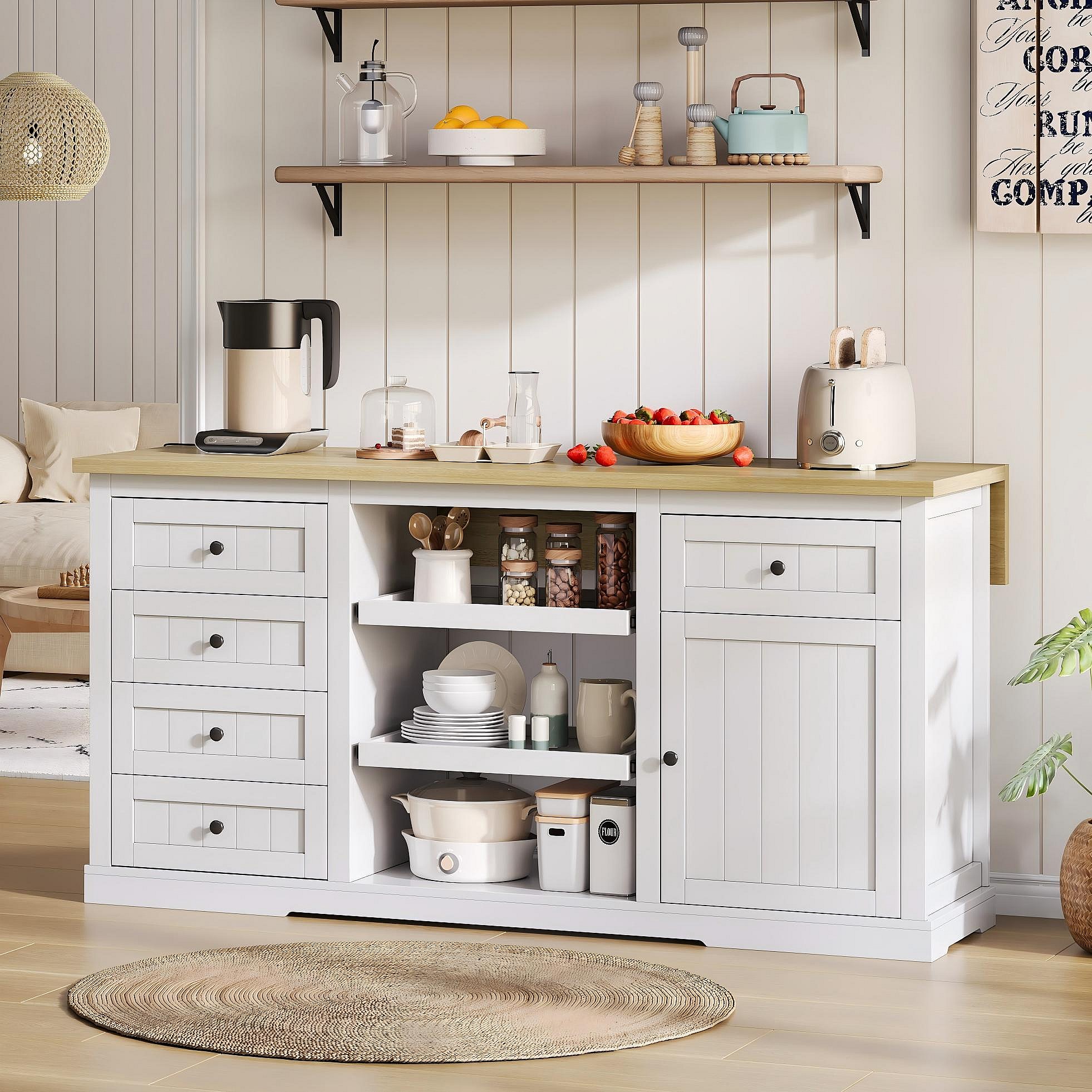 Dressoir / keukeneiland / barkast met 5 laden, 2 schuifplanken en geïntegreerde stopcontacten voor keuken, eetkamer en woonkamer, wit