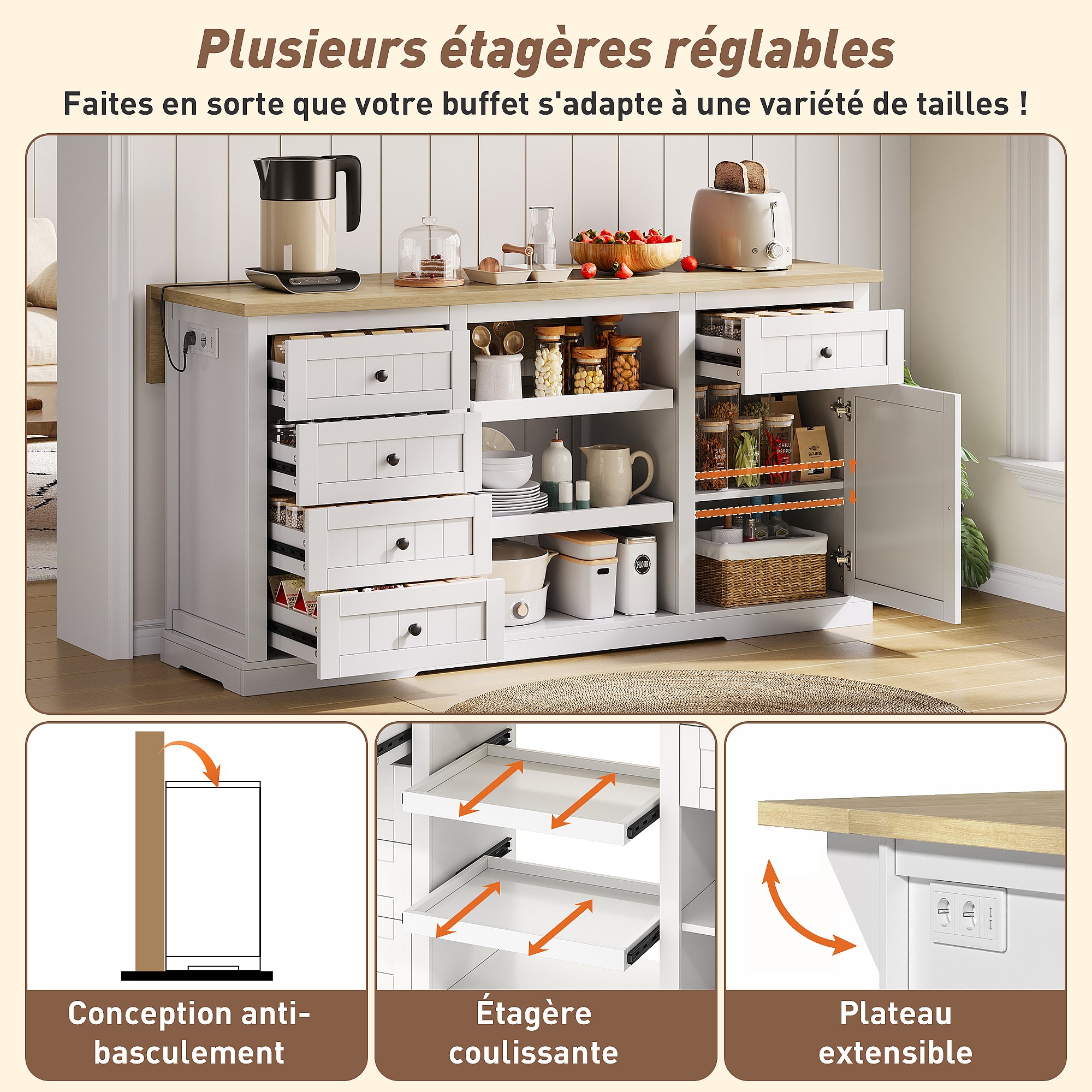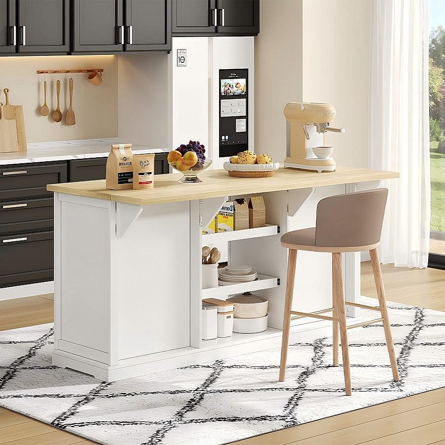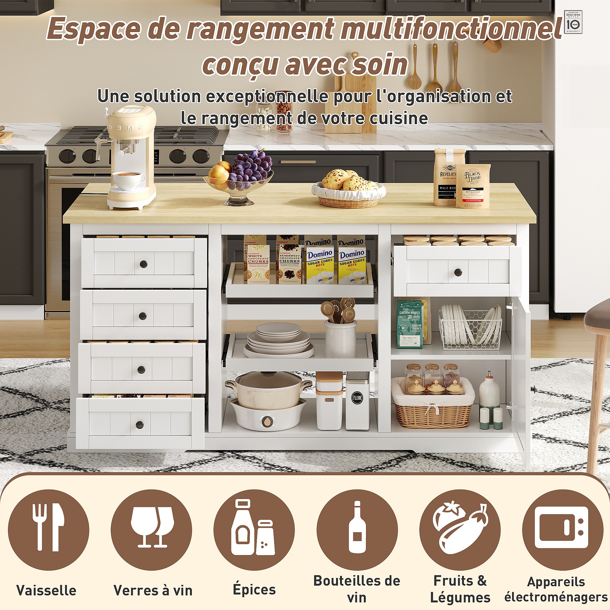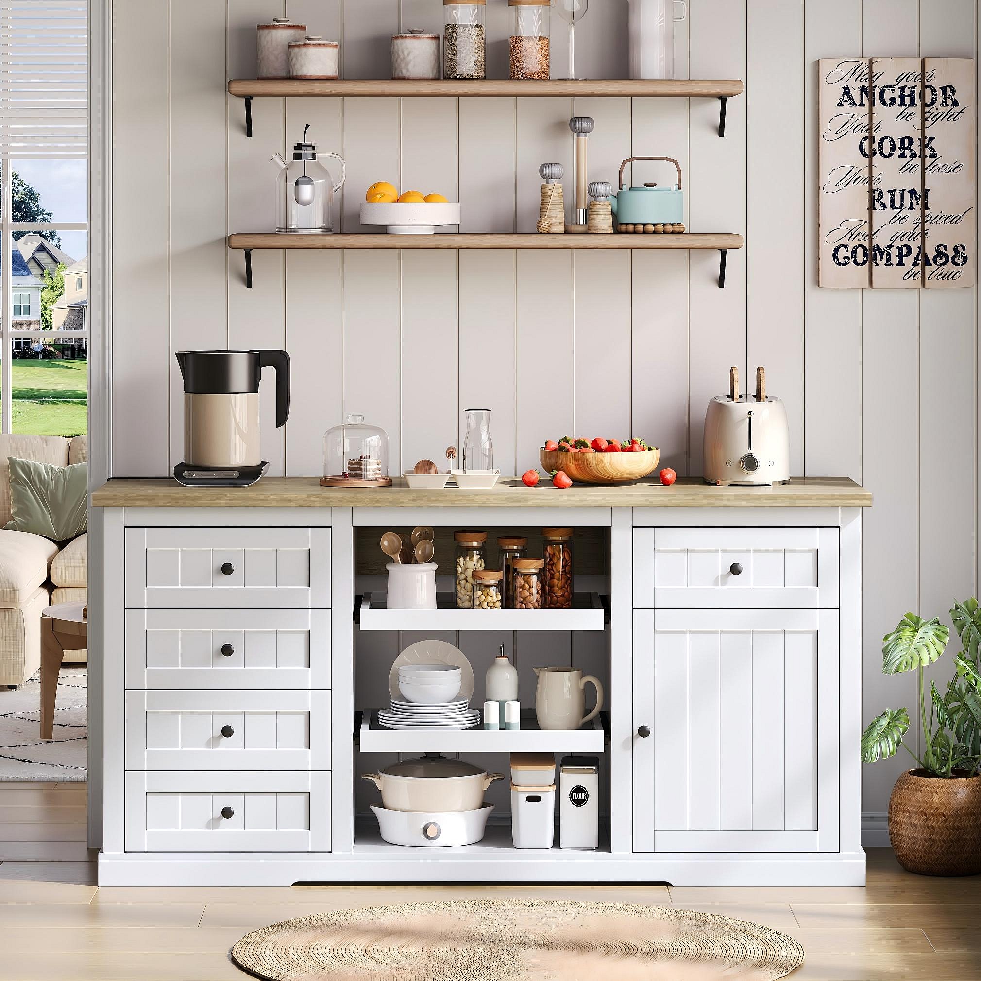 Dressoir / keukeneiland / barkast met 5 laden, 2 schuifplanken en geïntegreerde stopcontacten voor keuken, eetkamer en woonkamer, wit