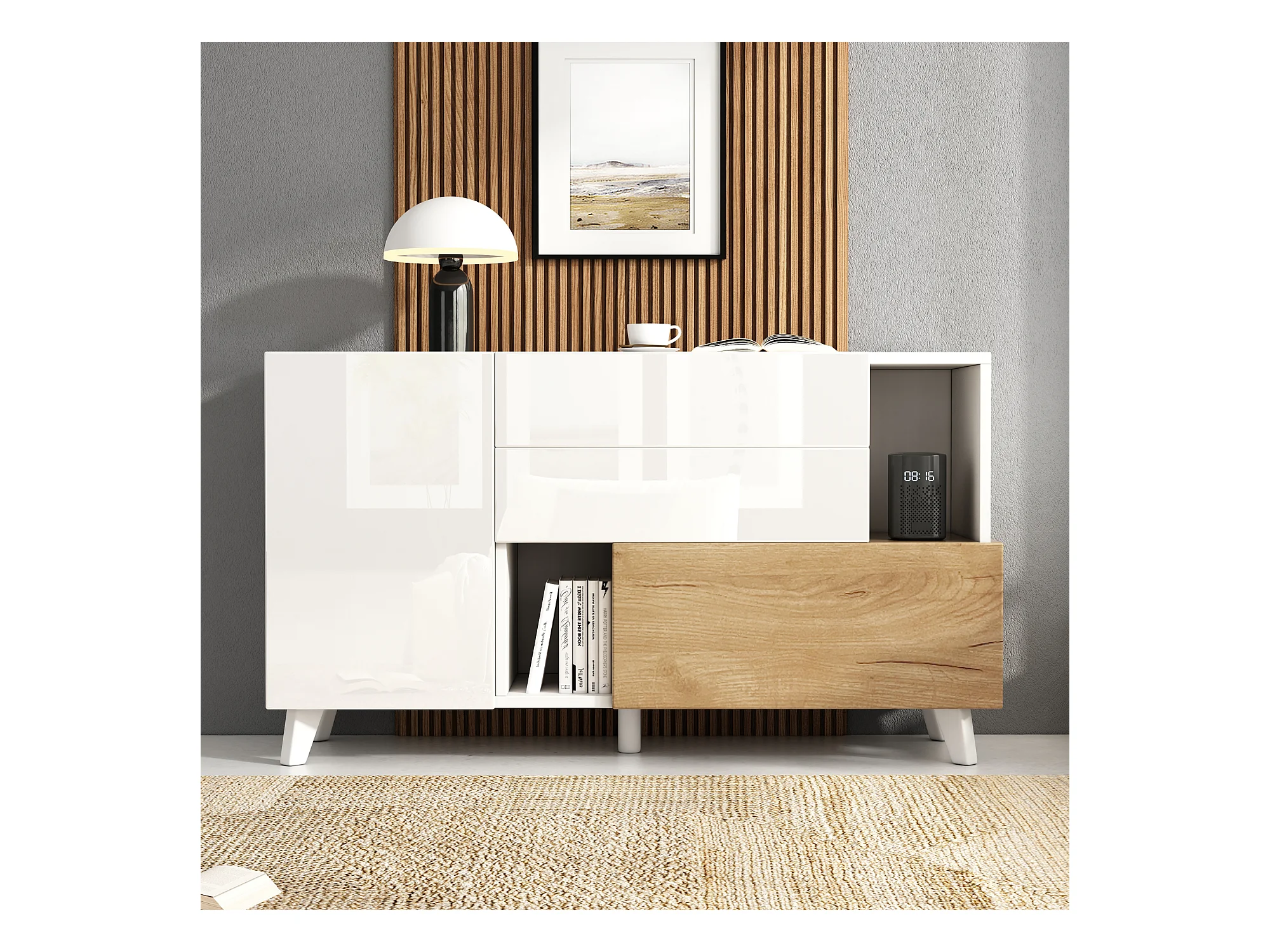 Dressoir met 2 deuren en 2 laden - 120 x 40 x 75 cm - Spaanplaat - Glanzend wit + Licht eiken