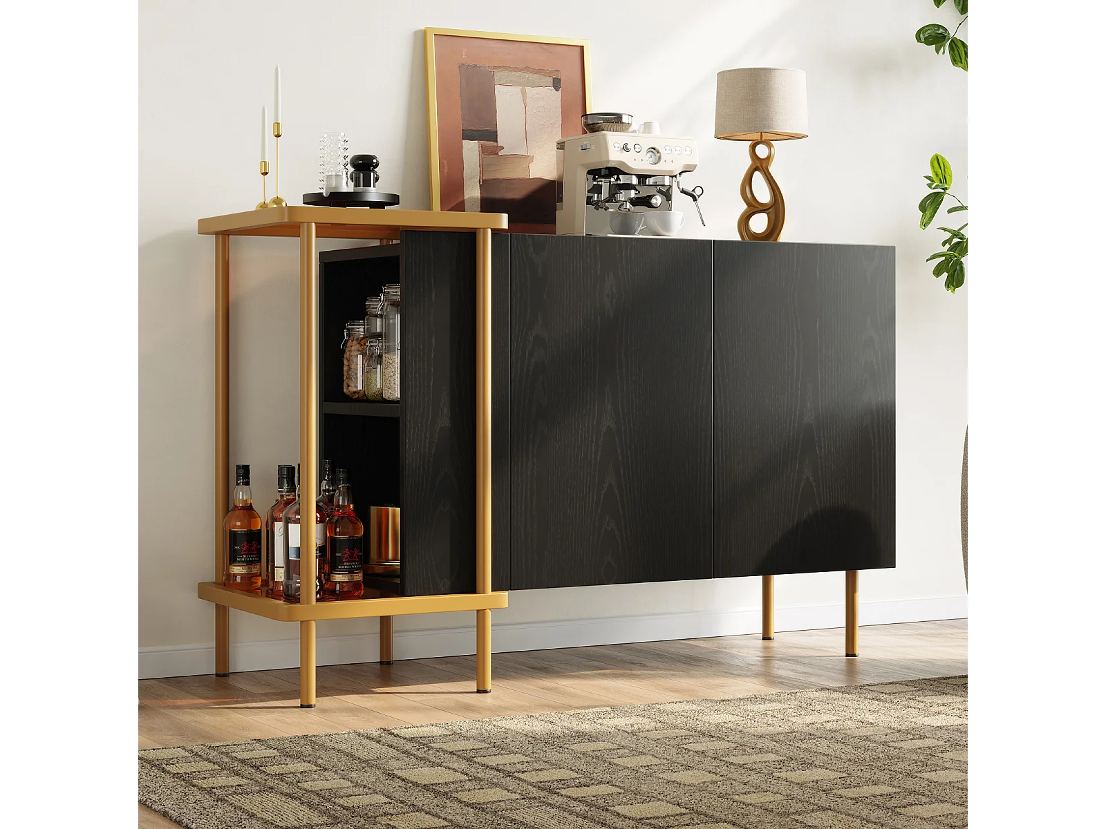 Modern 4-deurs dressoir in zwart en goud – MDF, metalen poten, voor woonkamer en eetkamer