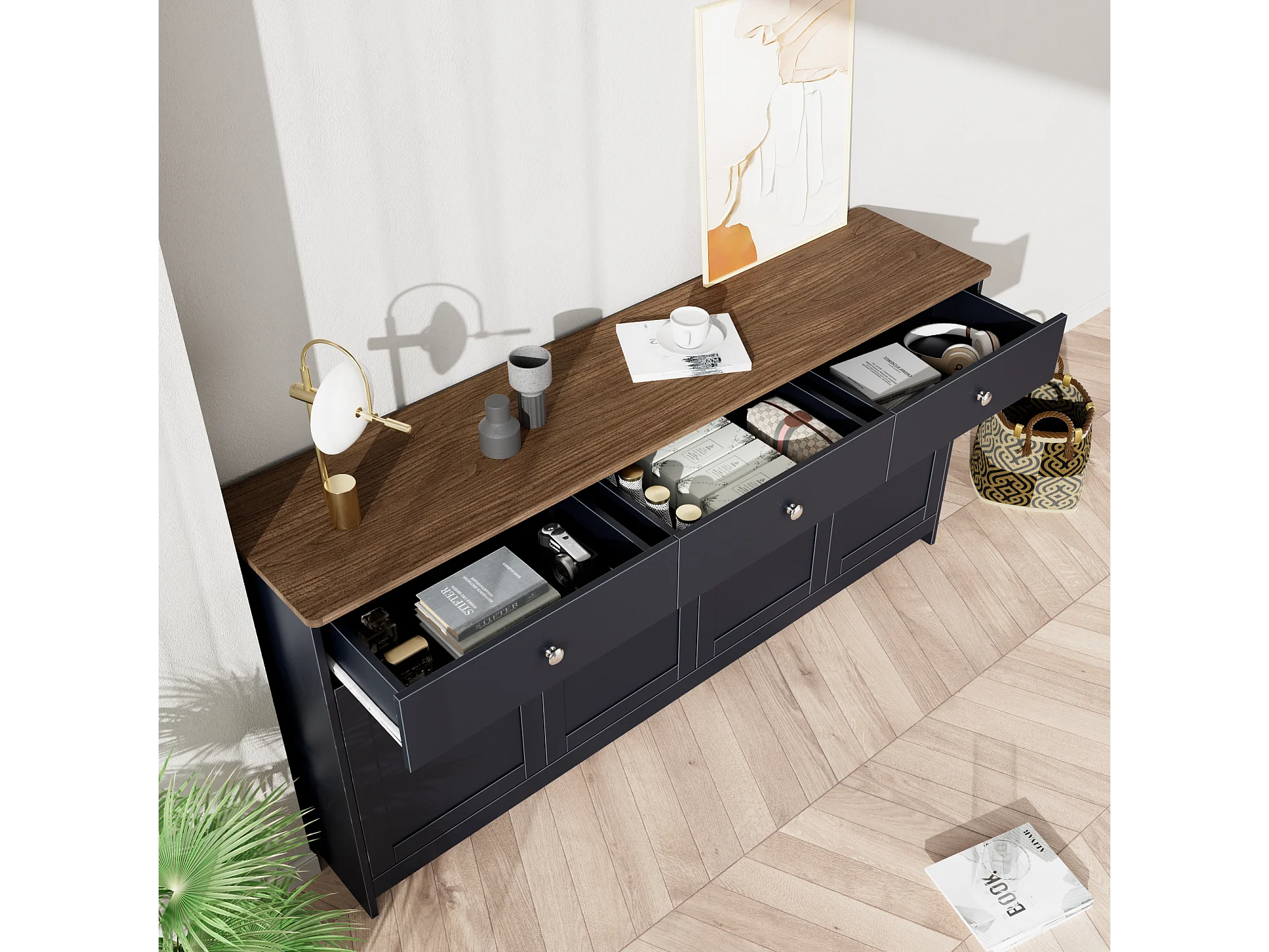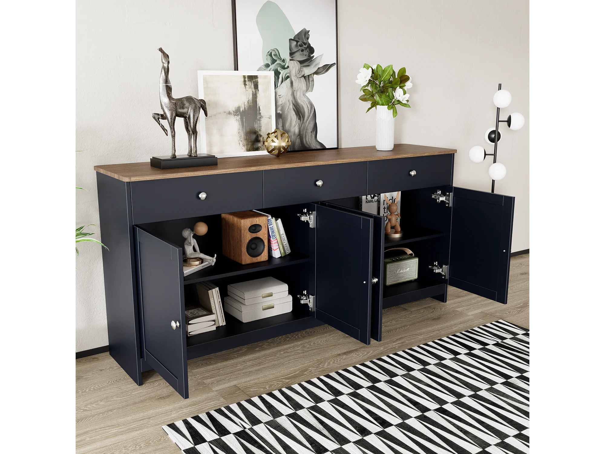 Dressoir met 4 deuren en 3 laden, rustiek design, MDF, antracietgrijs en hout (160x37x75cm)