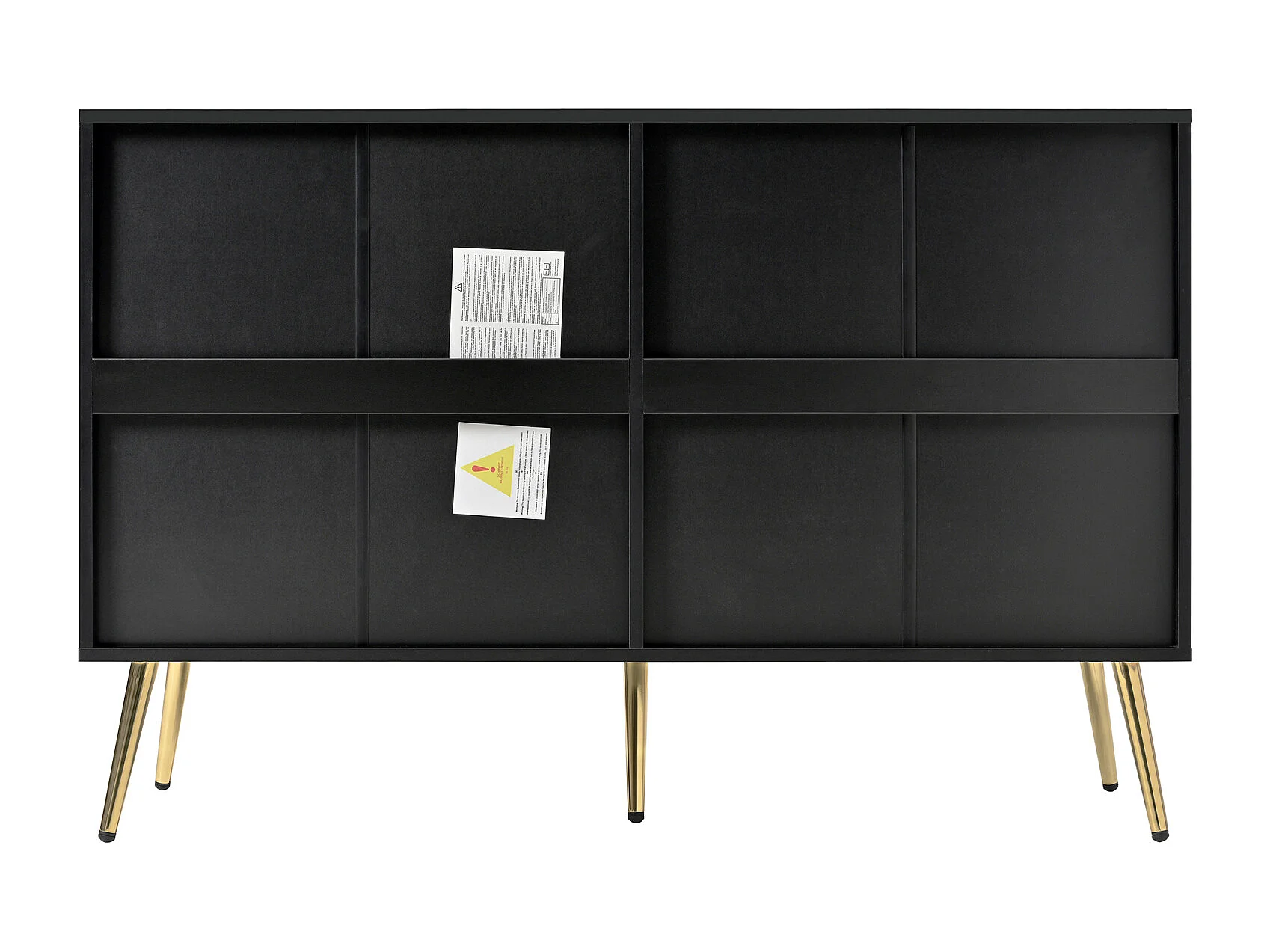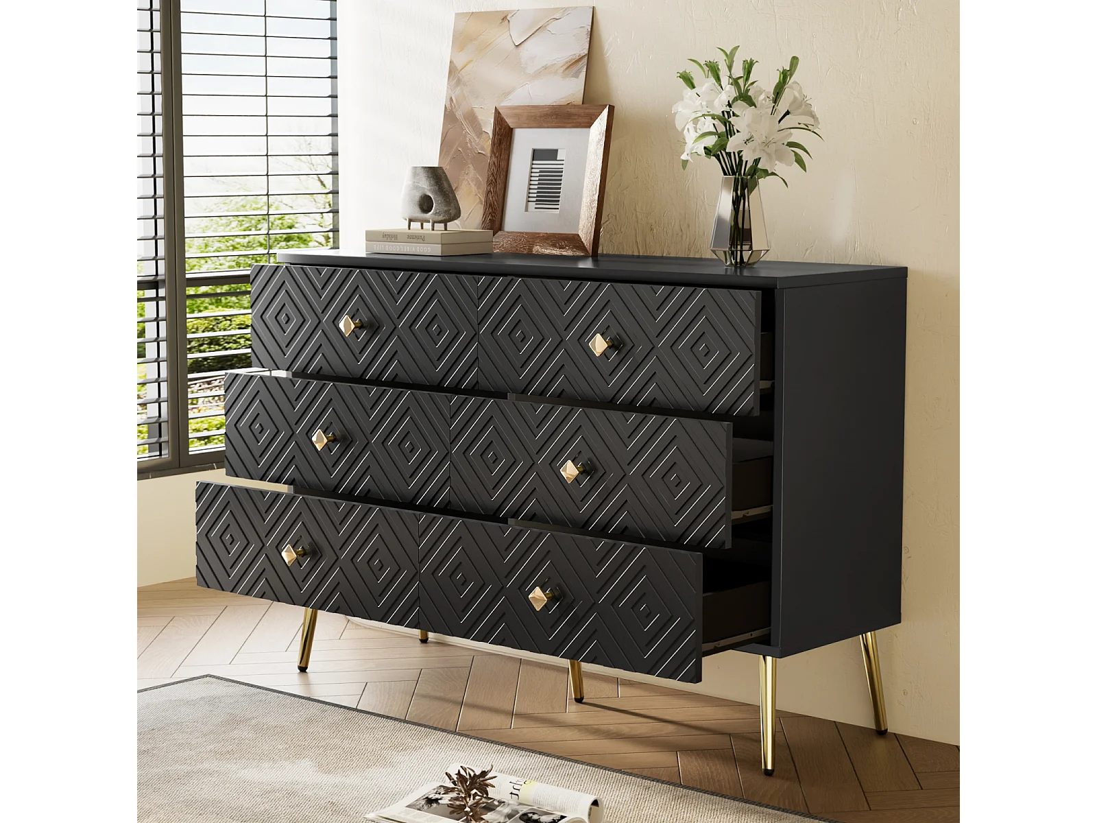 Dressoir met 6 laden, zwart, met geometrische patronen en gouden metalen poten, 120 x 40 x 80 cm