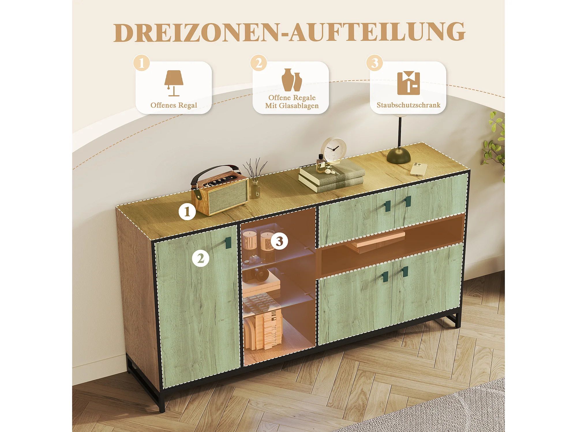 Dressoir met ledverlichting, 2 lades en 3 deuren - Open glazen planken - Hout en zwarte afwerking