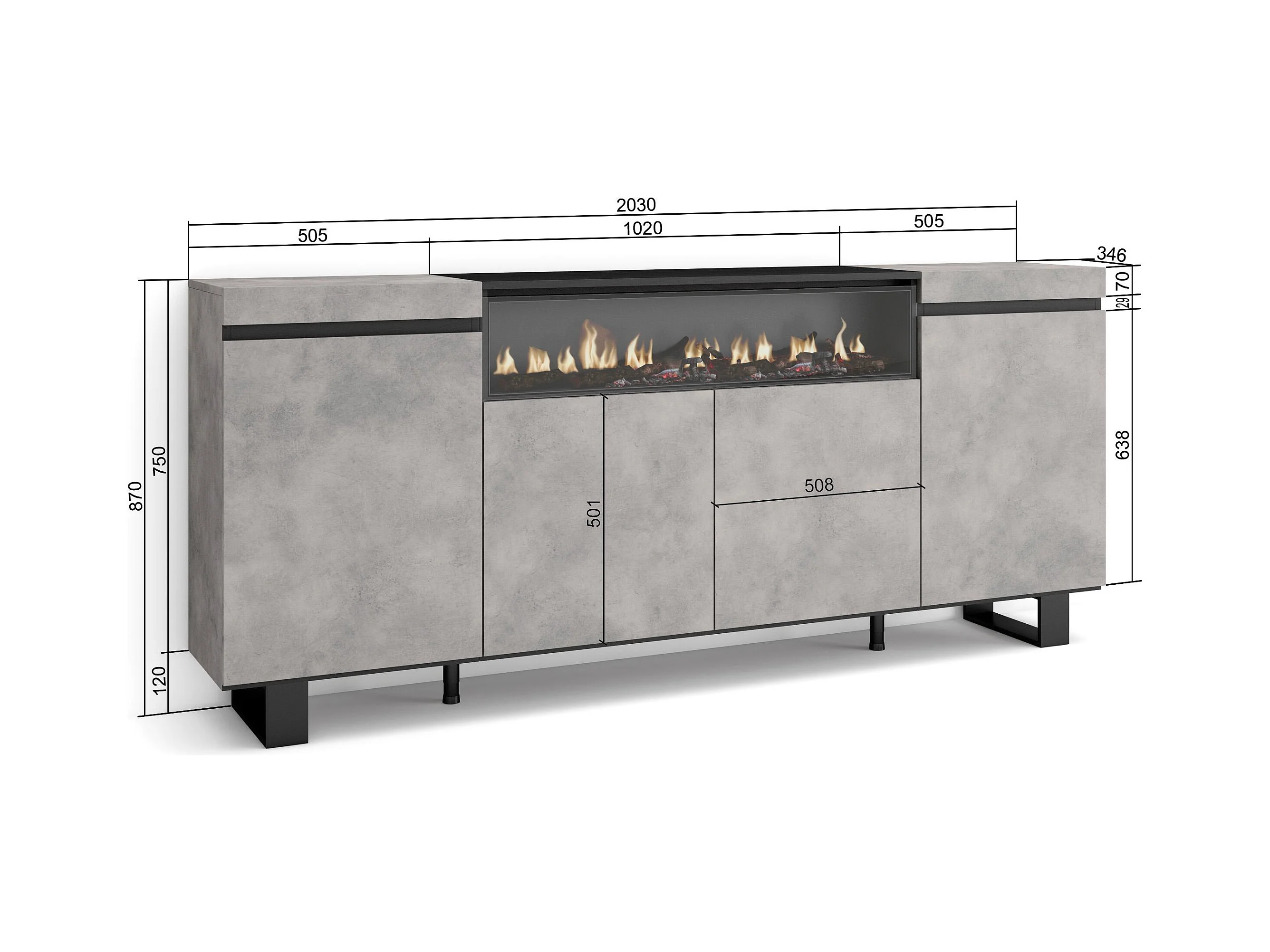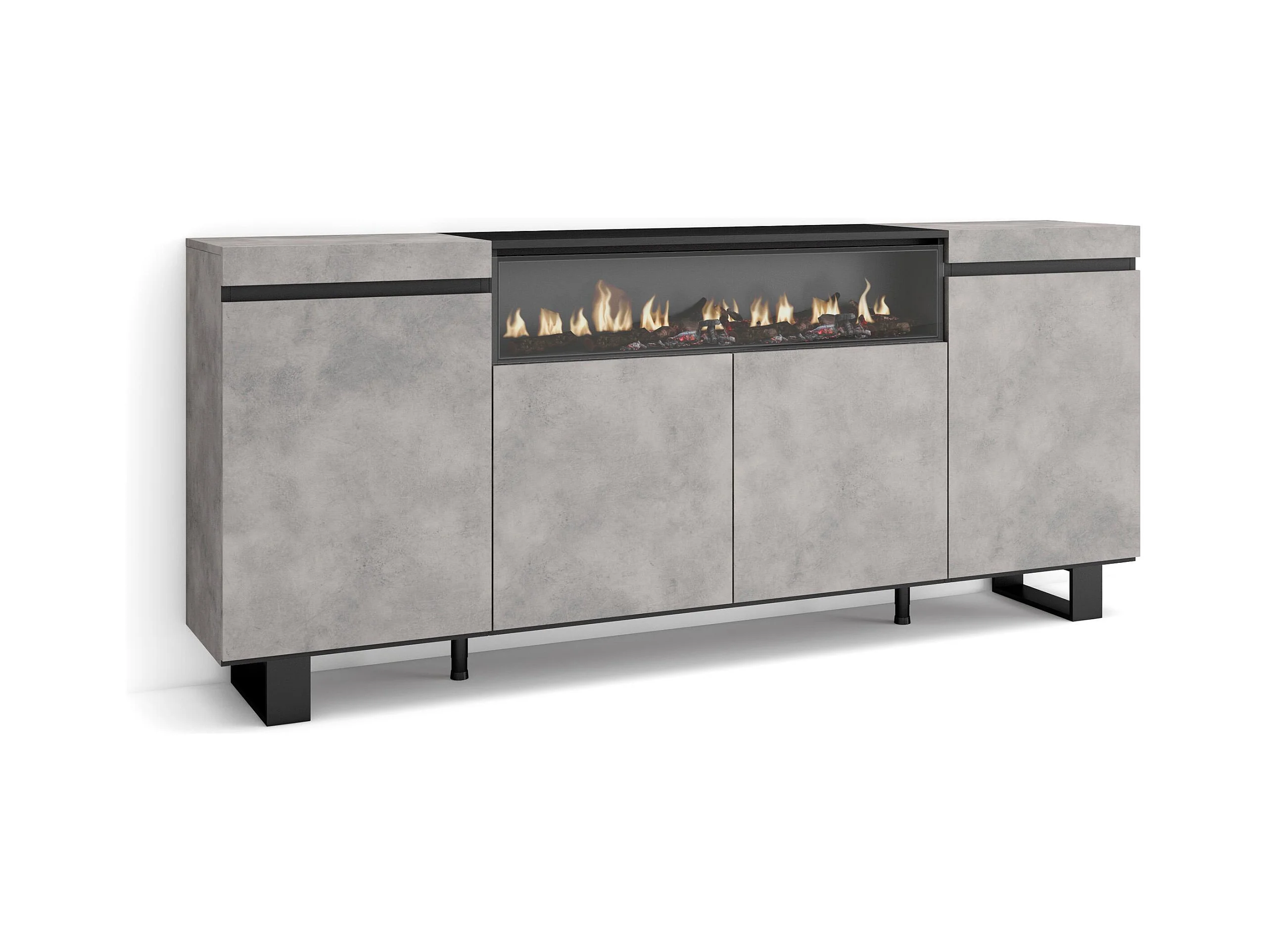 Dressoir, Opbergkast, 200x35x87cm, 4 Deuren, Elektrische haard, Industrieel design, Cement