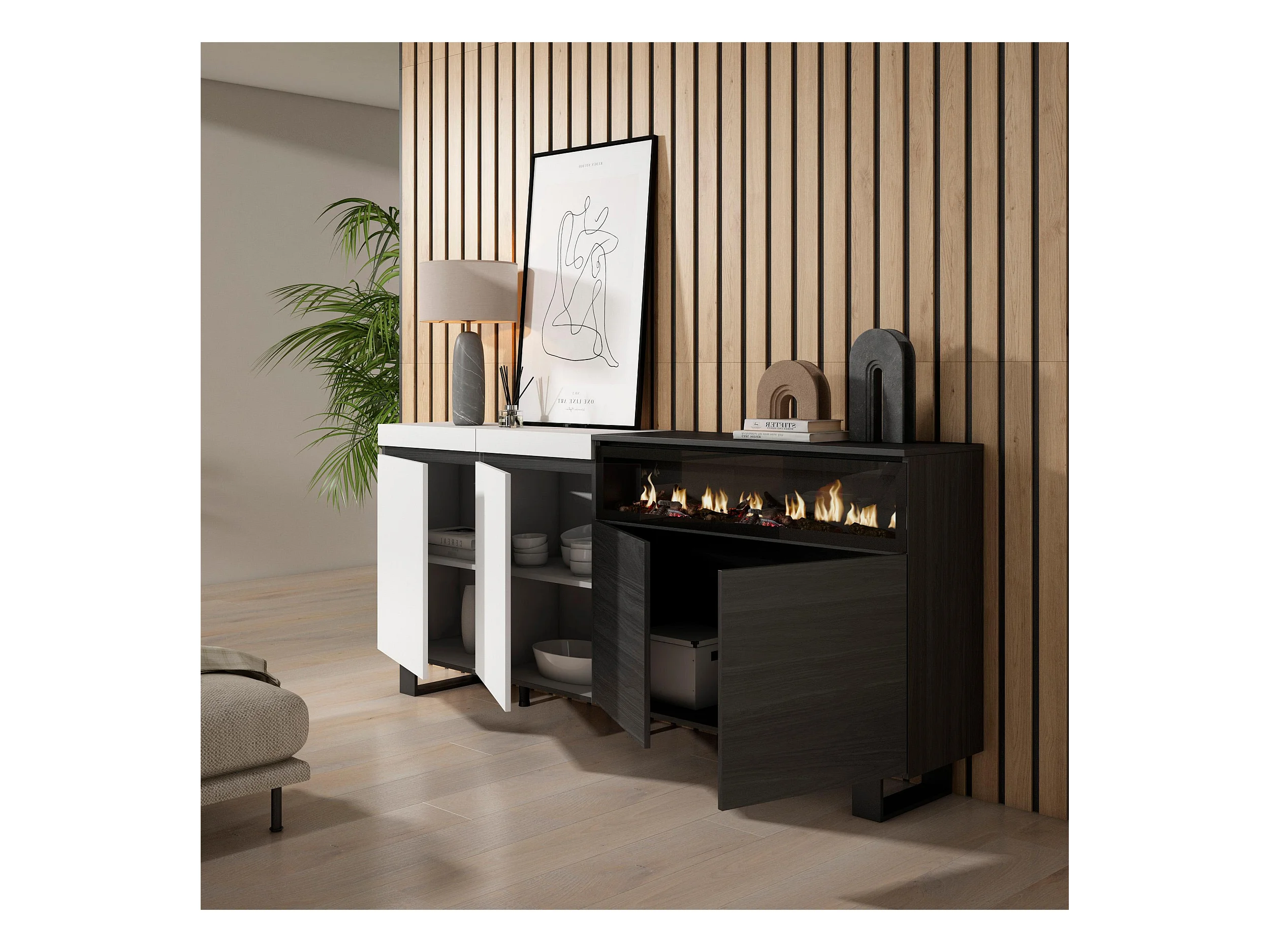 Dressoir, Opbergkast, 200x35x87cm, 4 Deuren, Elektrische haard, Industrieel design, Wit en Zwart