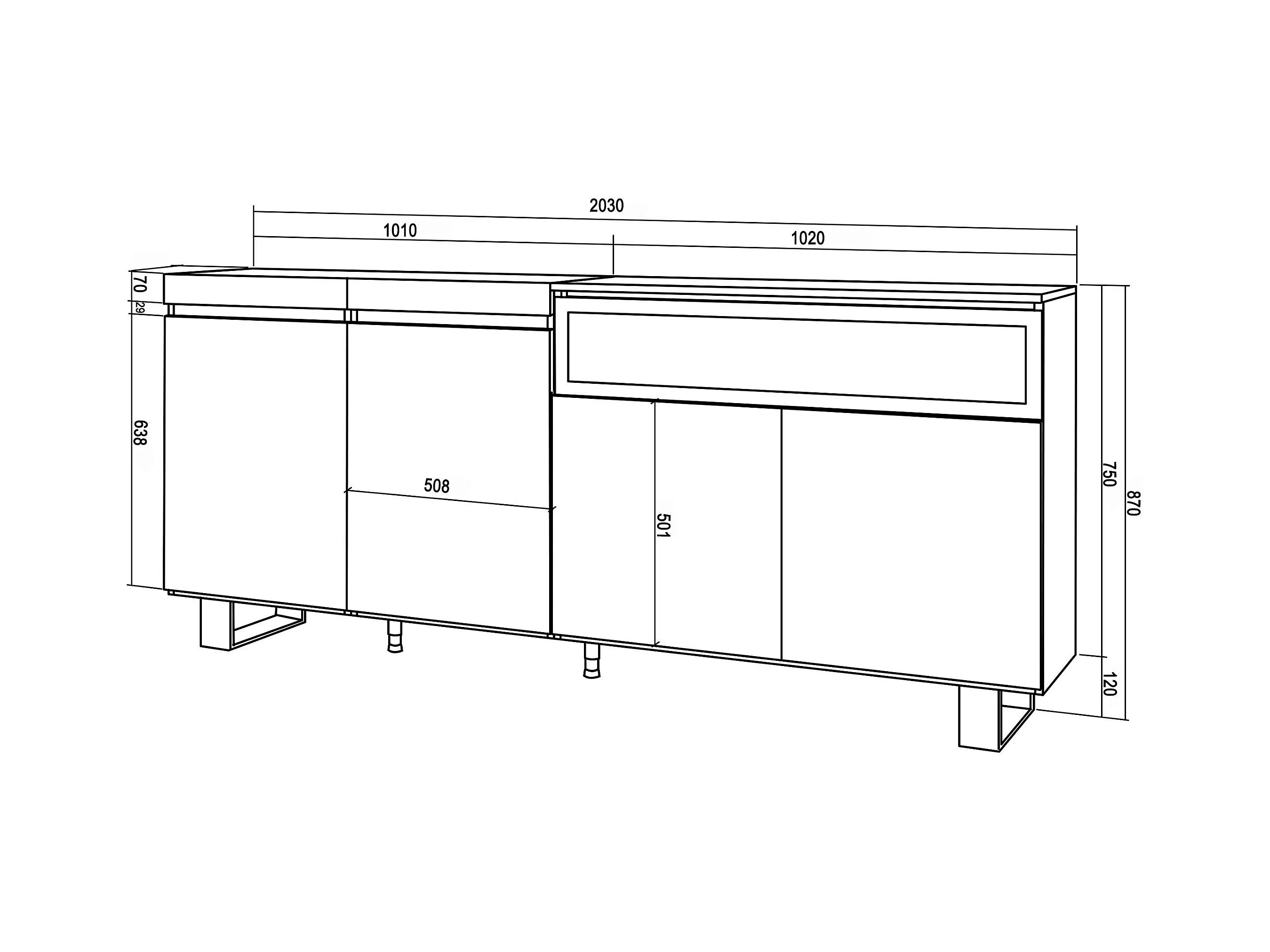 Dressoir, Opbergkast, 200x35x87cm, 4 Deuren, Industrieel design, Wit en Zwart