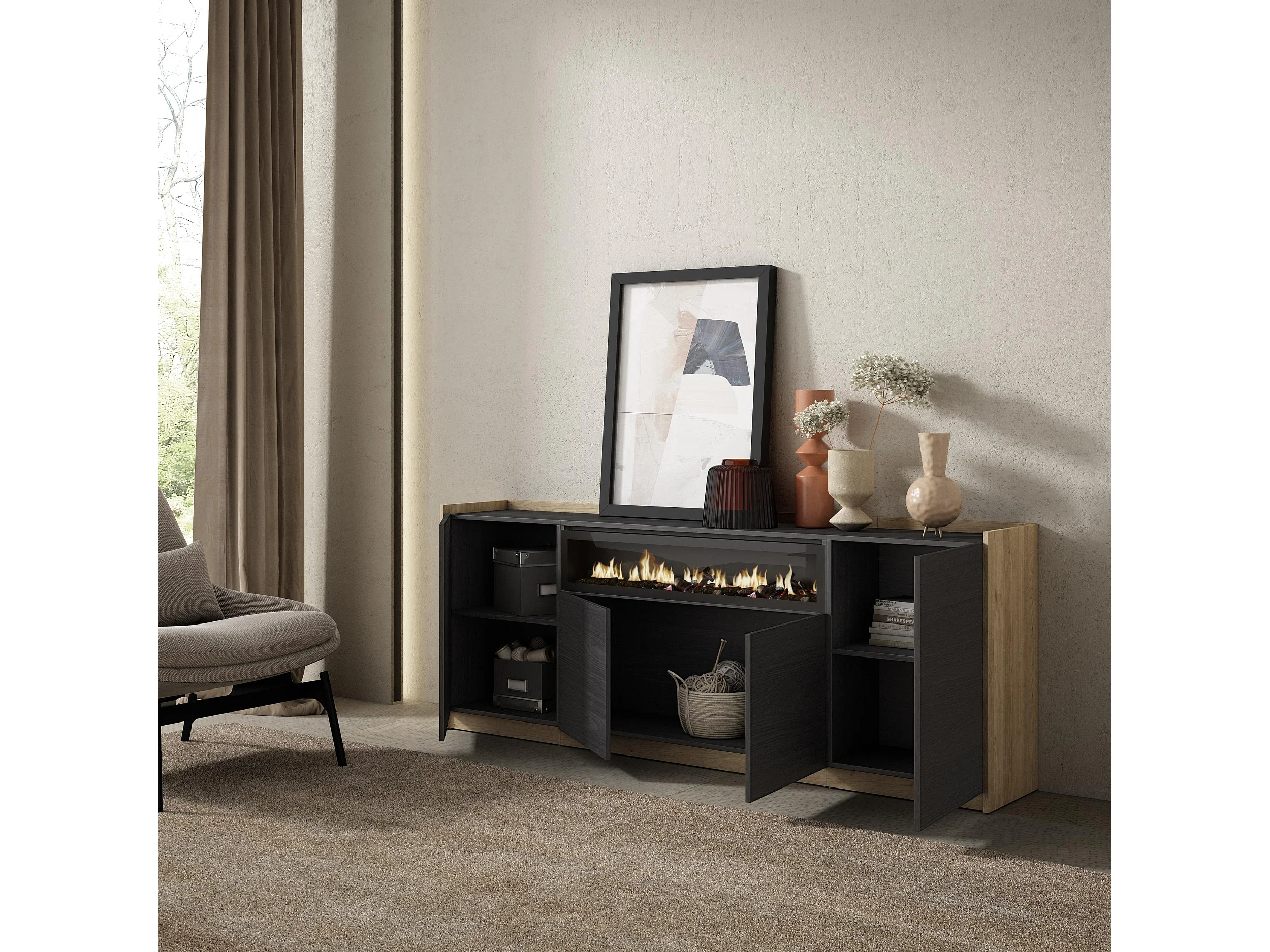 Dressoir, Opbergkast, 207x80x37 cm, 4 Deuren, Elektrische haard, Zwart/Eiken