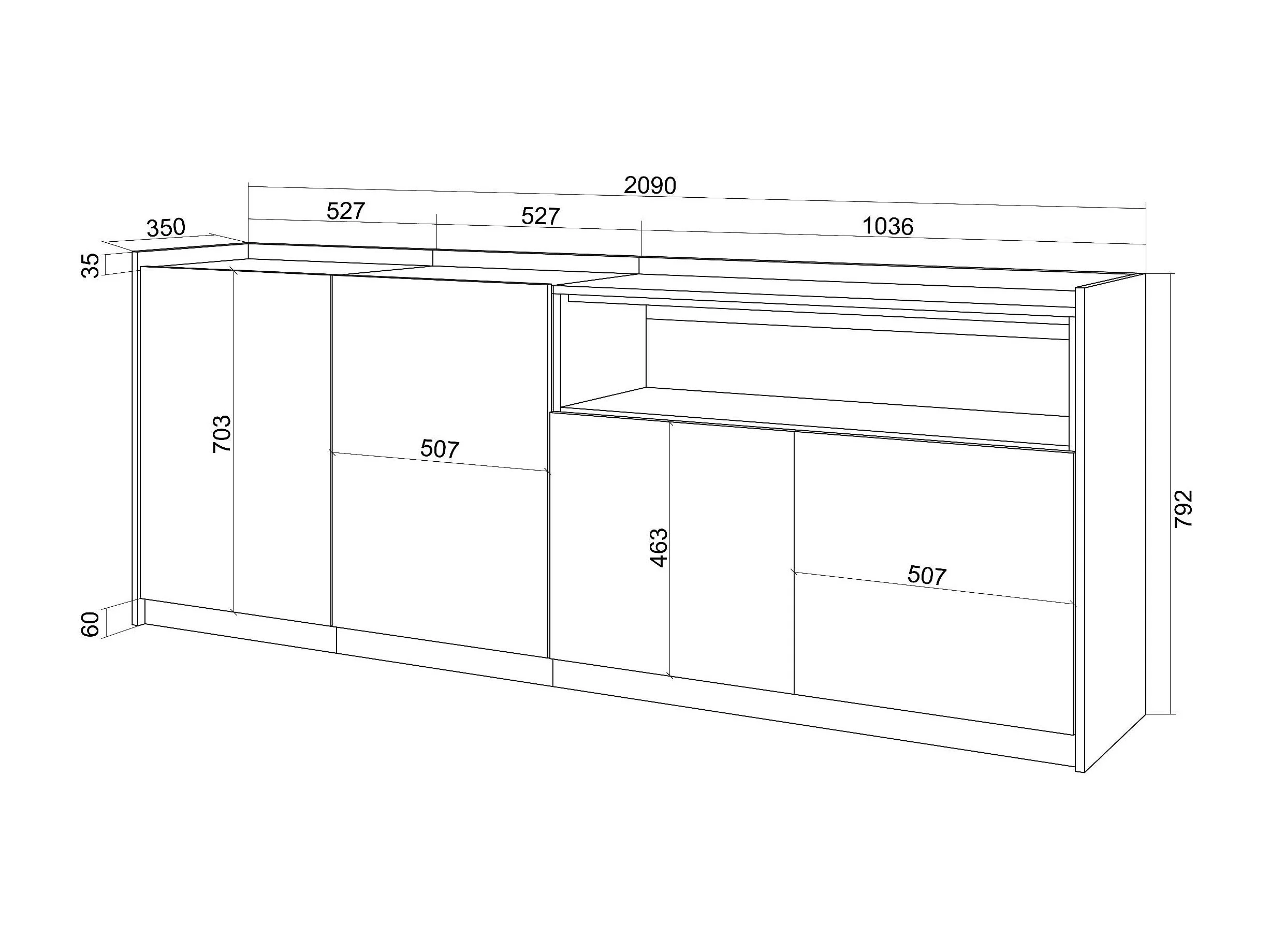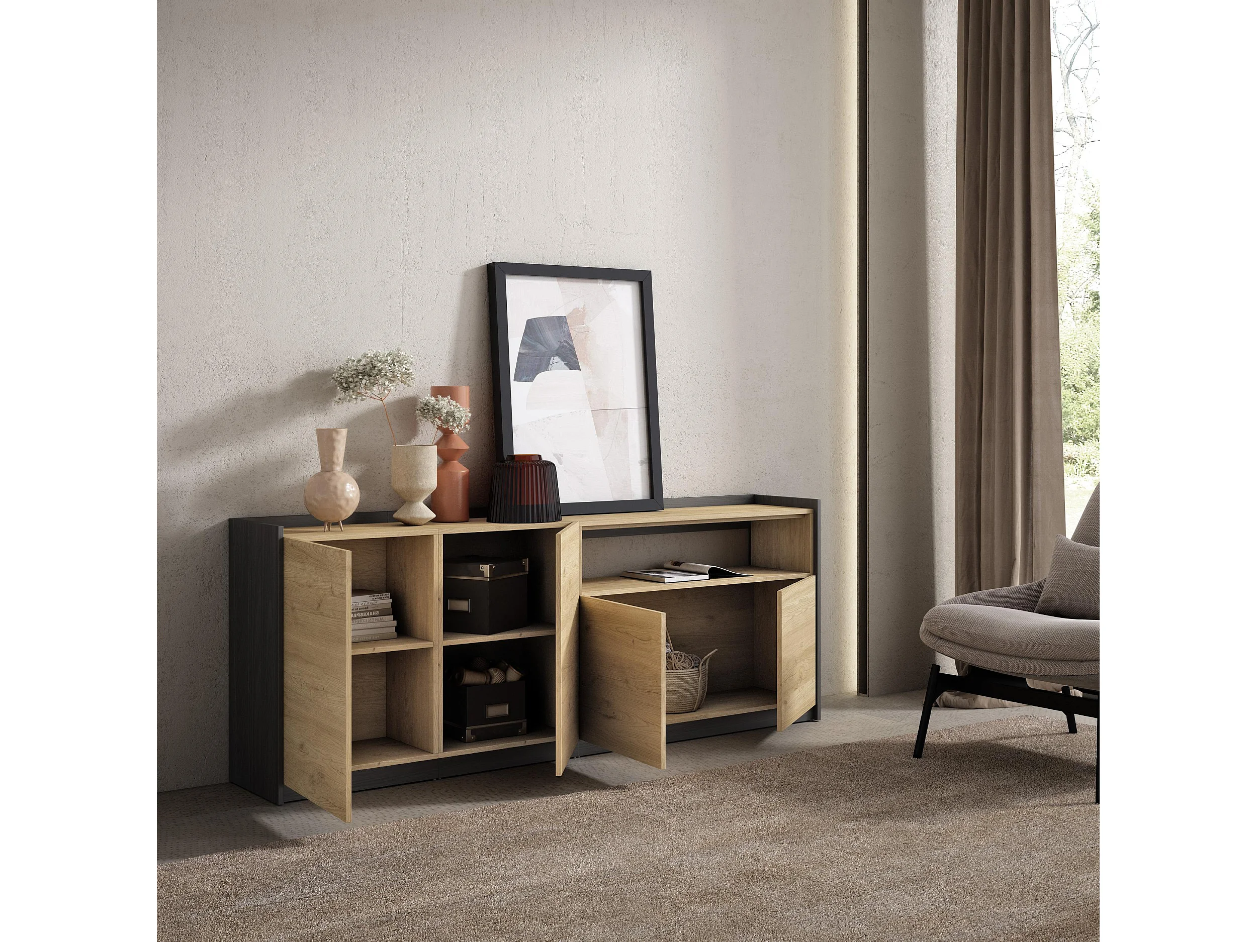 Dressoir, Opbergkast, 207x80x37 cm, 4 Deuren, Woonkamer, hal, Eiken/Zwart