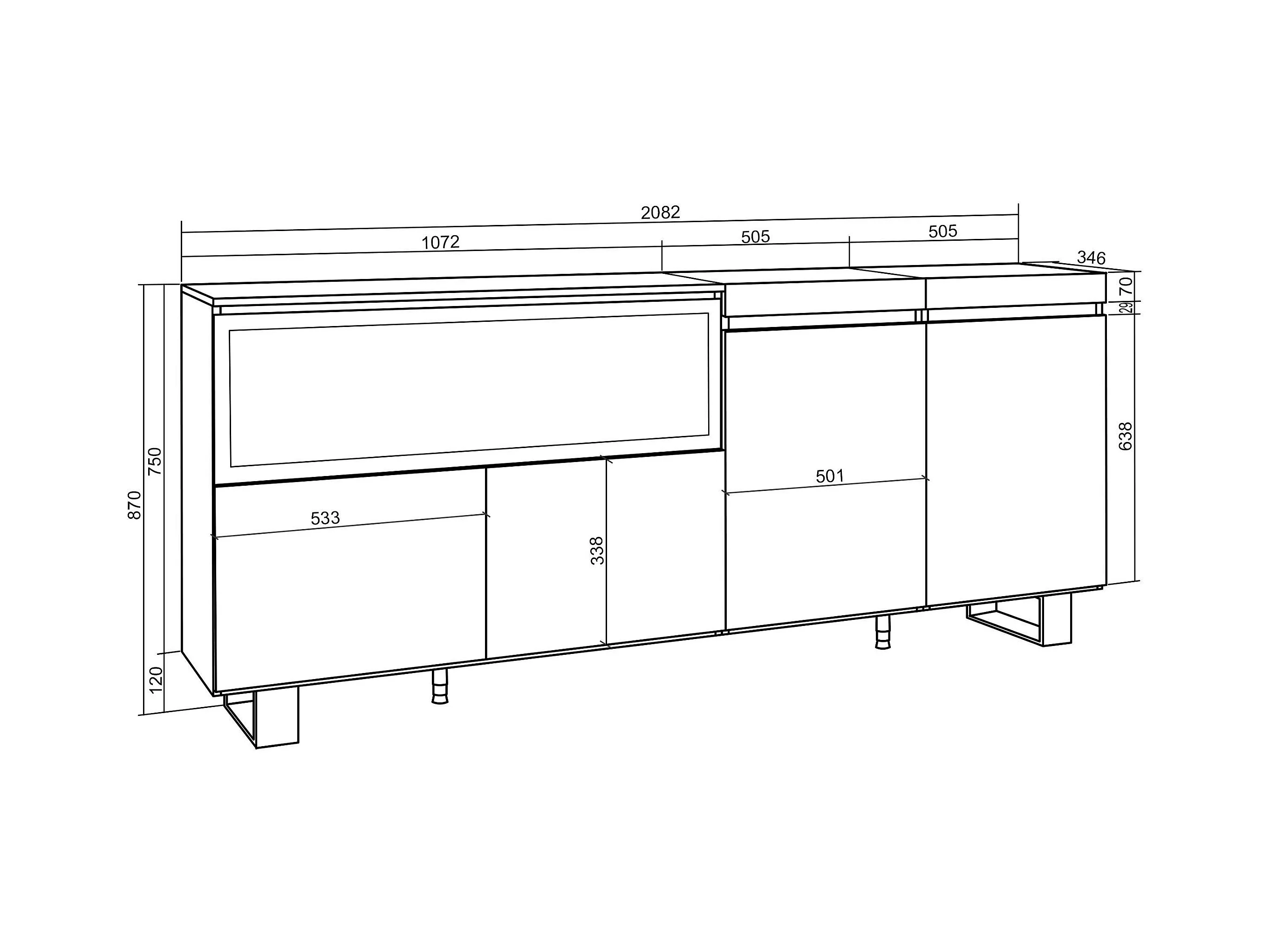 Dressoir, Opbergkast, 208x35x87cm, 4 Deuren, Elektrische haard XXL, Industrieel design, Eiken/Zwart