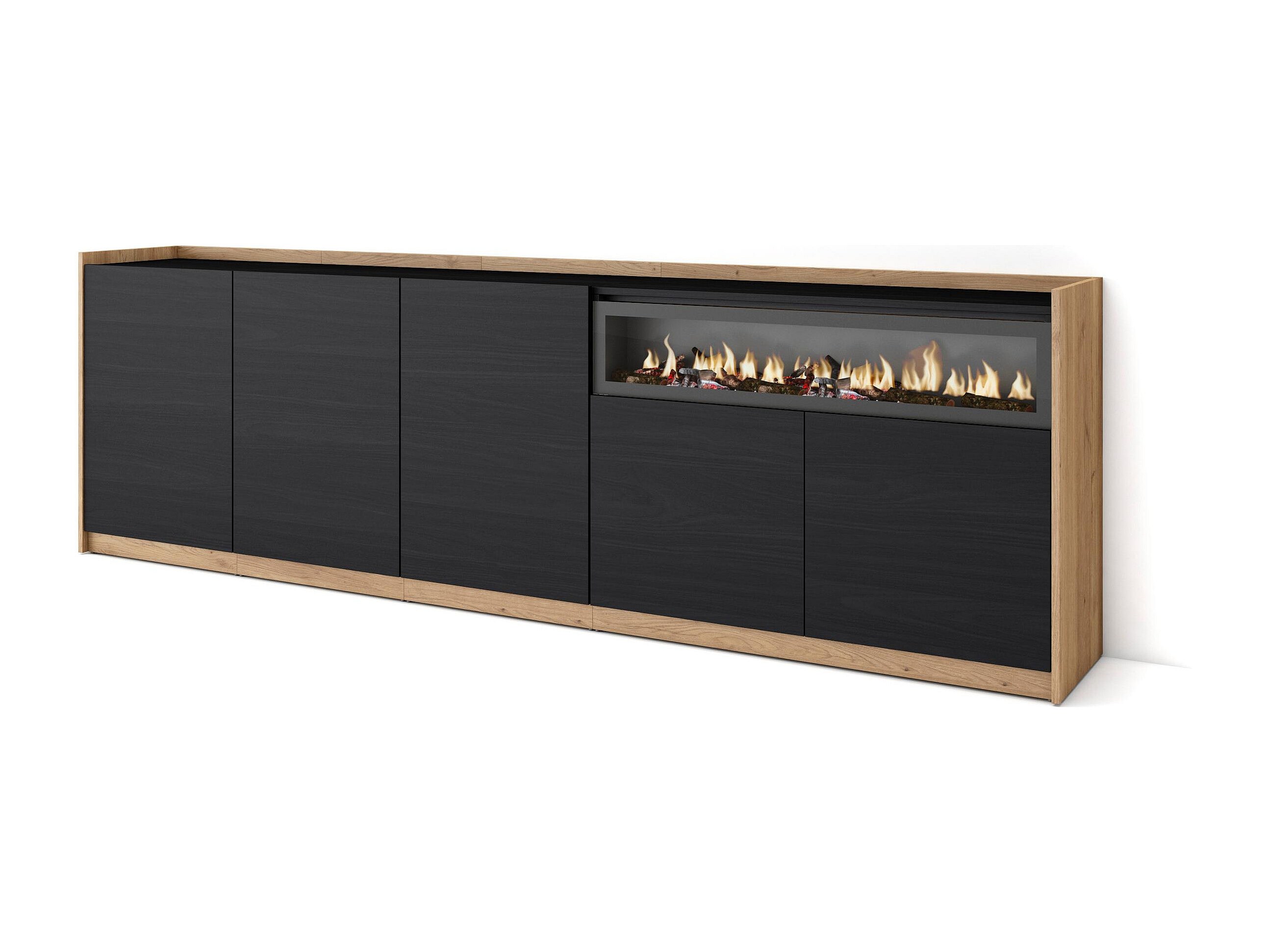Dressoir, Opbergkast, 260x80x37 cm, 5 Deuren, Elektrische haard, Zwart/Eiken
