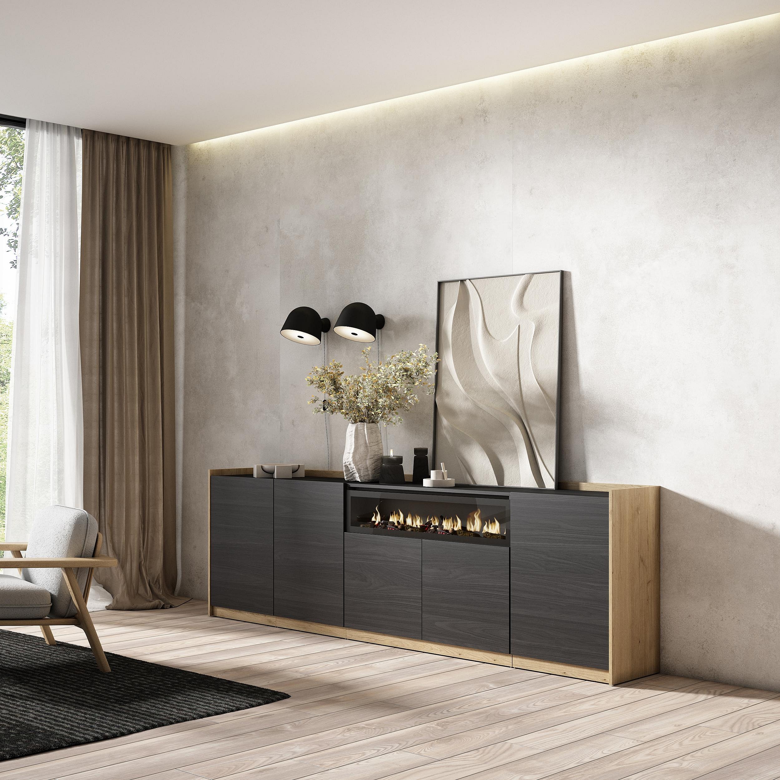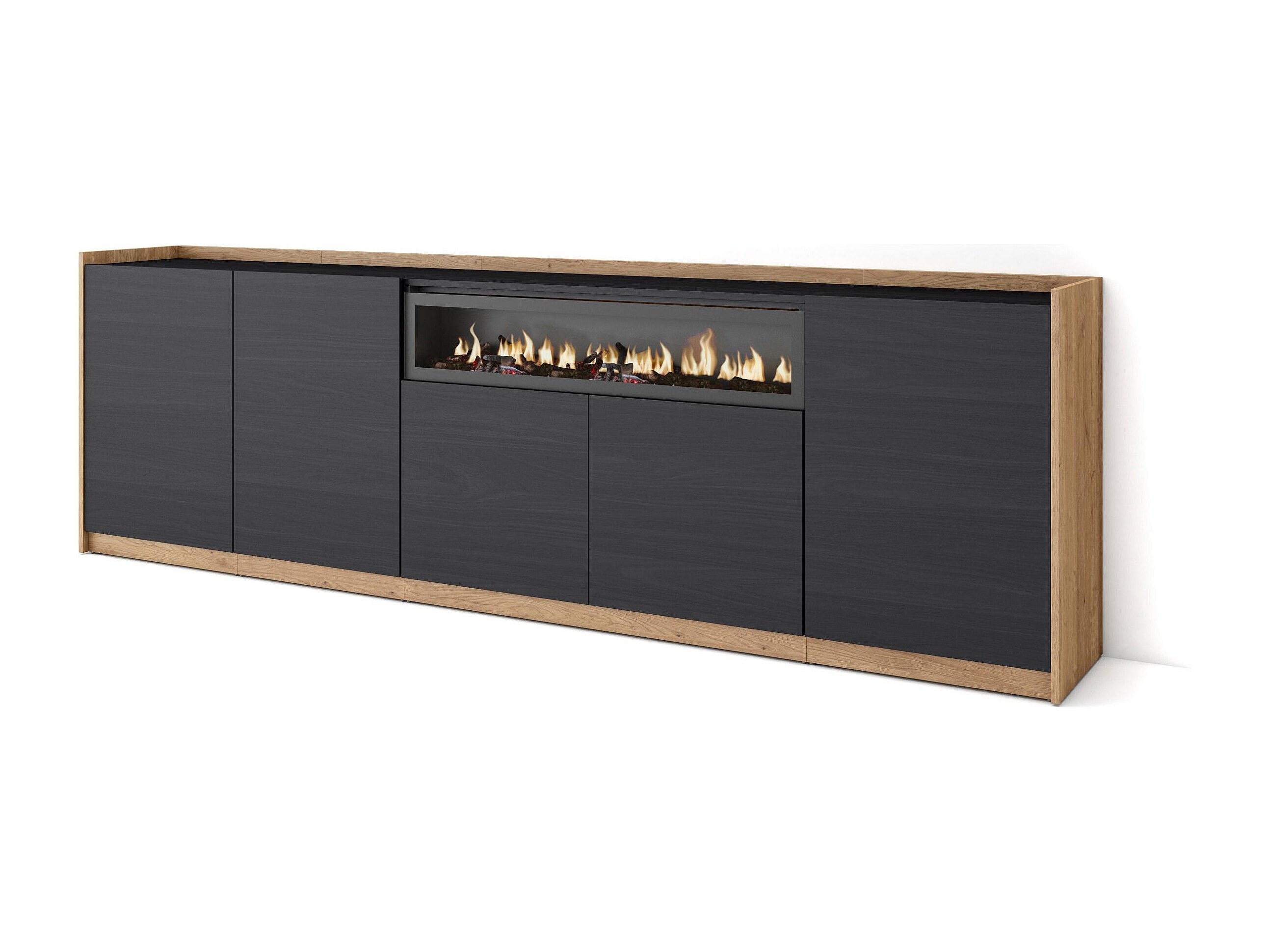 Dressoir, Opbergkast, 260x80x37 cm, 5 Deuren, Elektrische haard, Zwart/Eiken