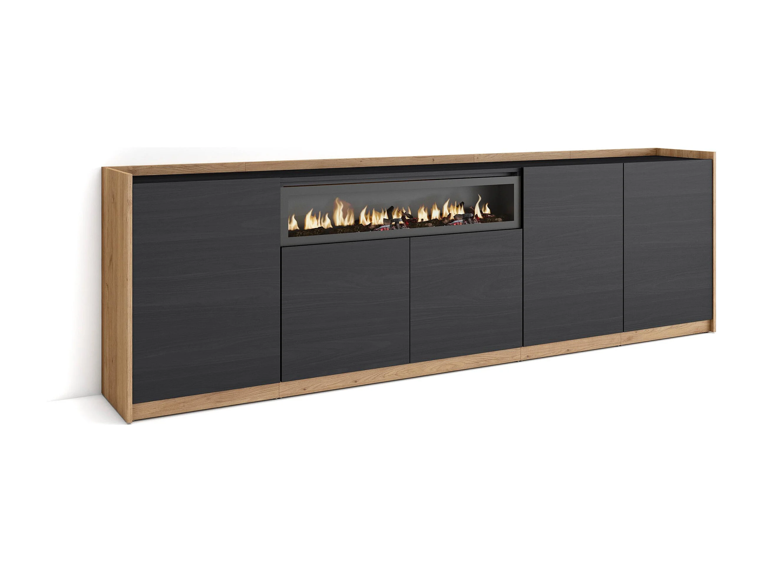 Dressoir, Opbergkast, 260x80x37 cm, 5 Deuren, Elektrische haard, Zwart/Eiken