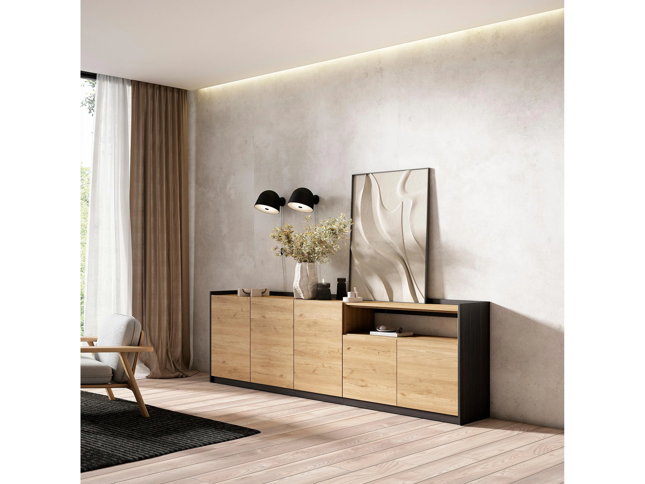 Dressoir, Opbergkast, 260x80x37 cm, 5 Deuren, Woonkamer, hal, Eiken/Zwart