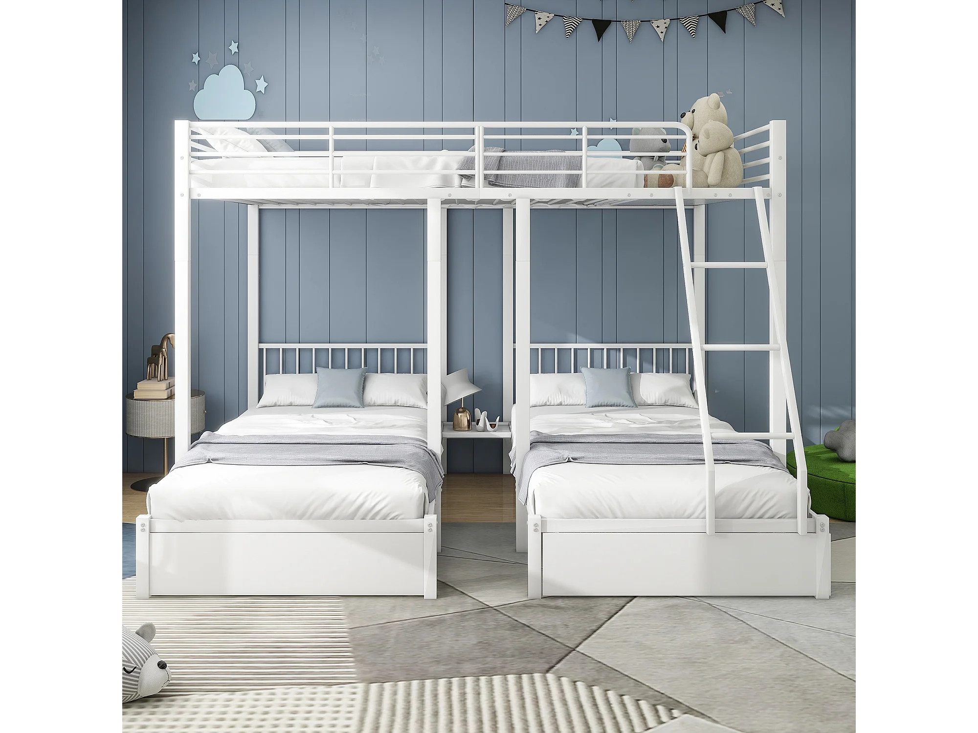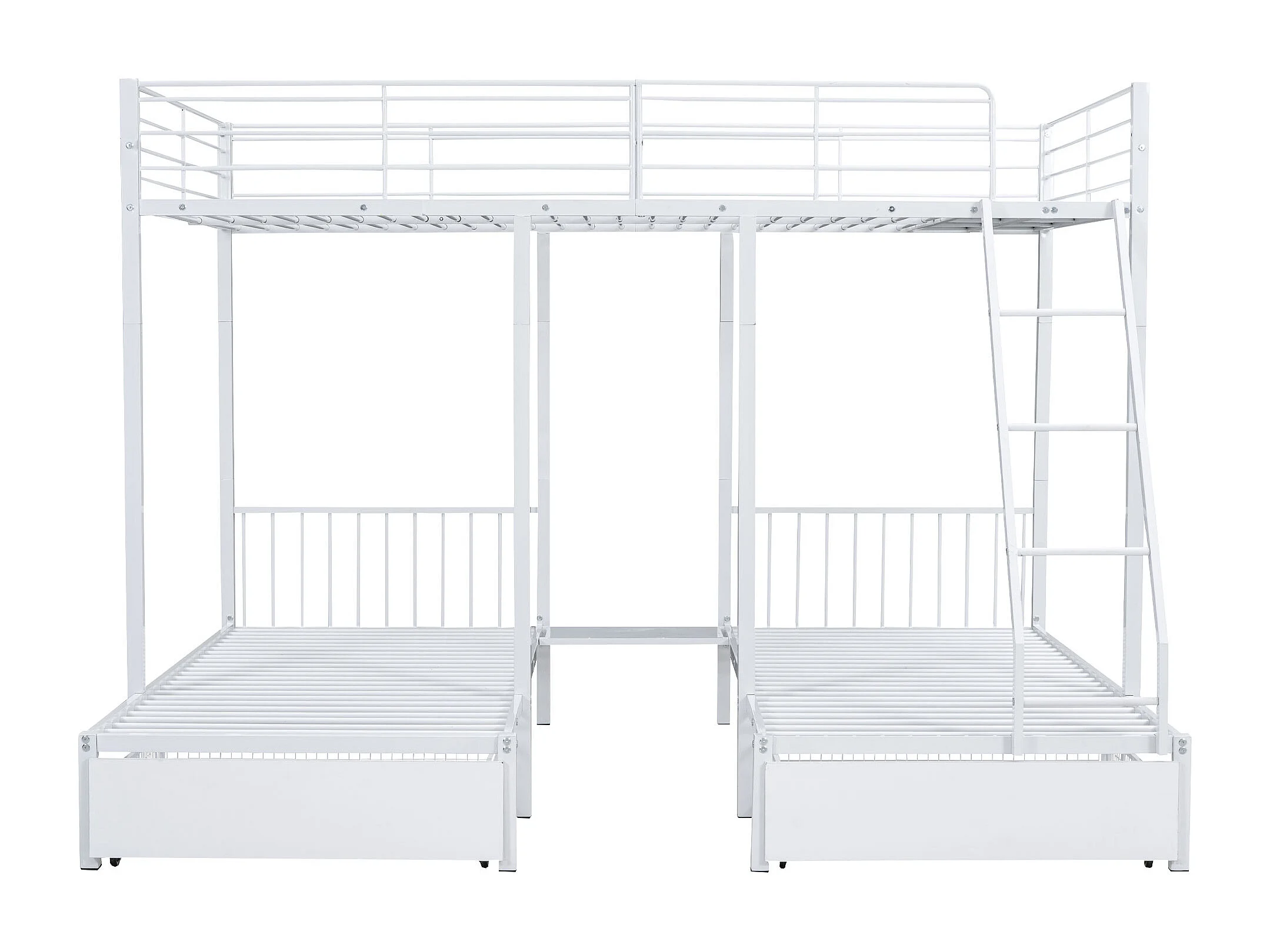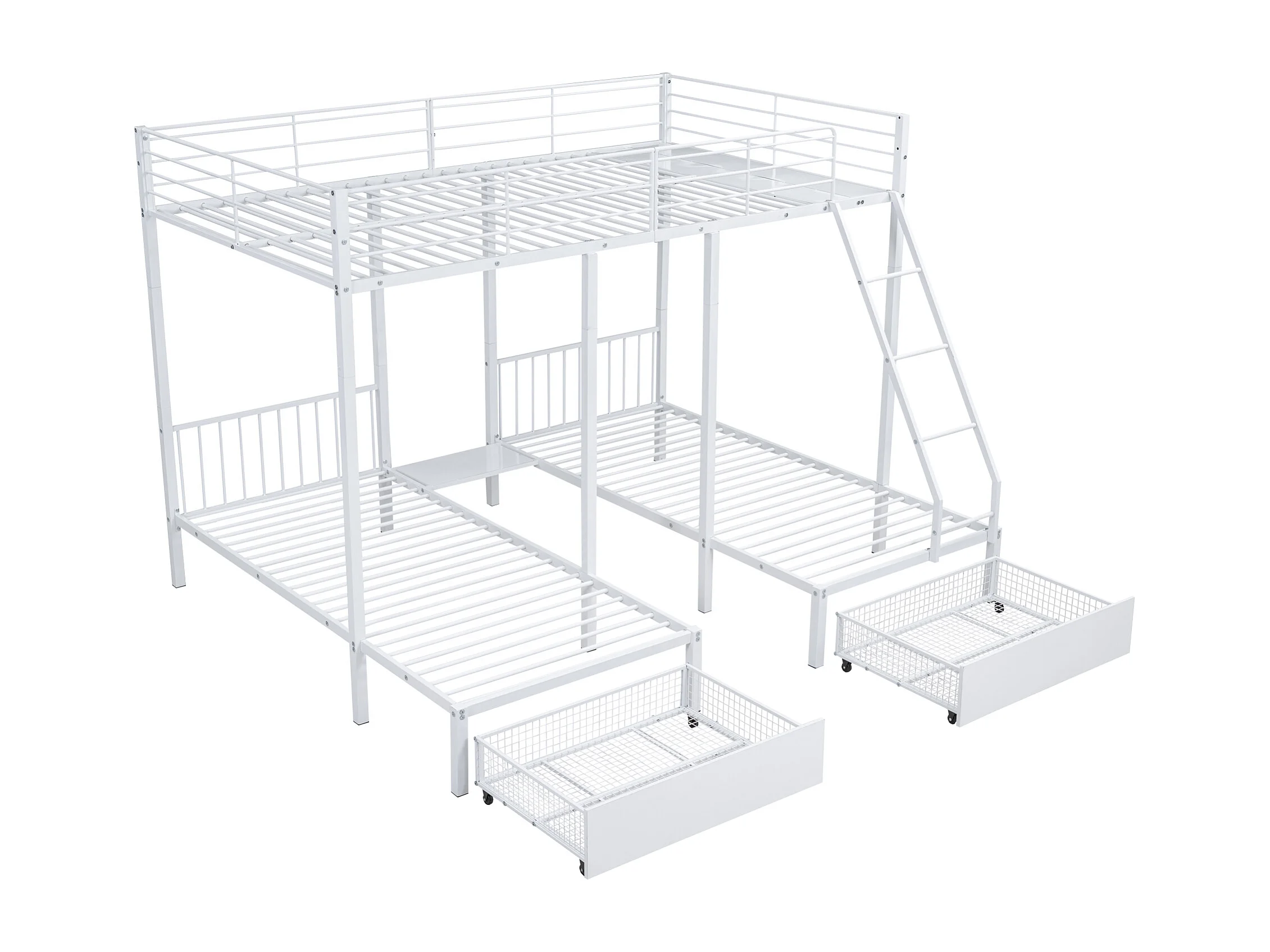 Driepersoons stapelbed met lade, tweepersoonsbed (140x200cm) en eenpersoonsbedden (90x200cm), metaal, wit, matras niet inbegrepen