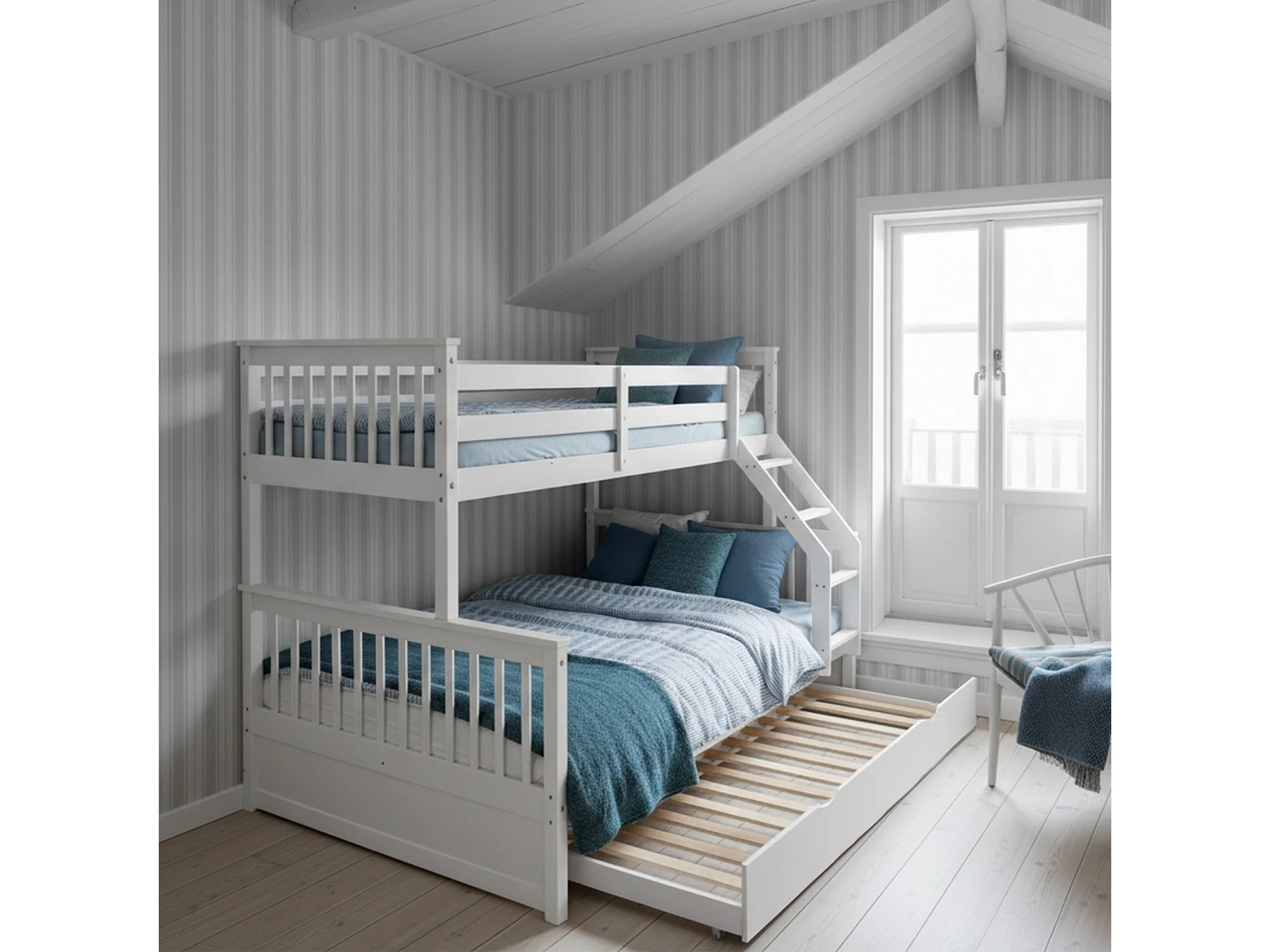 Drievoudig stapelbed + onderschuifbed hout wit 135x190/90x190cm