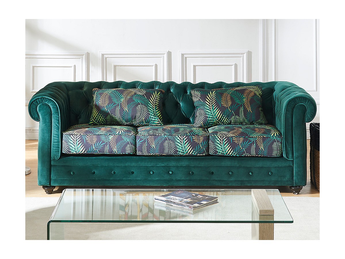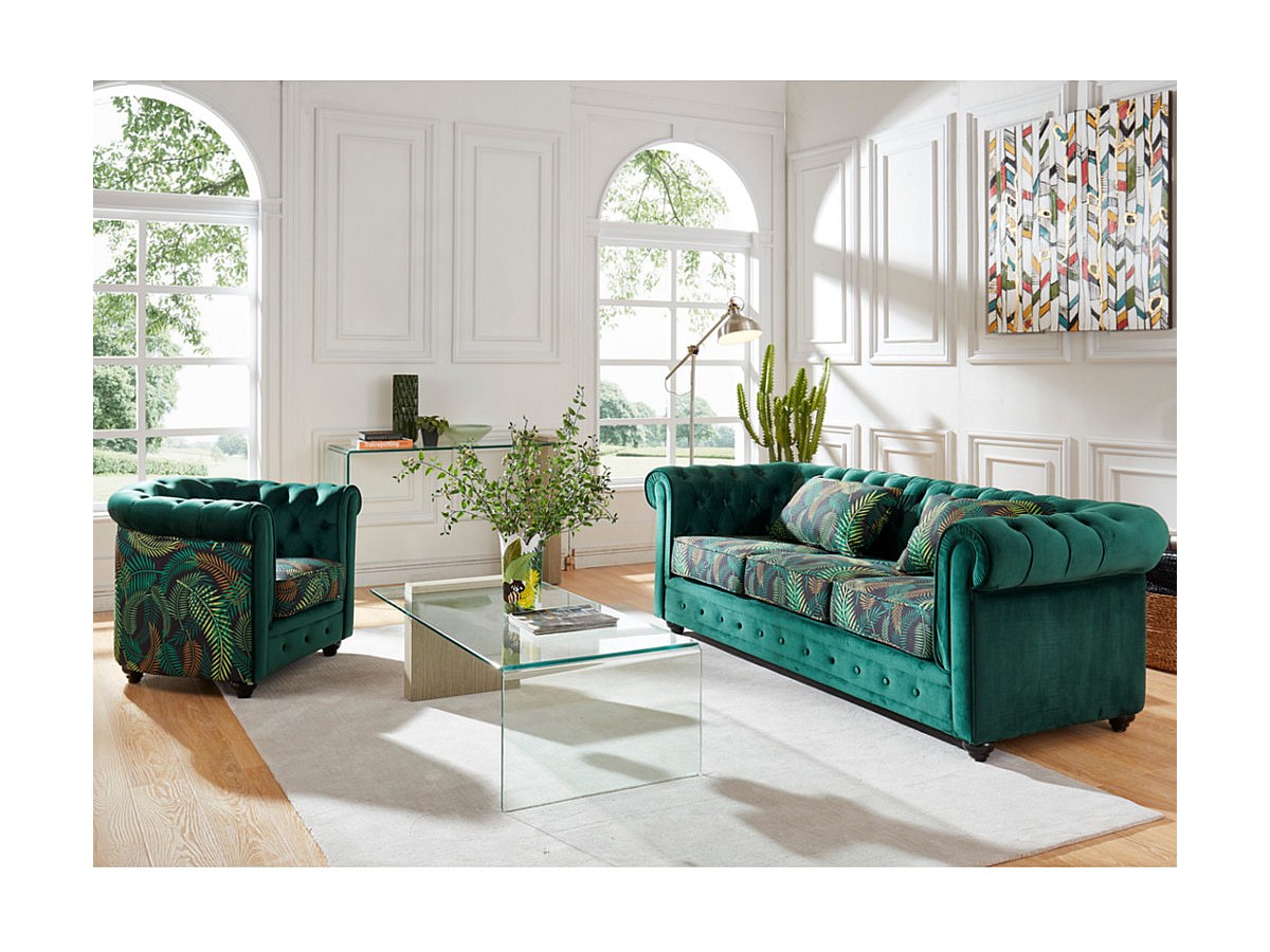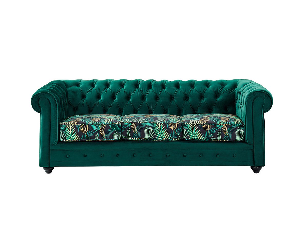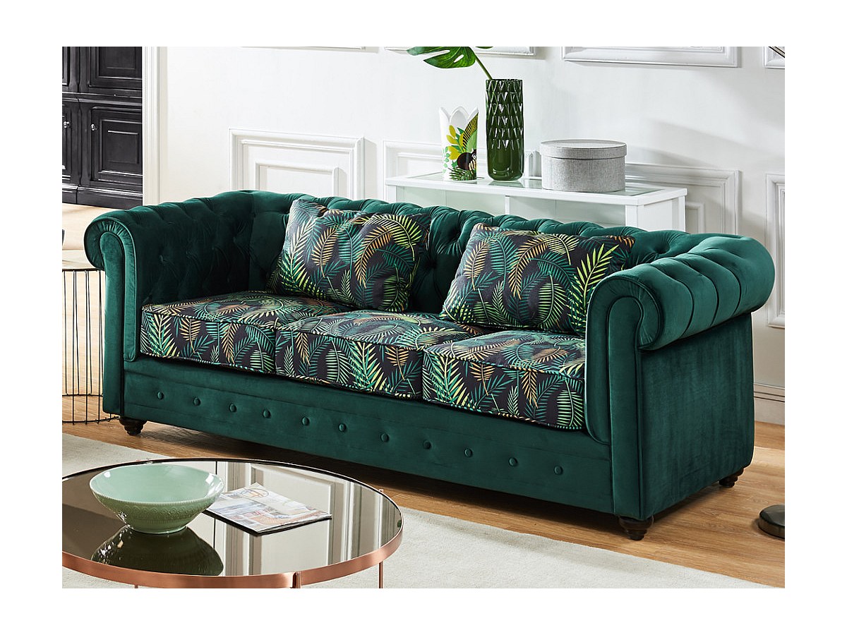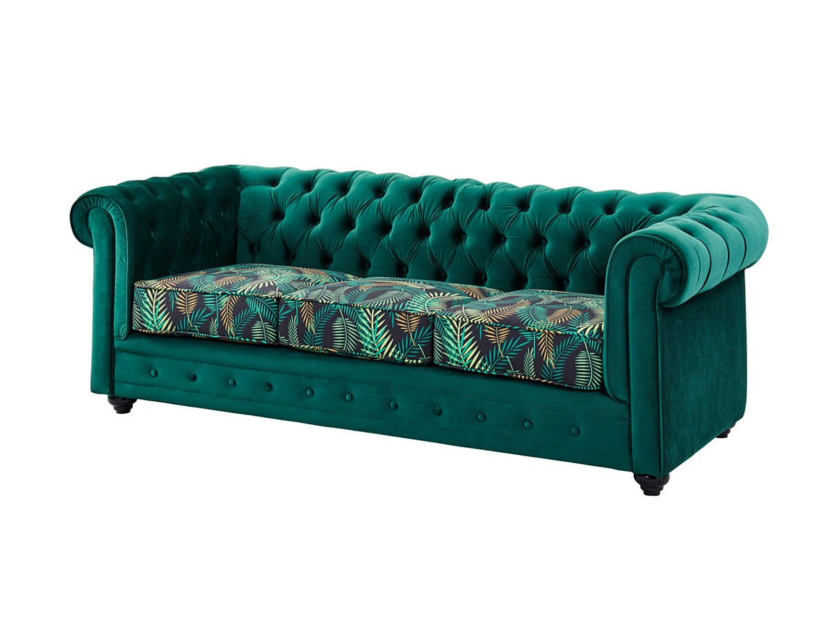 Driezitsbank CHESTERFIELD - Fluweel groen en stof met tropische print