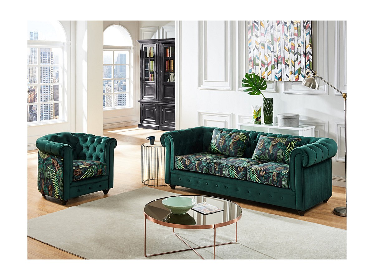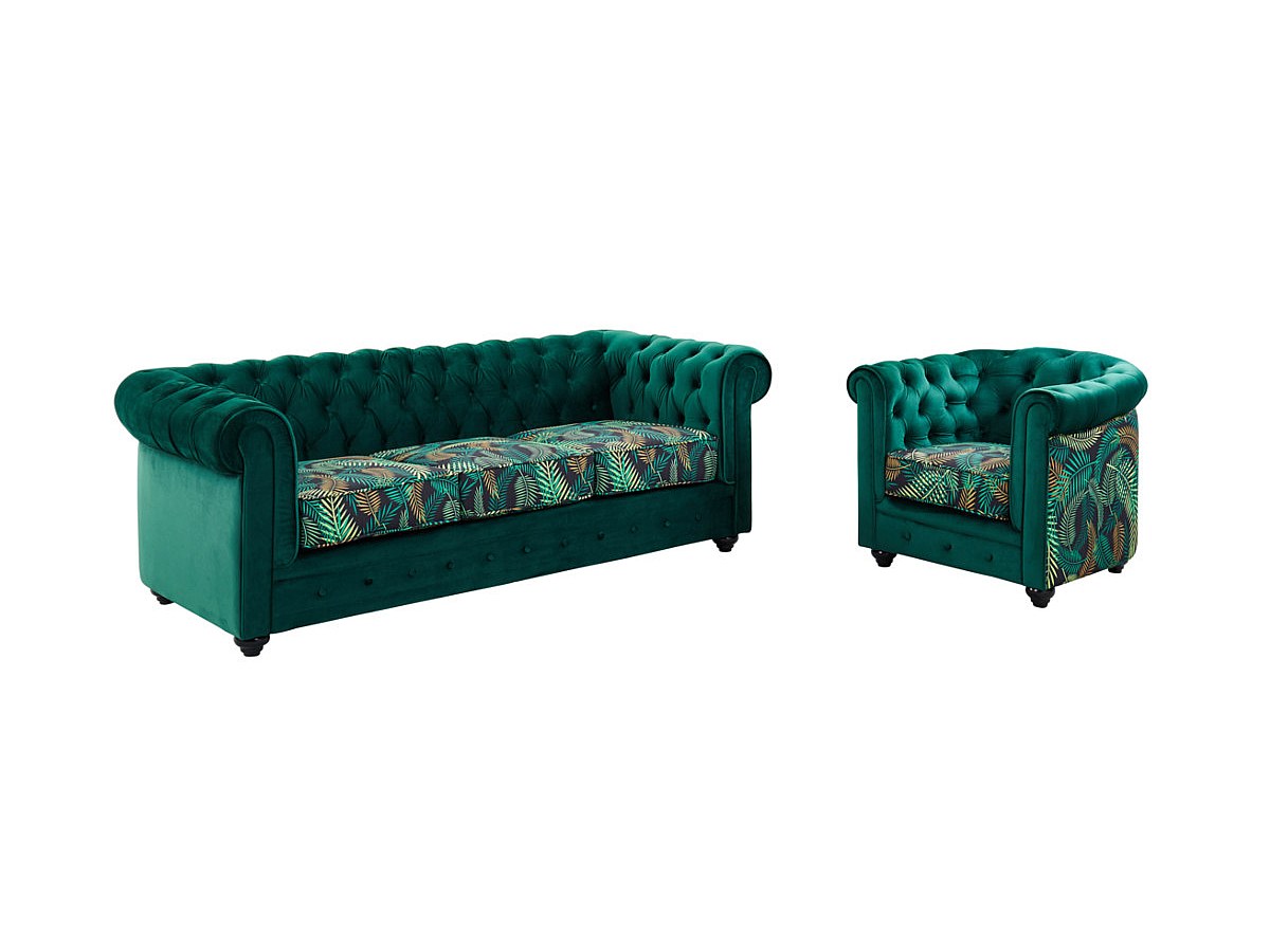 Driezitsbank en fauteuil CHESTERFIELD - Fluweel groen en stof met tropische print