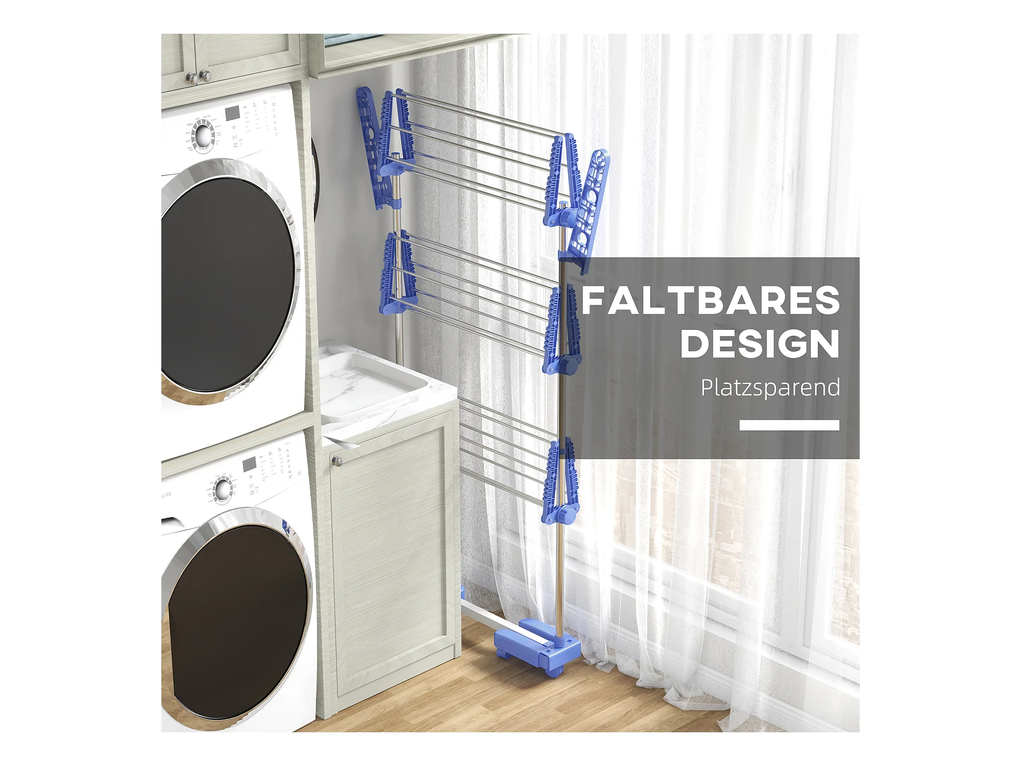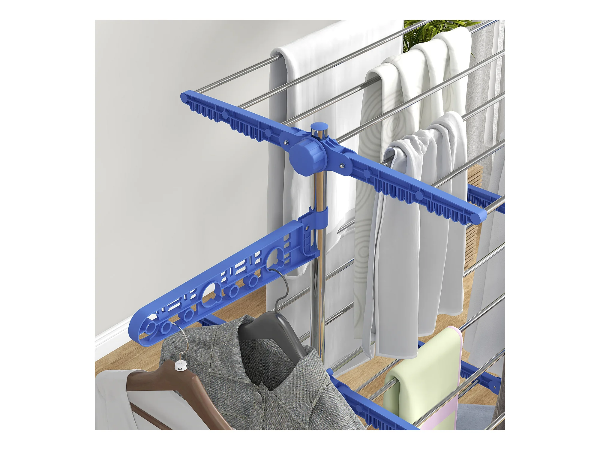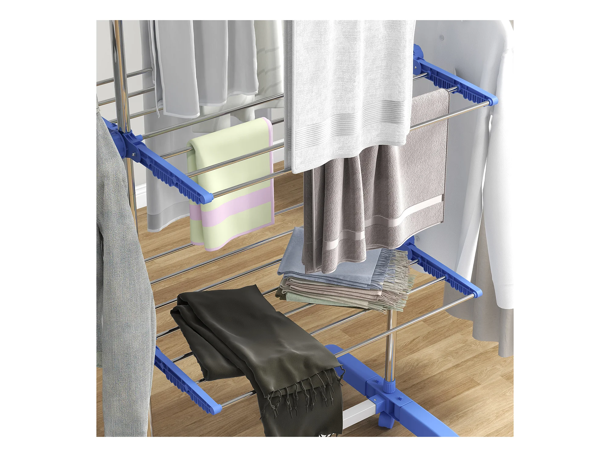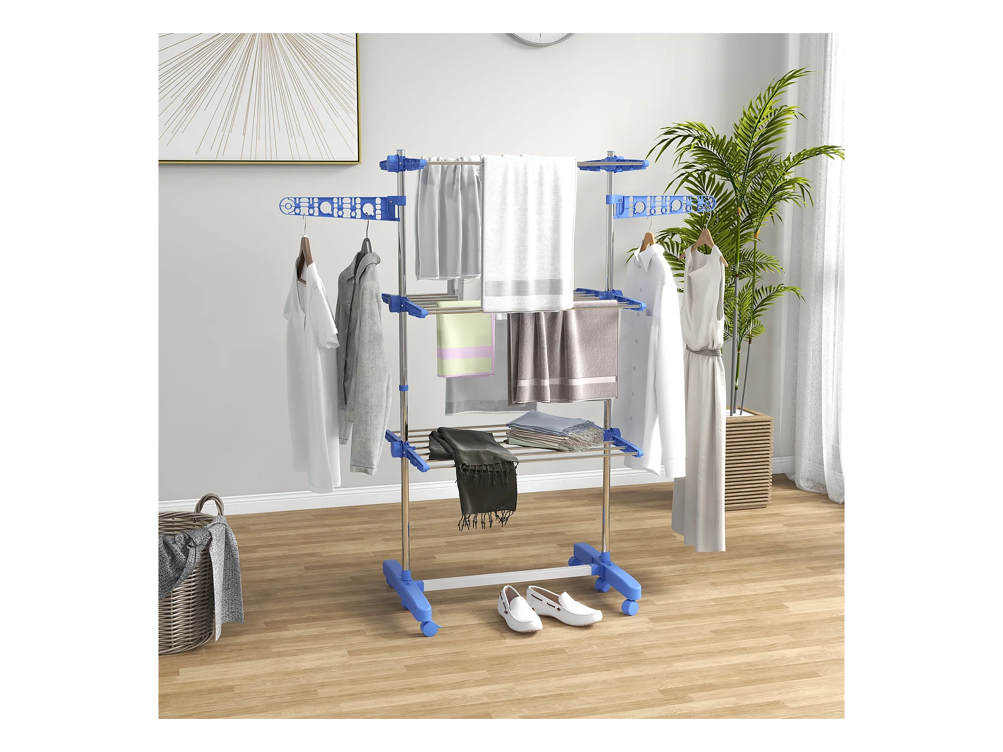 Droger op wielen, 3 niveaus met zijvleugels, staal, blauw (142x55x152 cm)
