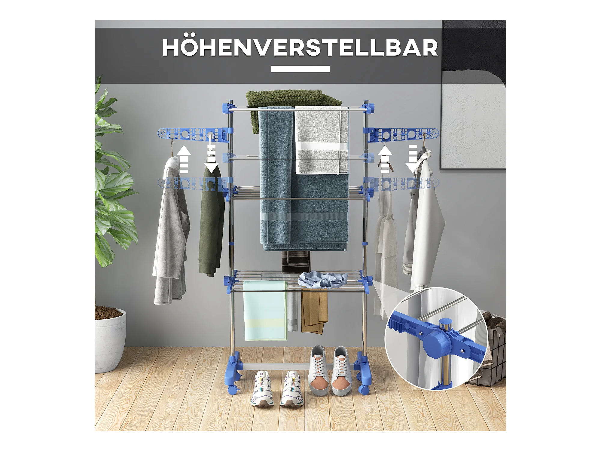 Torendroger met 4 niveaus, staal, blauw, uitschuifbaar met wielen, voor binnen- en buitengebruik (73x64x177 cm)