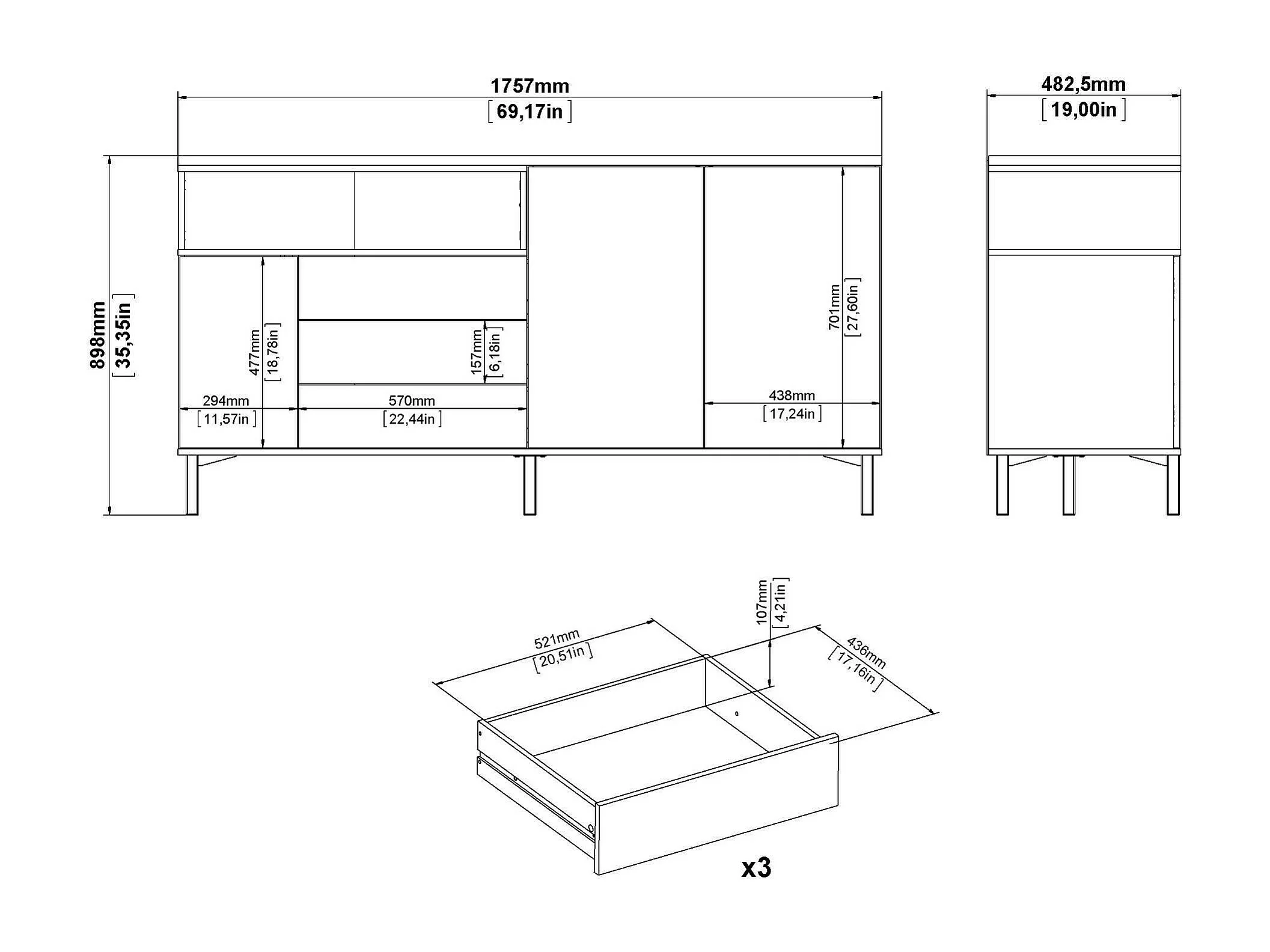 Dsardin dressoir, Woonkamerbuffet, Woonkamerdressoir, Keukenkast, 176x48 h90 cm, Wit en Eiken