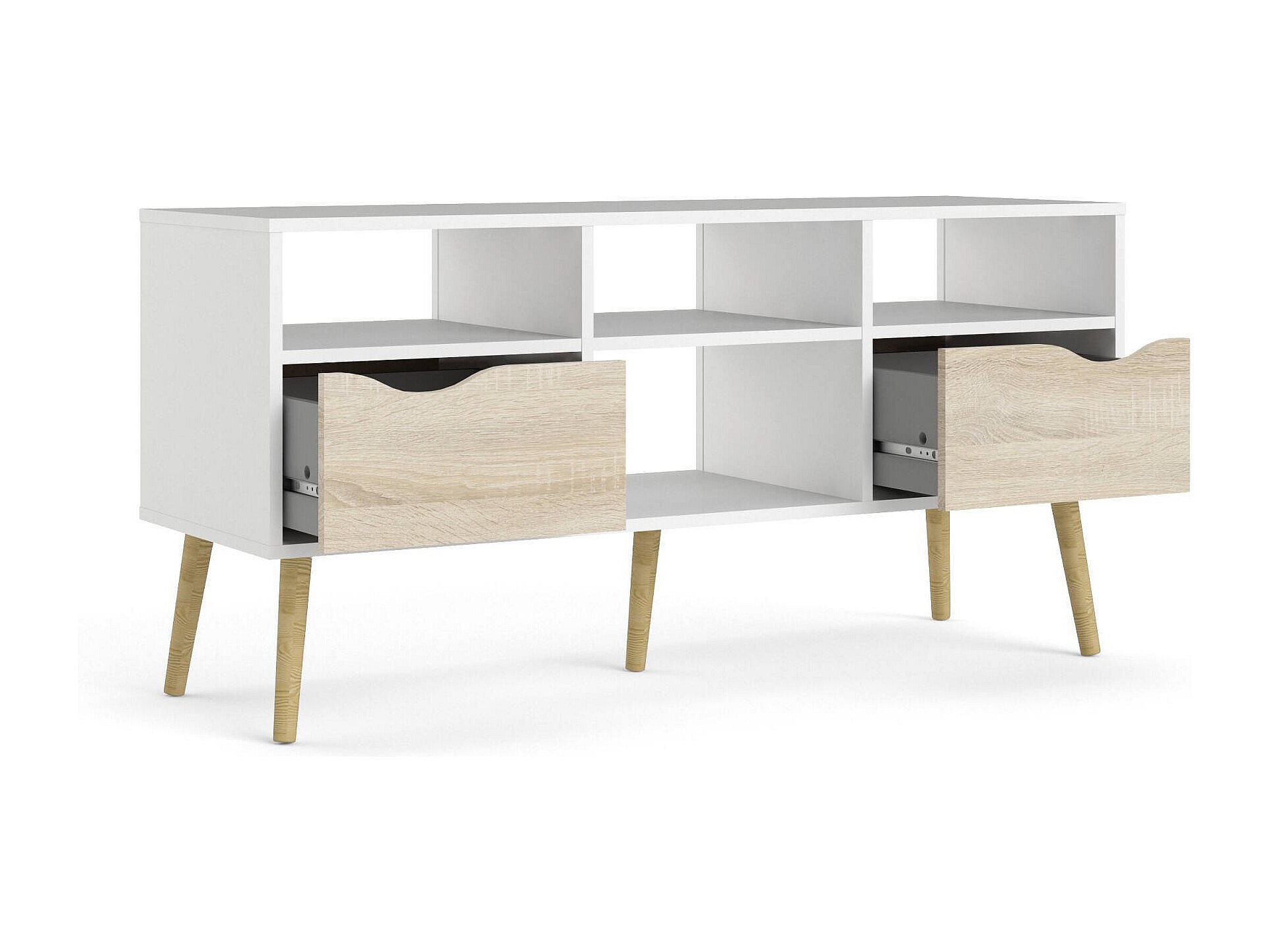 TV-STANDAARD - Woonkamerdressoir, Lage tv-kast, Uitgeruste muurbasis, 117x39 h57 cm, Wit en eiken. STRUCTUUR EN GEBRUIK - Moderne, innovatieve en functionele televisiestandaard - De keuze van de interne structuur waaruit deze woonkamerset bestaat, maakt het ontwerp van het meubelstuk modern, multifunctioneel, praktisch en ruimtebesparend - De bovenste plank is perfect voor het huisvesten van uw TV, een stereo-installatie of uw favoriete ornamenten - Multifunctioneel meubelstuk, perfect voor het inrichten van omgevingen met weinig ruimte. KWALITEIT EN DESIGN - Meubelartikel met een modern en elegant design, perfect voor het inrichten van een eigentijdse en lichte omgeving - Ideaal voor wie op zoek is naar functionaliteit en ruimtebesparende oplossingen, dit product is perfect voor huizen en appartementen van elke grootte - Twee jaar garantie vanaf de datum van aankoop. TECHNISCHE EIGENSCHAPPEN - Veelzijdig meubelaccessoire, ontworpen voor eenvoudige integratie met ander meubilair - Duurzame verpakking, ontworpen voor e-commerce - Materiaal: melamine spaanplaat - Aanvullende informatie: EPA 40 CFR TSCA gecertificeerd artikel - Formaldehyde-afgifte voldoet aan IOS-richtlijnen /MAT/0181/EN 16612 - Gedemonteerd - Voorzien van montagekit - Twee lades - Voorzien van kabelgat. AFMETINGEN IN CM - TV-meubel: Lengte: 117,2 Breedte: 39,1 Hoogte: 57,4 - Extra afmetingen: Lade-opening: 17,3 cm