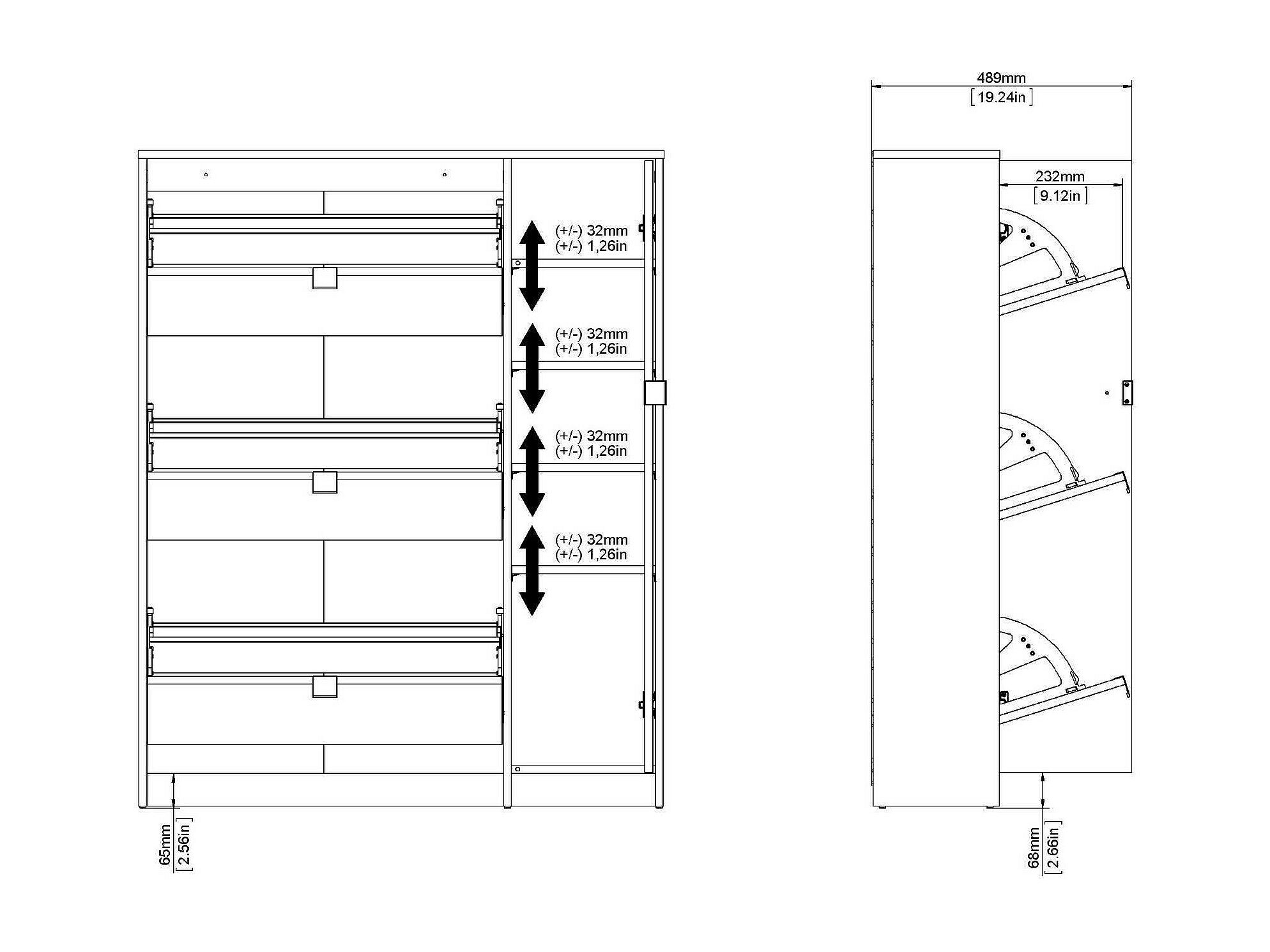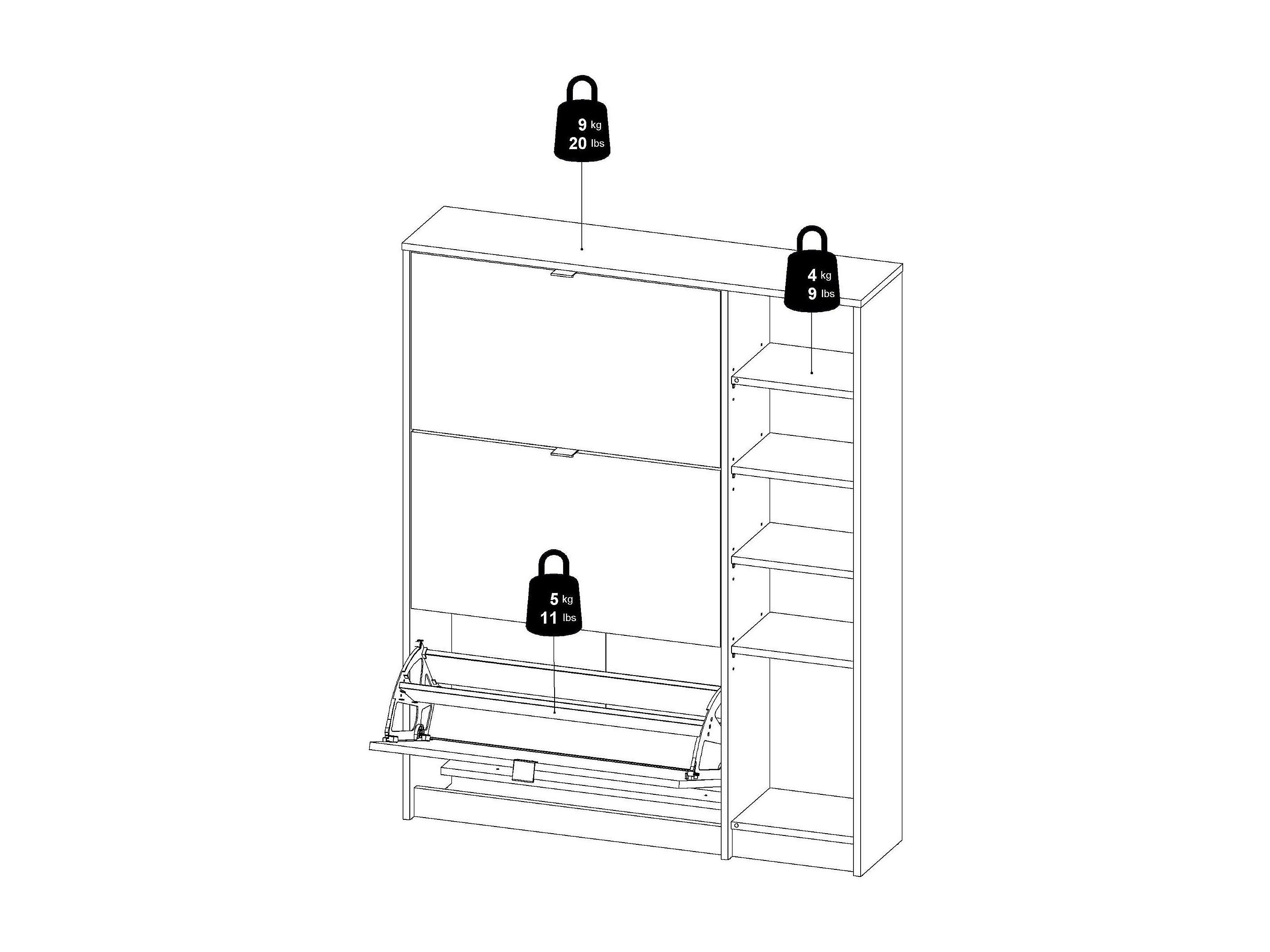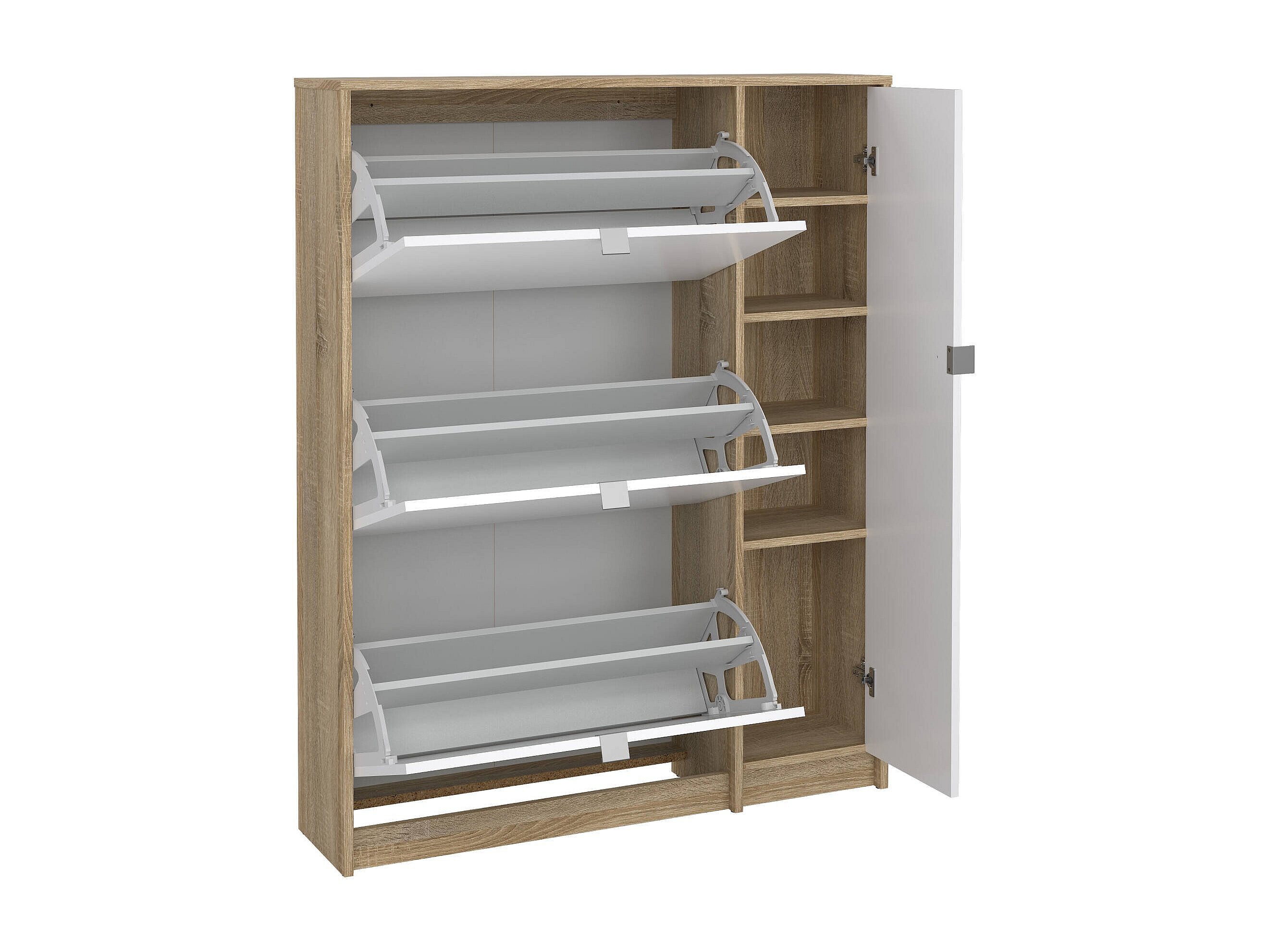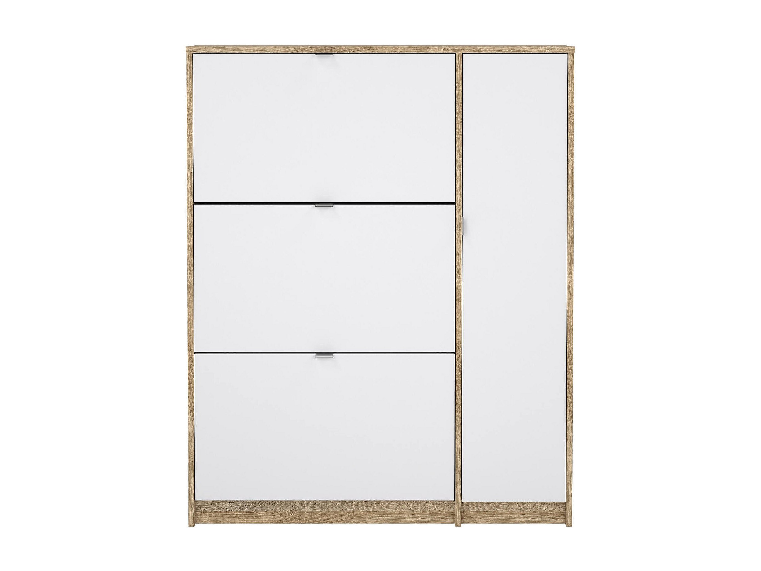 SCHOENENREK - Schoenenrek, Multifunctionele entreekast, Schoenenkast, 99x24 h124 cm, Eiken en Wit. STRUCTUUR EN GEBRUIK - Modern en ruimtebesparend schoenenrek, ideaal voor het opbergen van elk type schoenen - Multifunctioneel, elegant en functioneel meubelstuk, perfect voor plaatsing in de entree, gang, wasruimte, badkamer, kast, garage, slaapkamer , balkon, terras of entree - Multifunctionele kast, ook perfect voor het opbergen van voorwerpen en gereedschap - Praktisch en netjes schoenenrek, een comfortabel toevluchtsoord voor uw schoenen, ontworpen om de orde en elegantie in uw entree te behouden. KWALITEIT EN DESIGN - Meubelartikel met een modern en elegant design, perfect voor het inrichten van een eigentijdse en lichte omgeving - Ideaal voor wie op zoek is naar functionaliteit en ruimtebesparende oplossingen, dit product is perfect voor huizen en appartementen van elke grootte - Twee jaar garantie vanaf de datum van aankoop. TECHNISCHE EIGENSCHAPPEN - Veelzijdig meubelaccessoire, ontworpen voor eenvoudige integratie met ander meubilair - Duurzame verpakking, ontworpen voor e-commerce - Materiaal: melamine spaanplaat - Aanvullende informatie: EPA 40 CFR TSCA gecertificeerd artikel - Formaldehyde-afgifte voldoet aan IOS-richtlijnen /MAT/0181/EN 16584 - Gedemonteerd - Voorzien van montageset - Drie dubbeldiepe draaideuren - Eén dubbeldiepe deur - Wandbevestiging niet nodig - 18 paar insteekschoenen. AFMETINGEN IN CM - Schoenenrek: Lengte: 98,8 Breedte: 24,05 Hoogte: 123,6 - Extra afmetingen: Deuropening: 23,1 cm