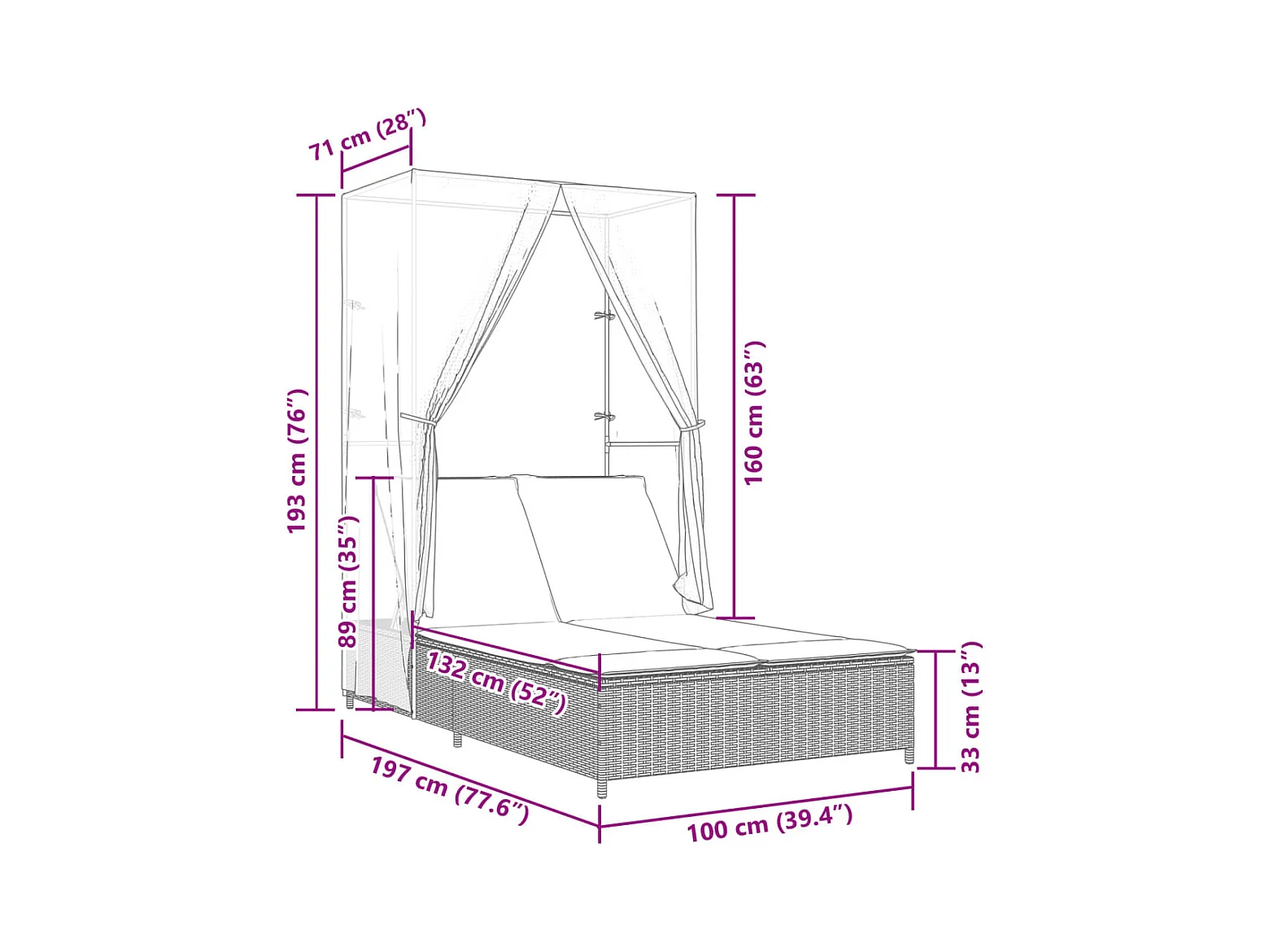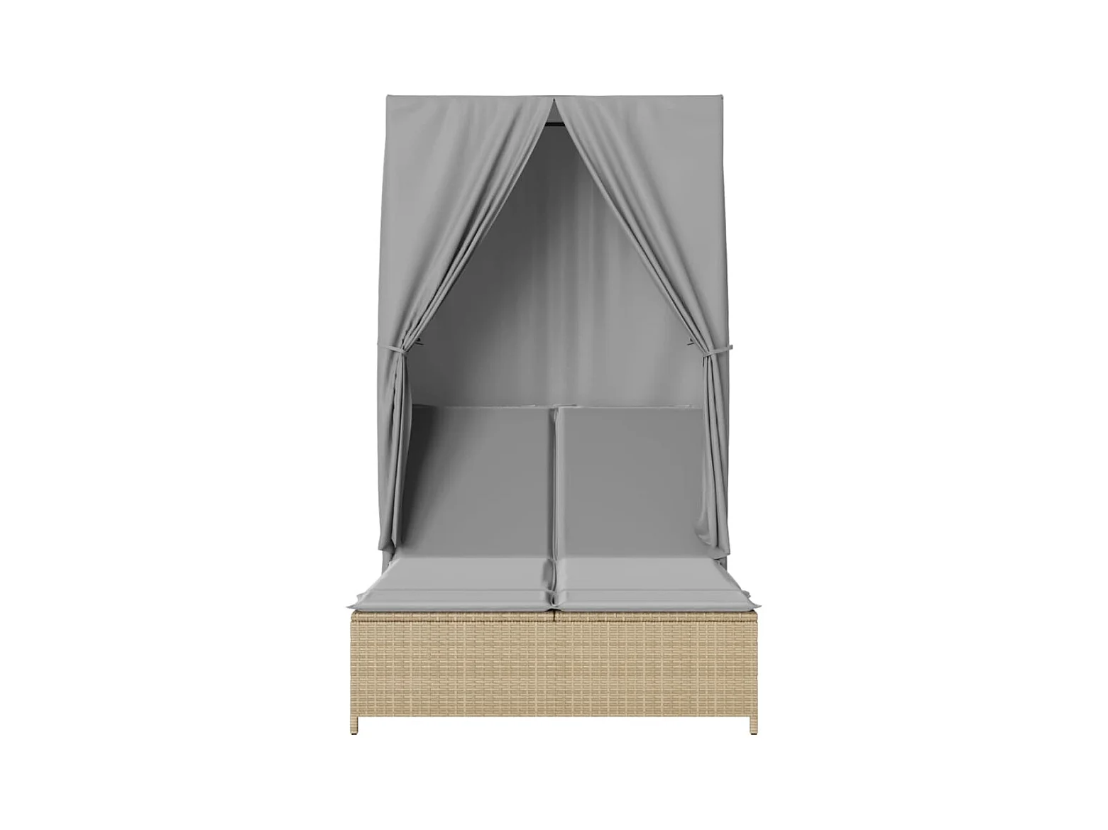 Dubbele chaise longue met dak en beige geweven harsgordijnen