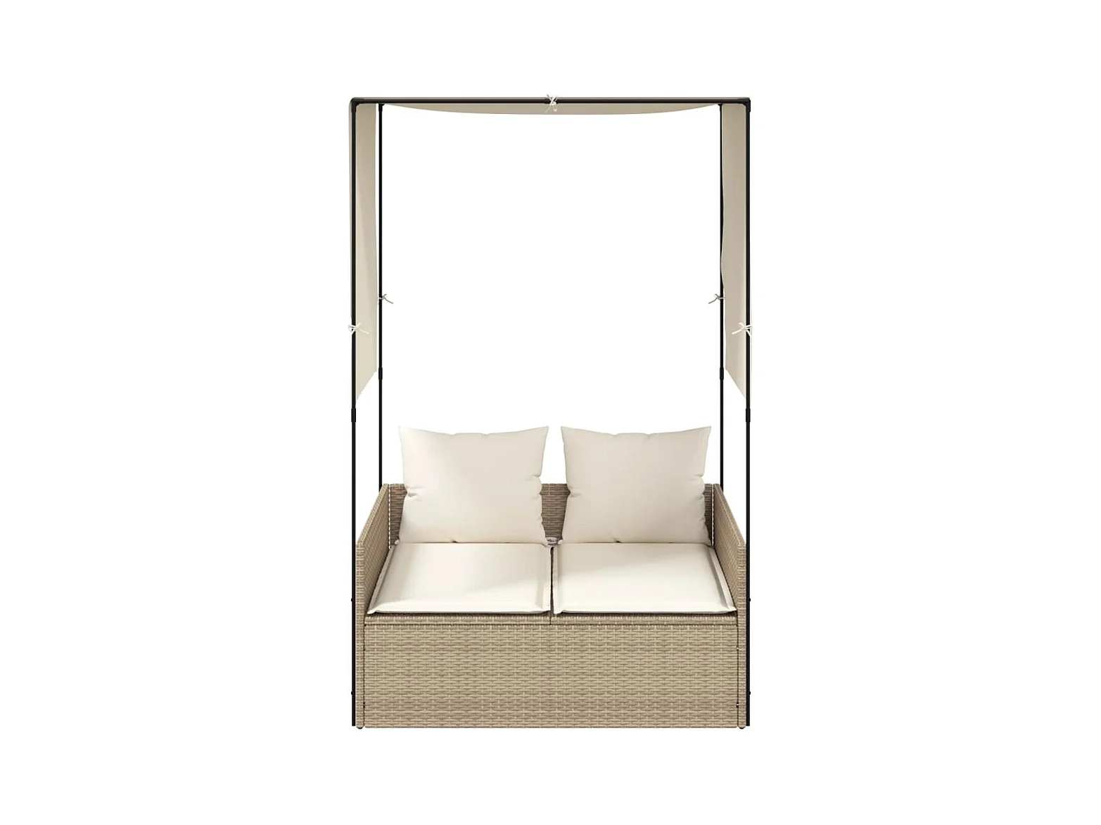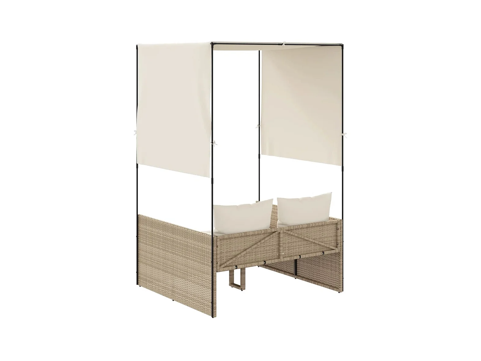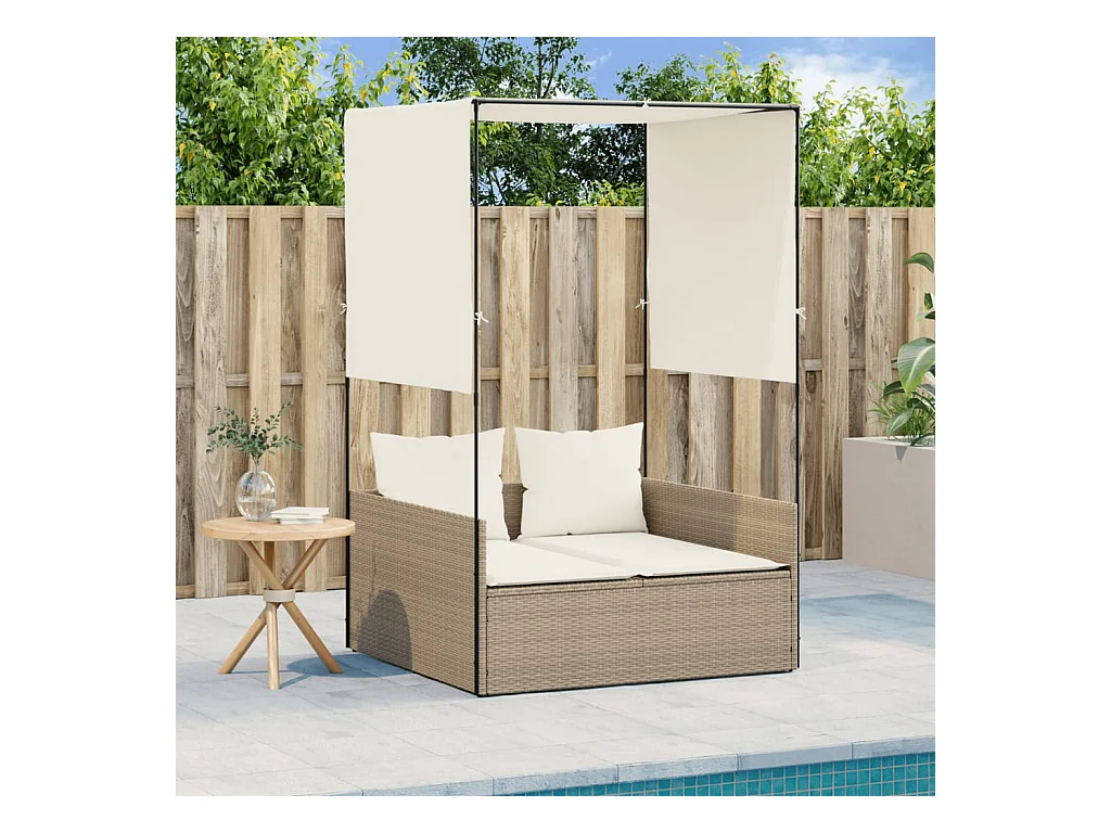 Dubbele chaise longue met dak en beige geweven harsgordijnen