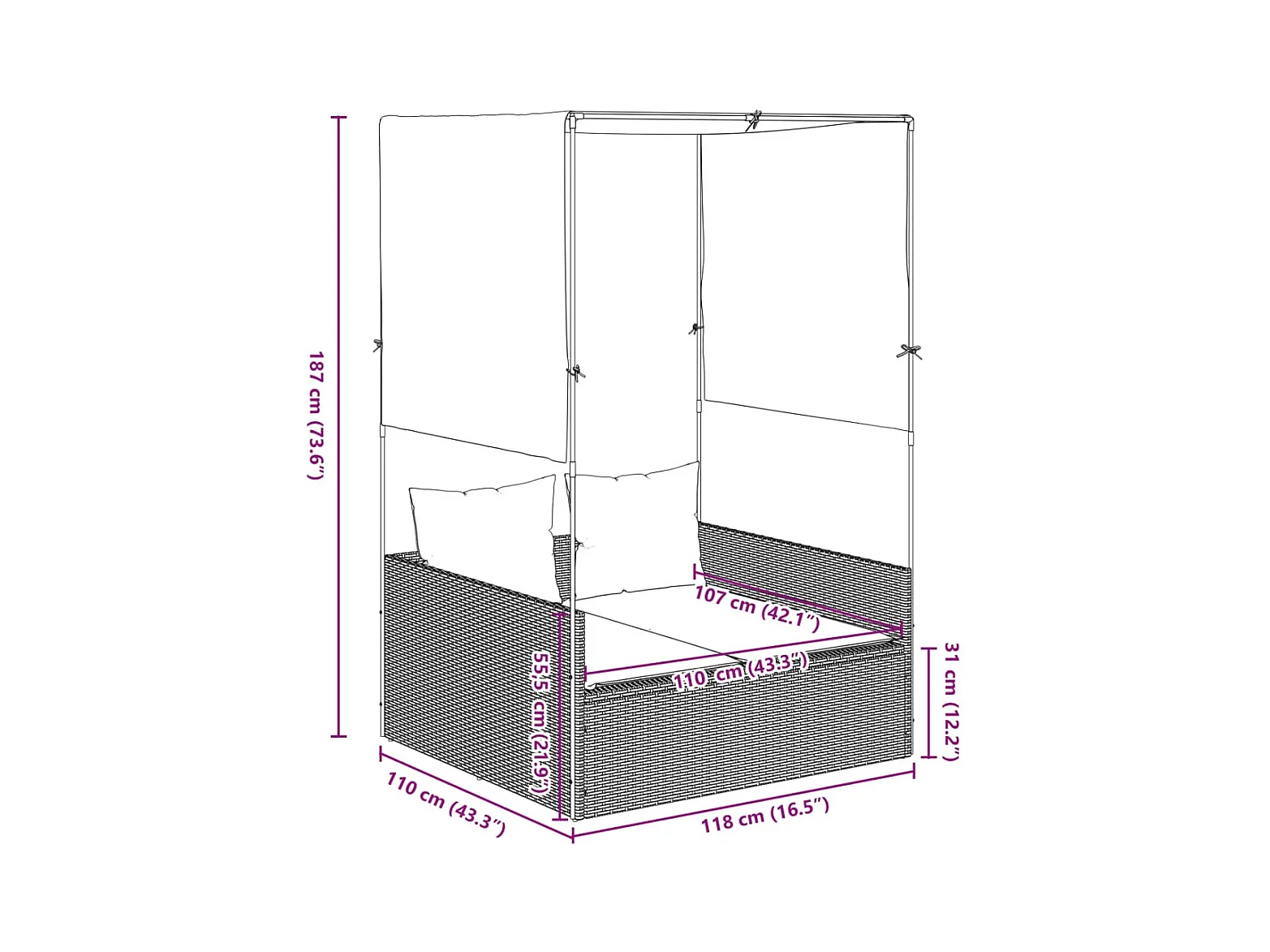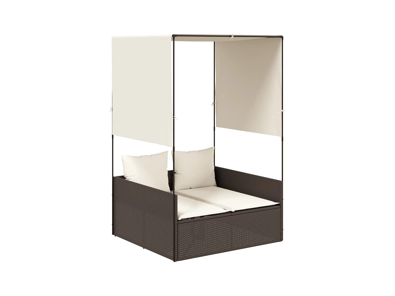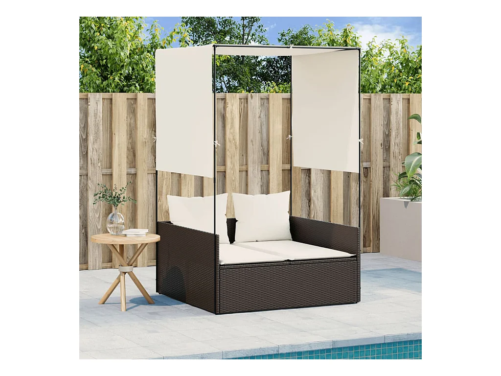 Dubbele chaise longue met dak en bruine geweven harsgordijnen