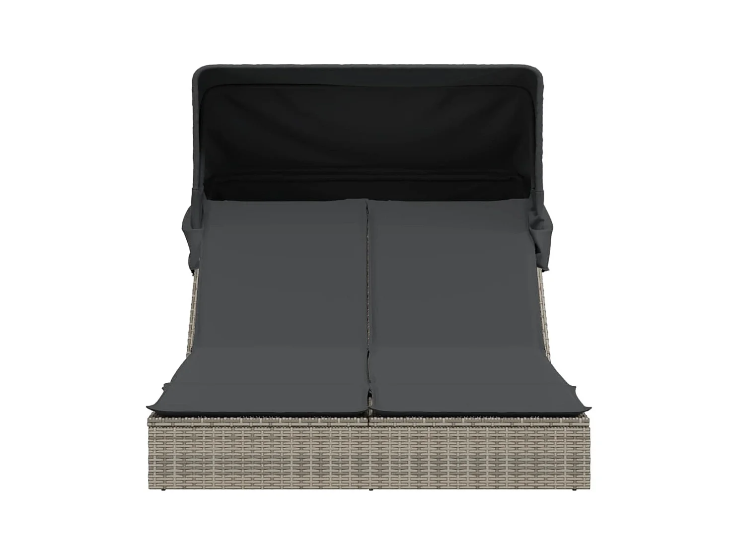 Dubbele chaise longue met zonnescherm en grijze kunsthars rieten kussens