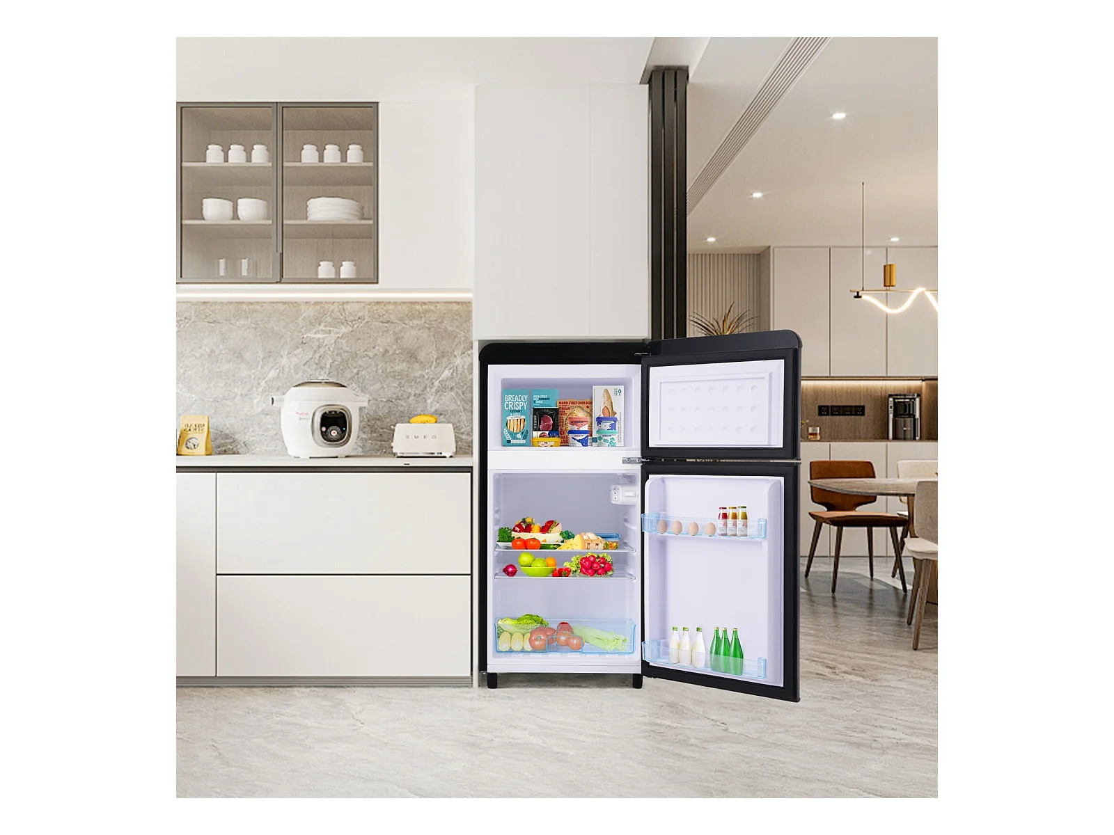 Minikoelkast Retro, 72L Totaal, 21L Congélateur, 51L Koelkoelkast, Energieklasse E, LED, Design Rétro, Zwart (45x44x91cm)