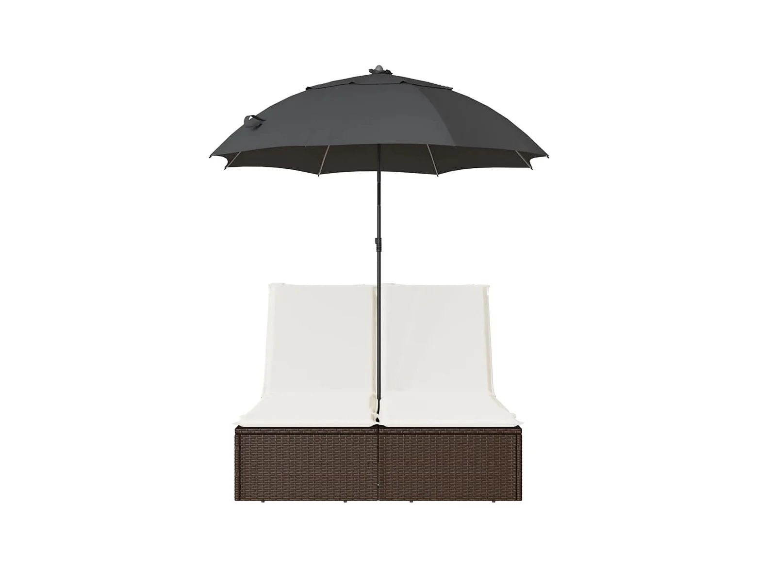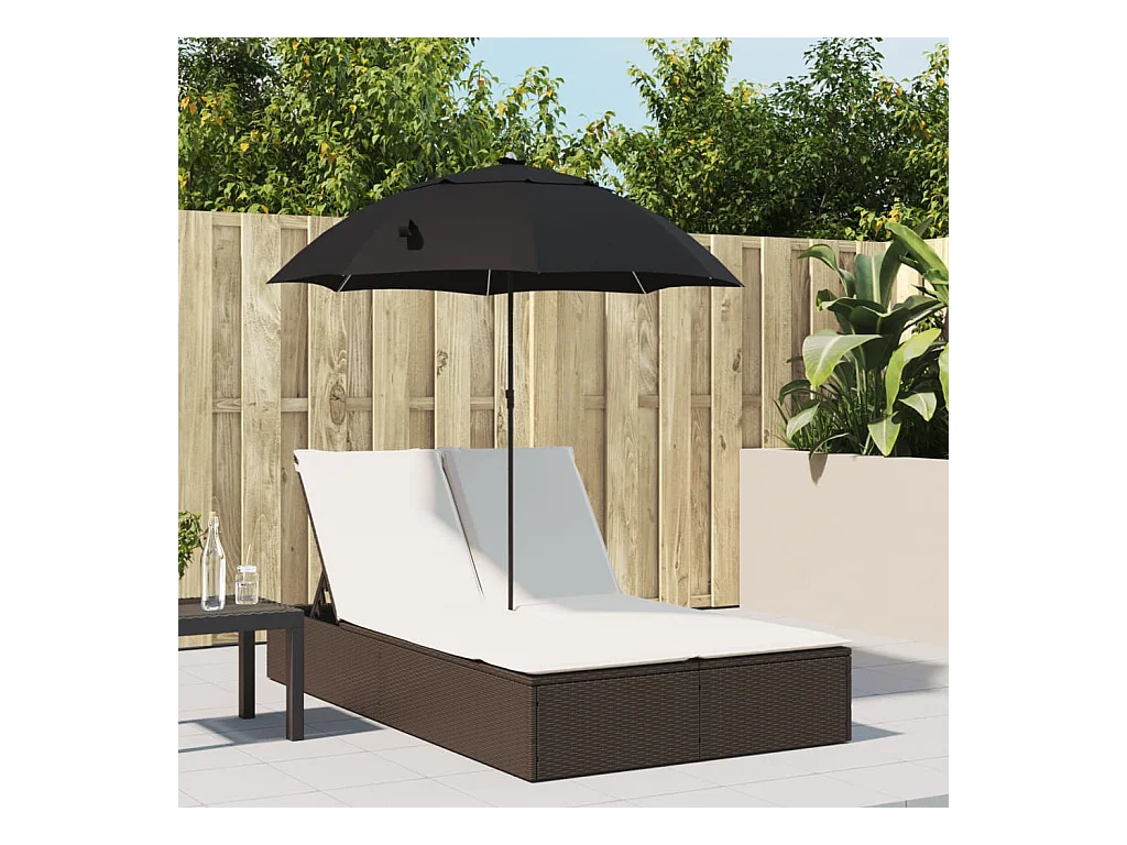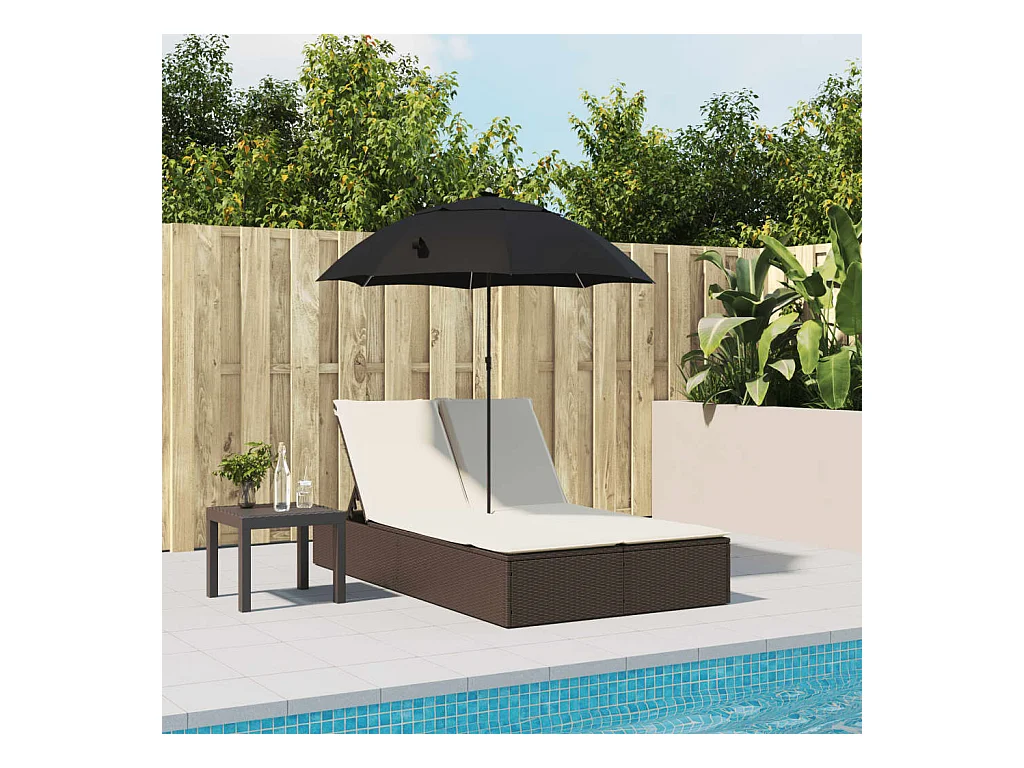 Dubbele loungestoel met kussens en bruine polyrotan parasol
