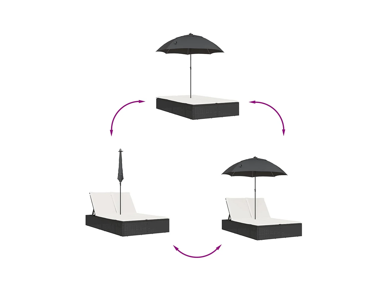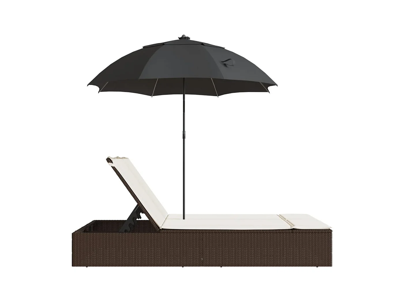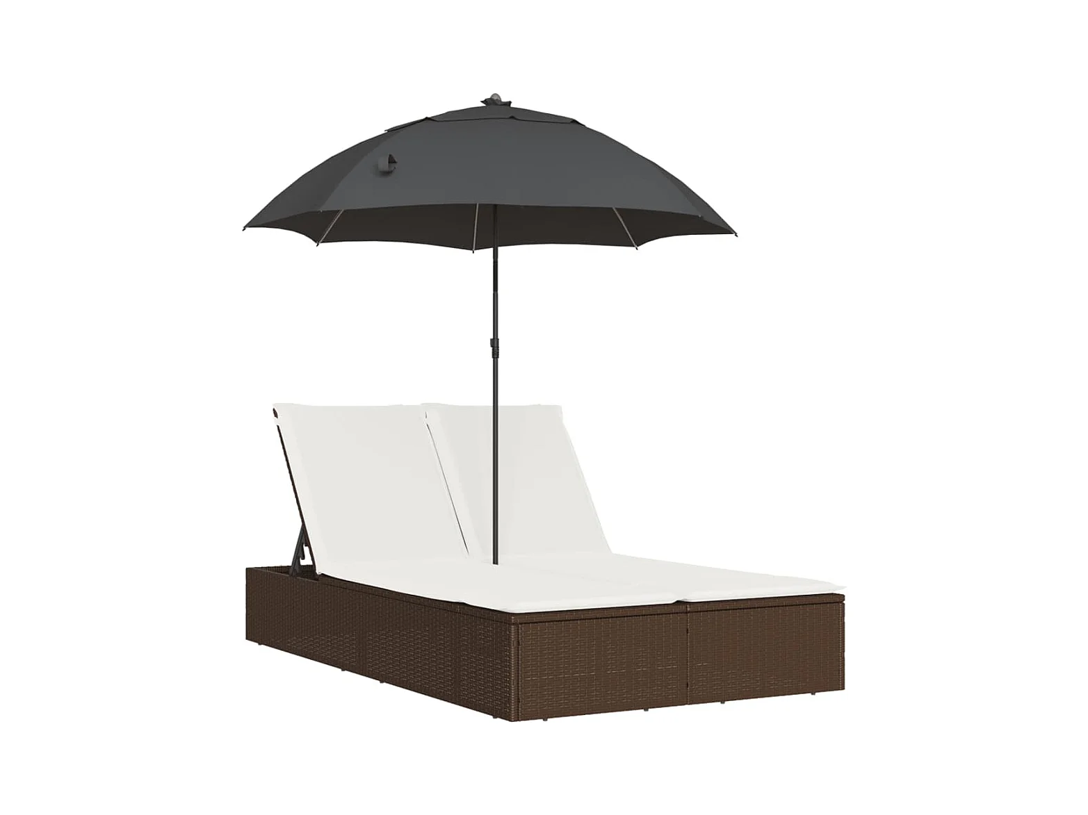 Dubbele loungestoel met kussens en bruine polyrotan parasol