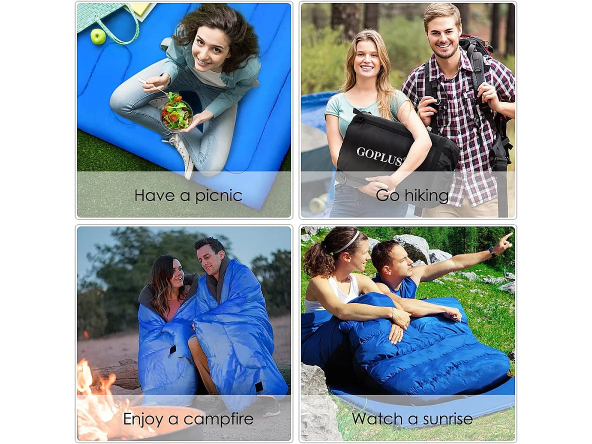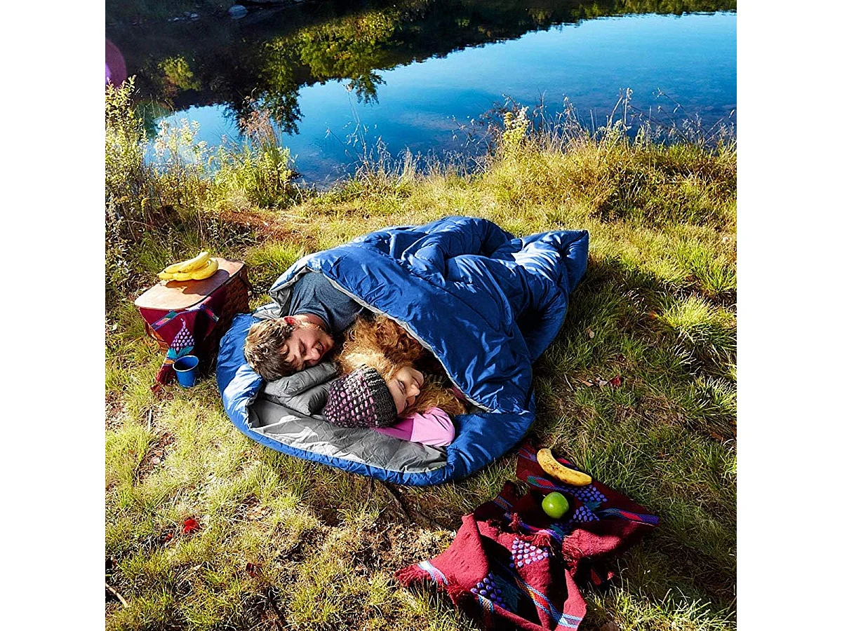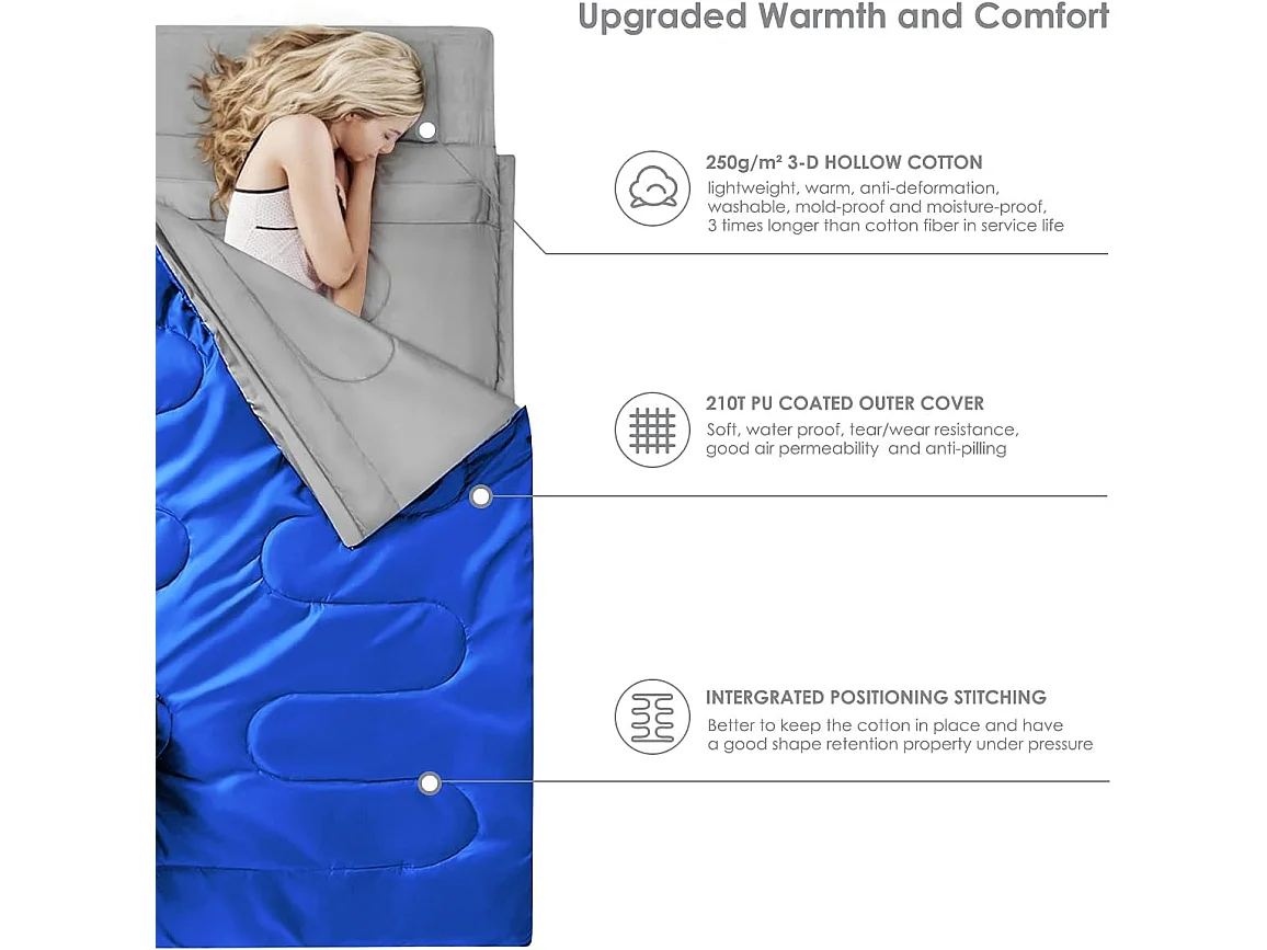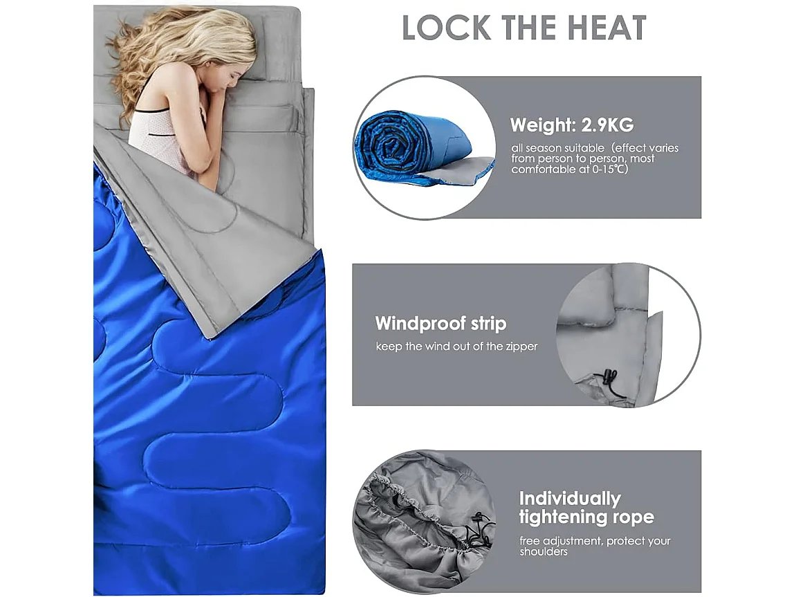 Dubbele slaapzak 2 persoons,220x150cm, waterdichte lichtgewicht slaapzak met 2 kussens en draagtas voor kamperen,wandelen en reizen (Blauw)AB5872