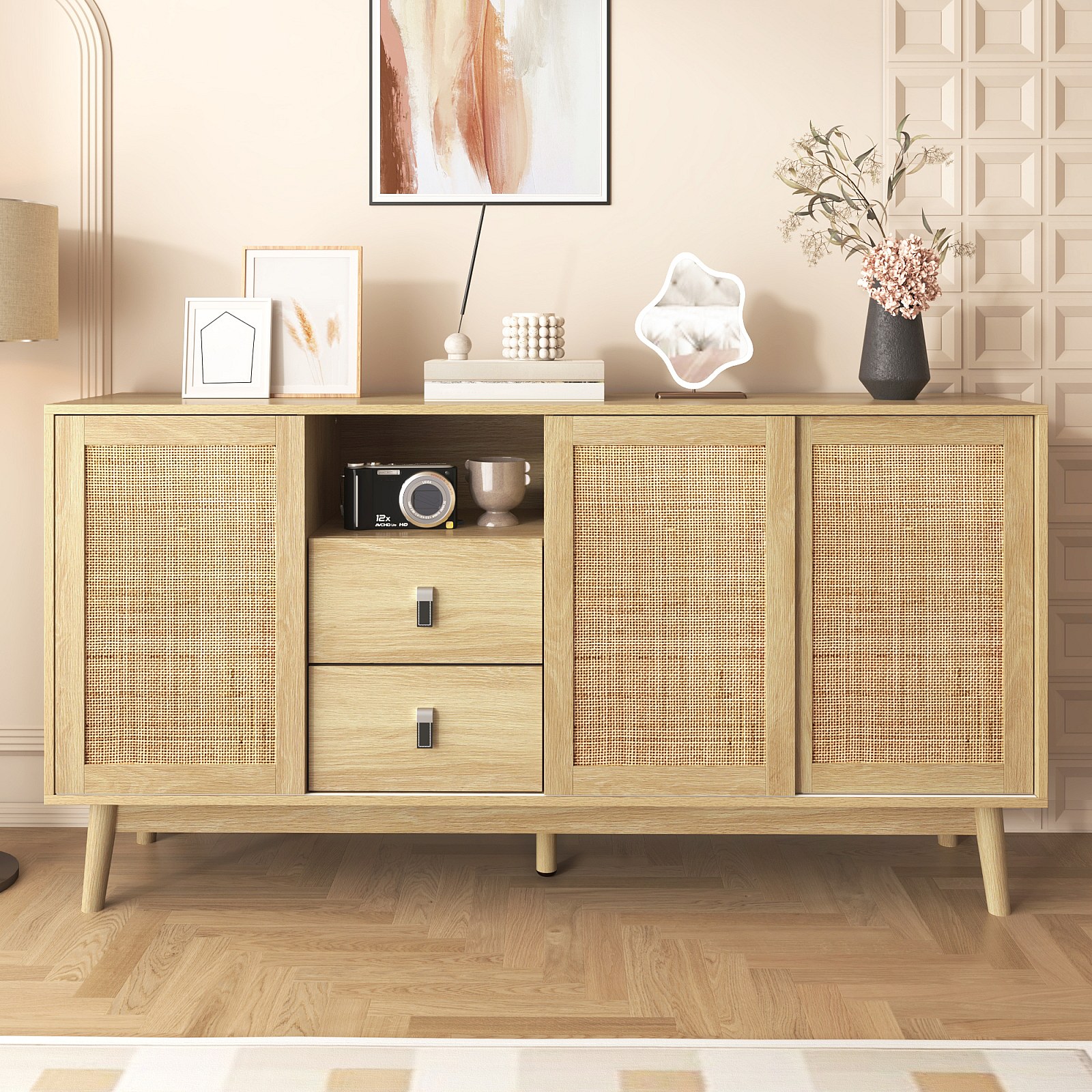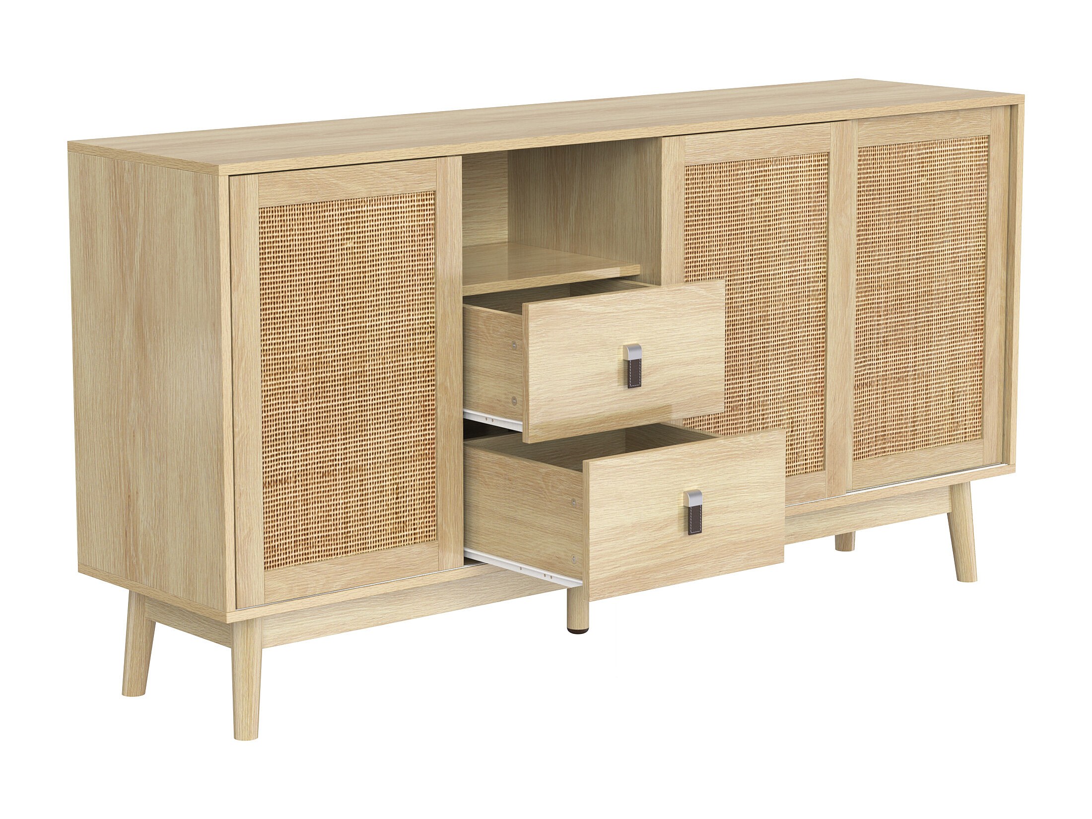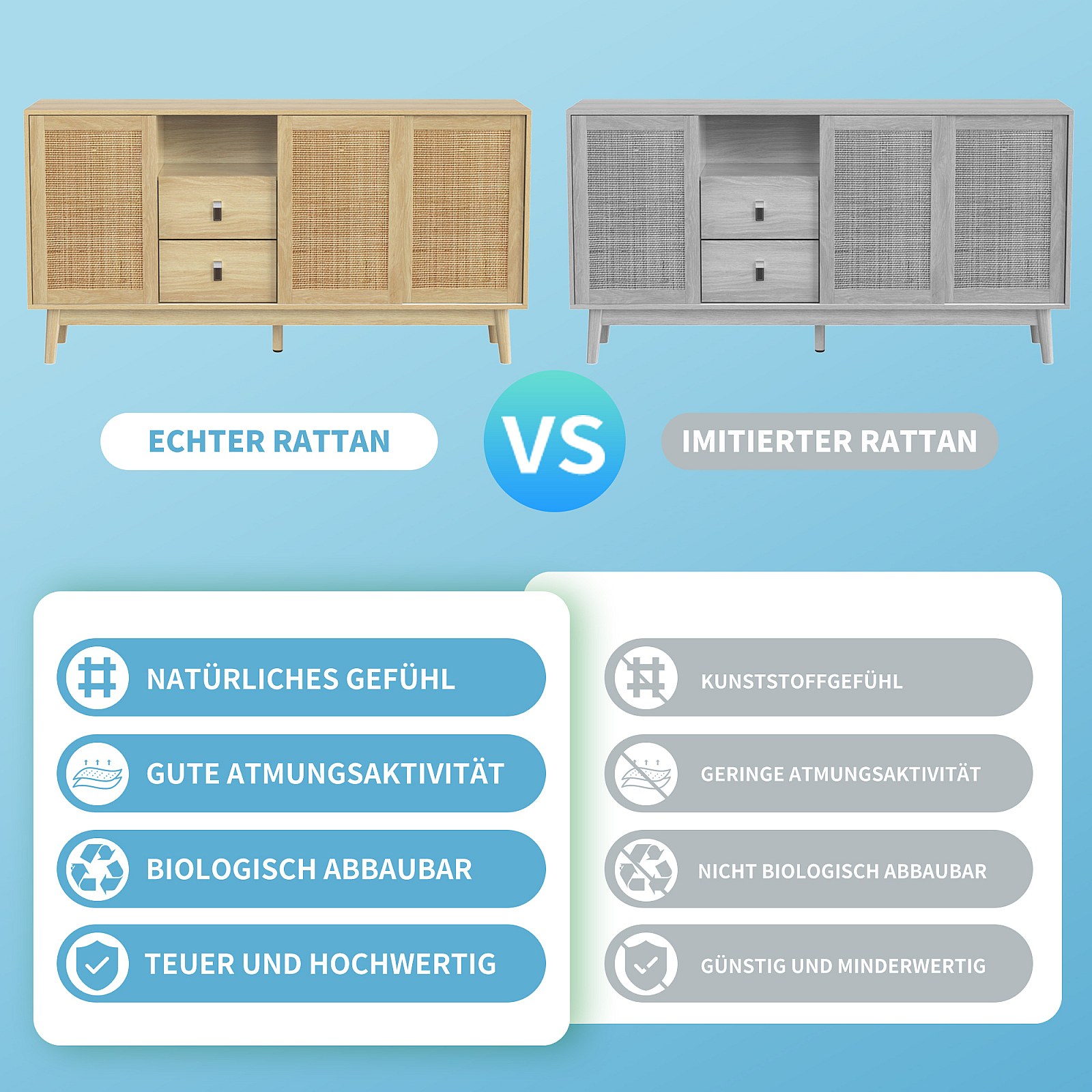 Echte rotan dressoir, drie schuifdeuren, twee lades, ademend en stabiel, veelzijdig, ideaal voor woonkamer, eetkamer en slaapkamer