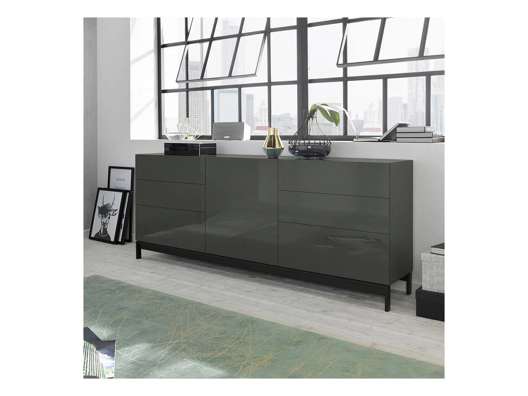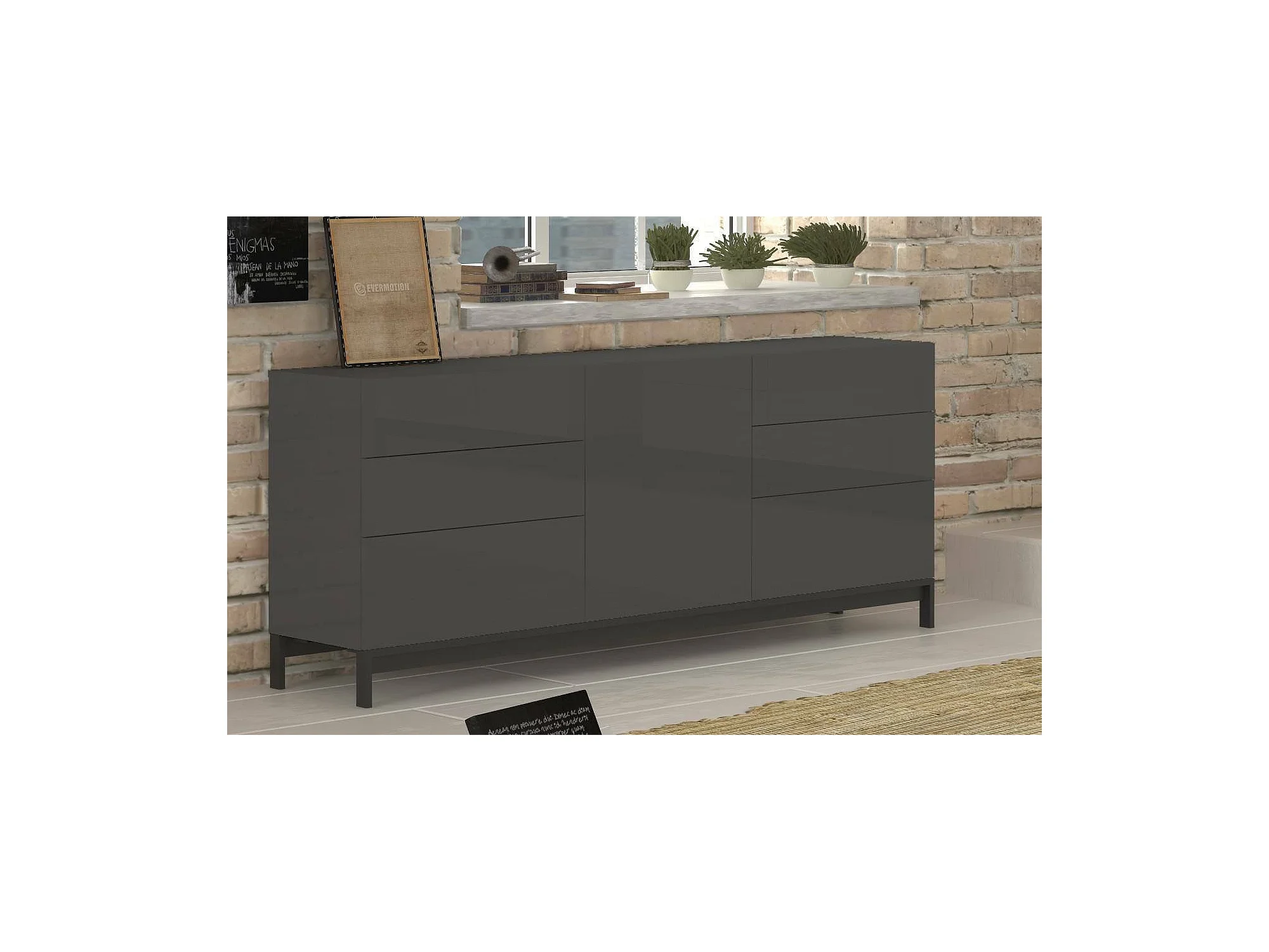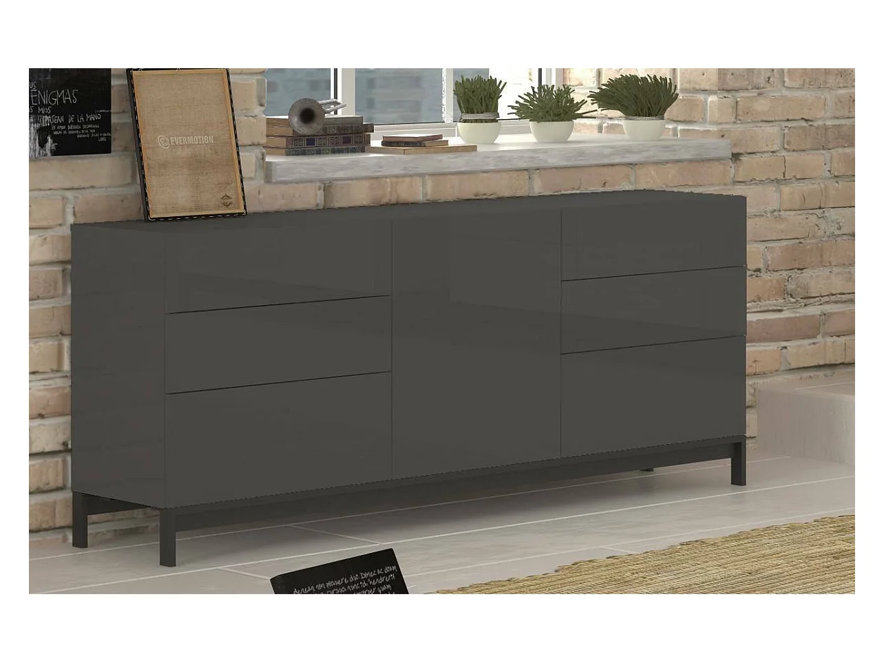 Edi dressoir, Keukendressoir met 1 deur en 6 laden, Woonkamerbuffet, Keukendressoir, 100% Made in Italy, 170x40h47 cm, Glanzend Antraciet