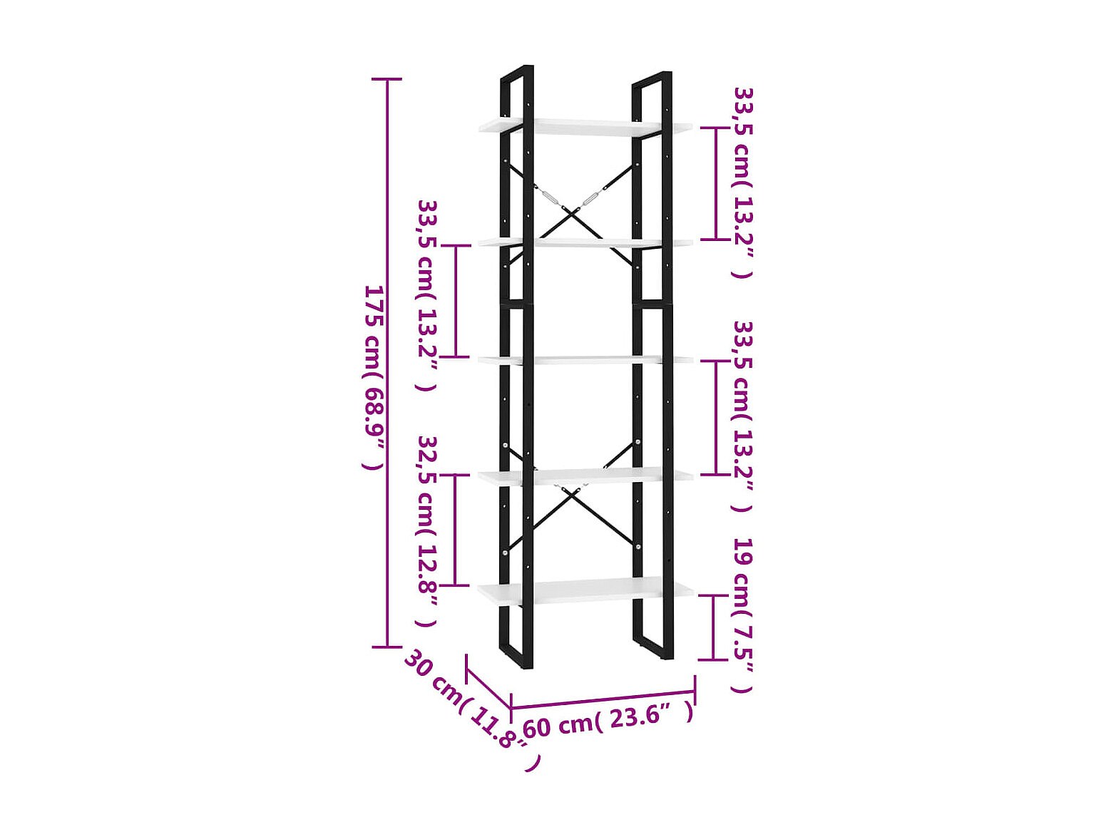 Edith Boekenkast met 5 schappen 60x30x175 cm bewerkt hout wit